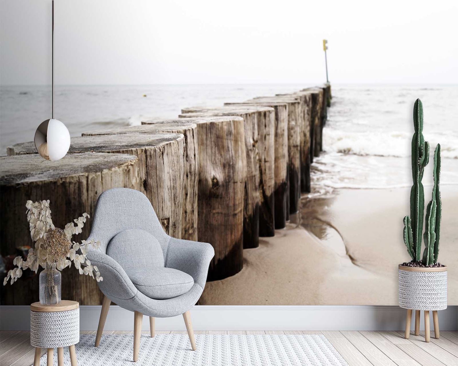 Productinformatie "Rechthoekig behang gedrukt op canvas met grijze afwerking aan de kustpier"