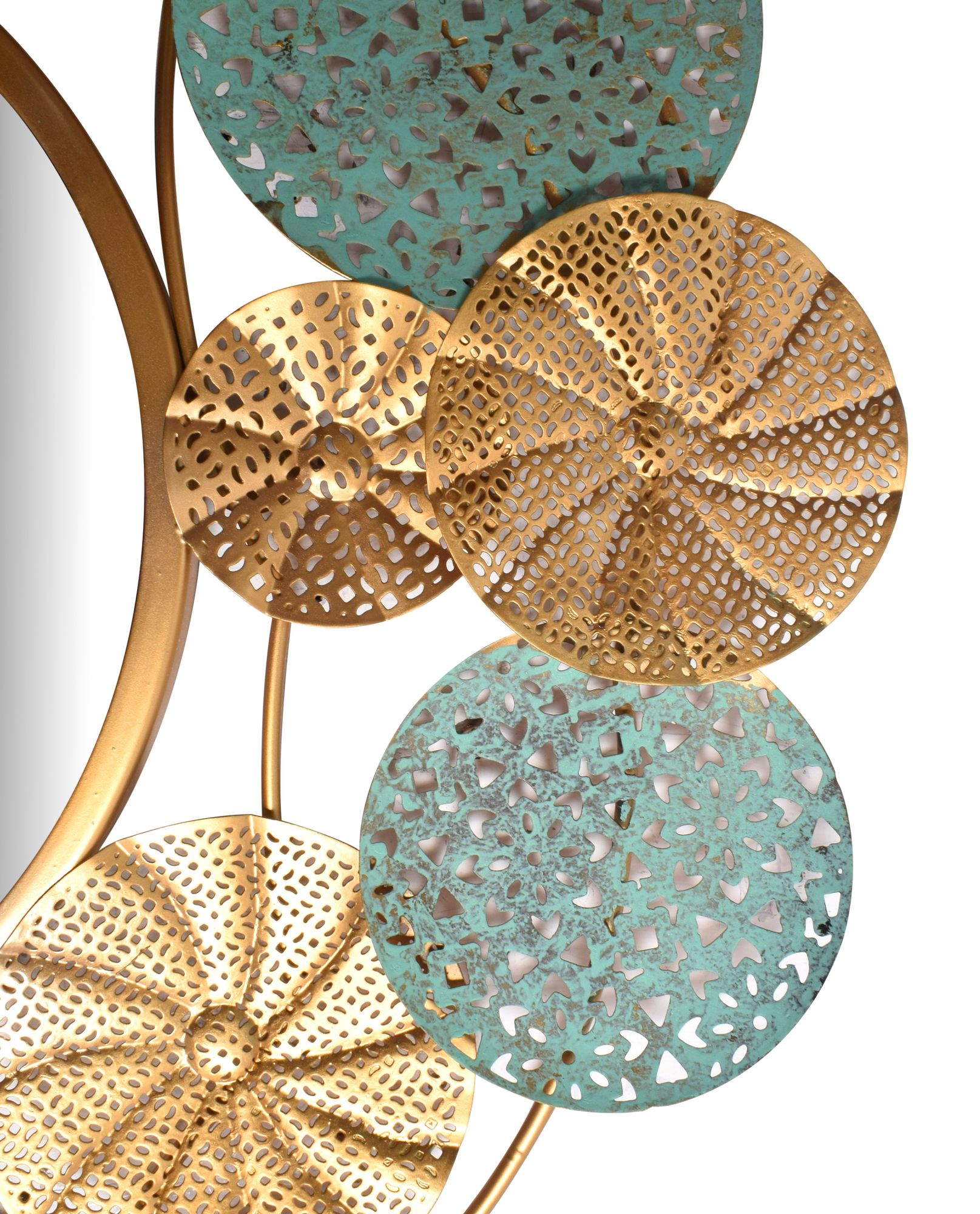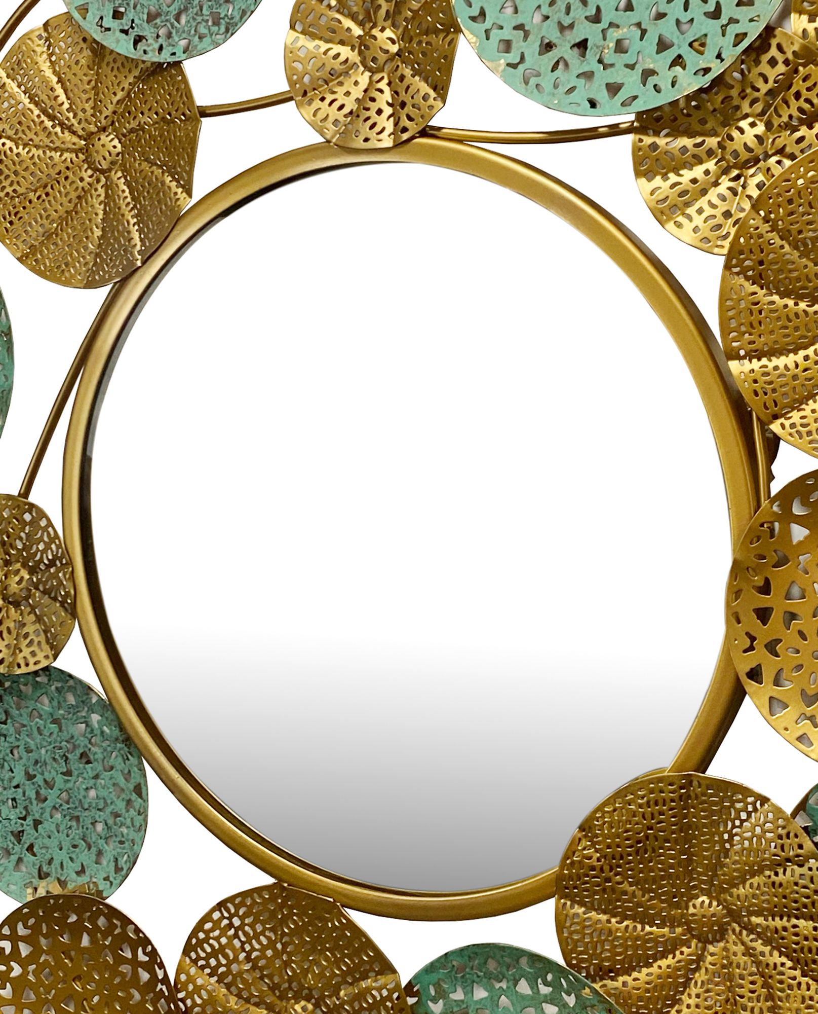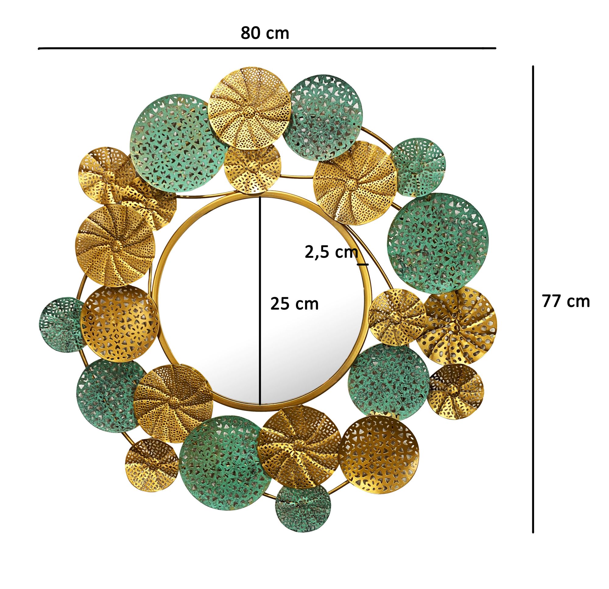 Kies voor een gedurfde stijl met deze ronde wandspiegel van 80x77 cm, met een glazen diameter van 25 cm en een gelakt ijzeren frame in goud en groene patina. Handgemaakt voor een artistieke uitstraling.