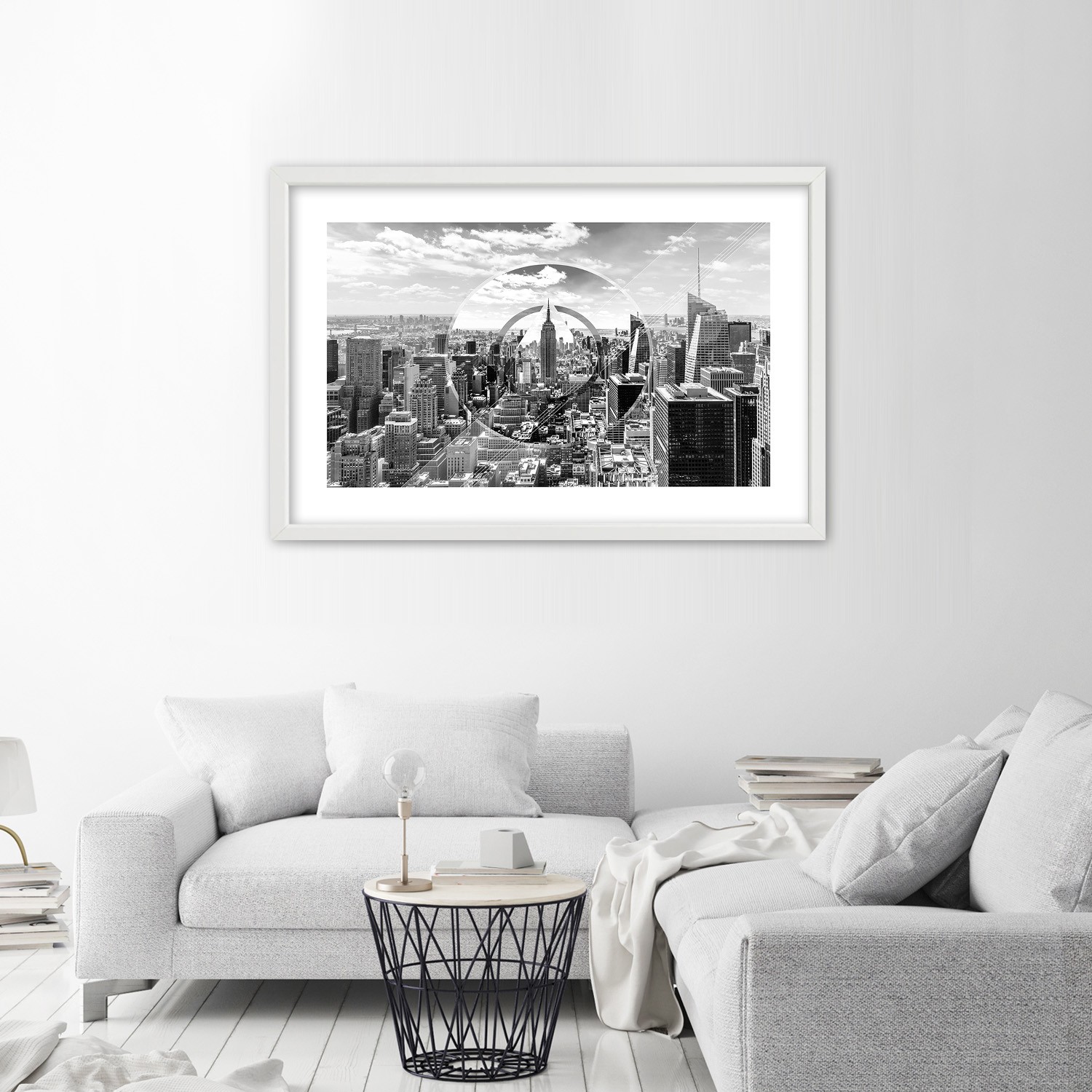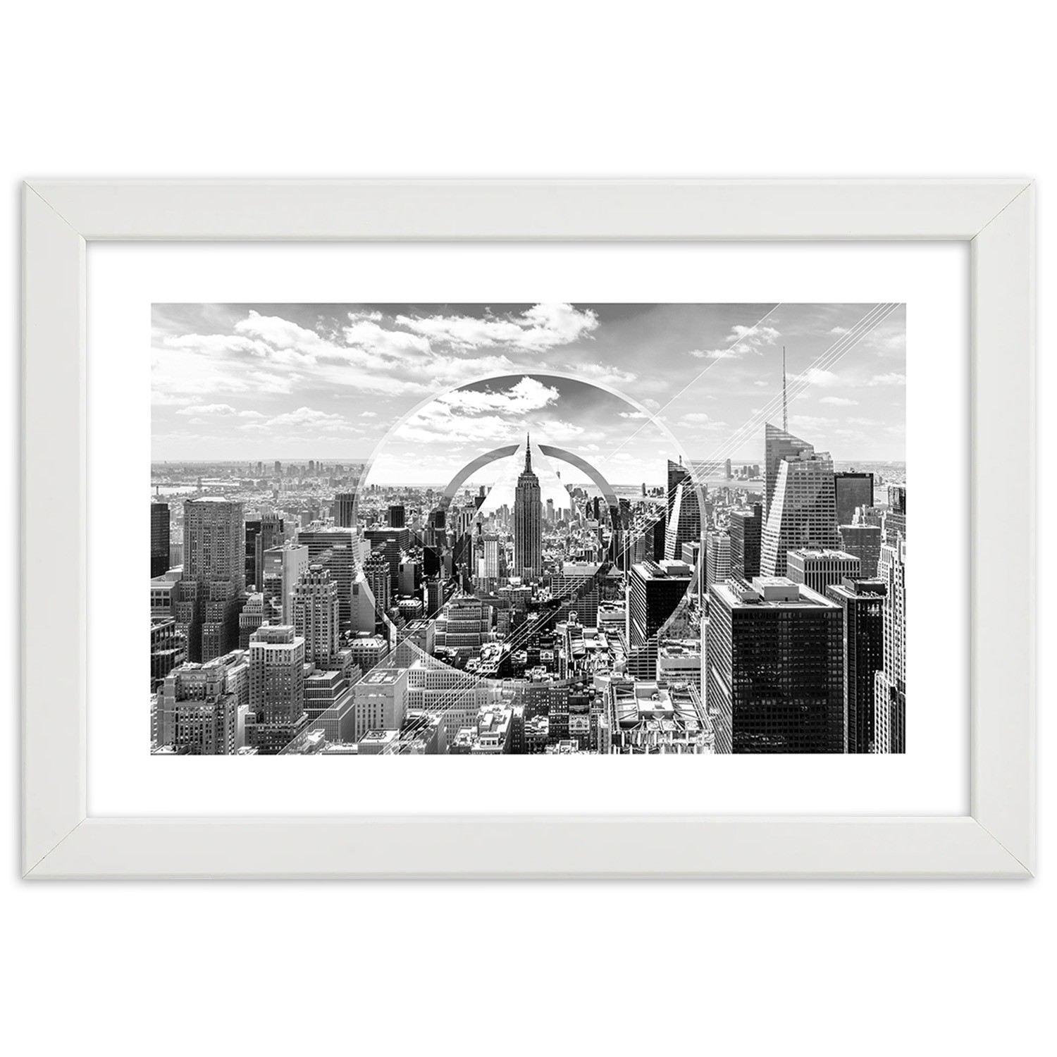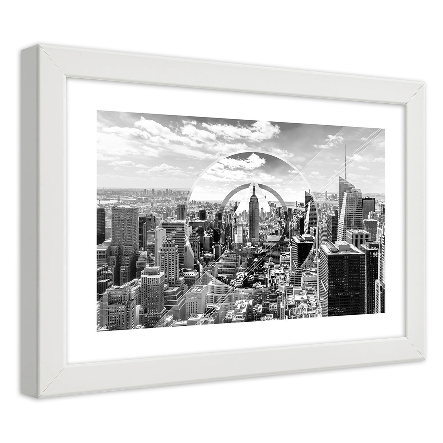 Productinformatie "Frame met afbeelding van uitzicht op wolkenkrabbers gedrukt op wit en zwart satijnpapier met houten frame"