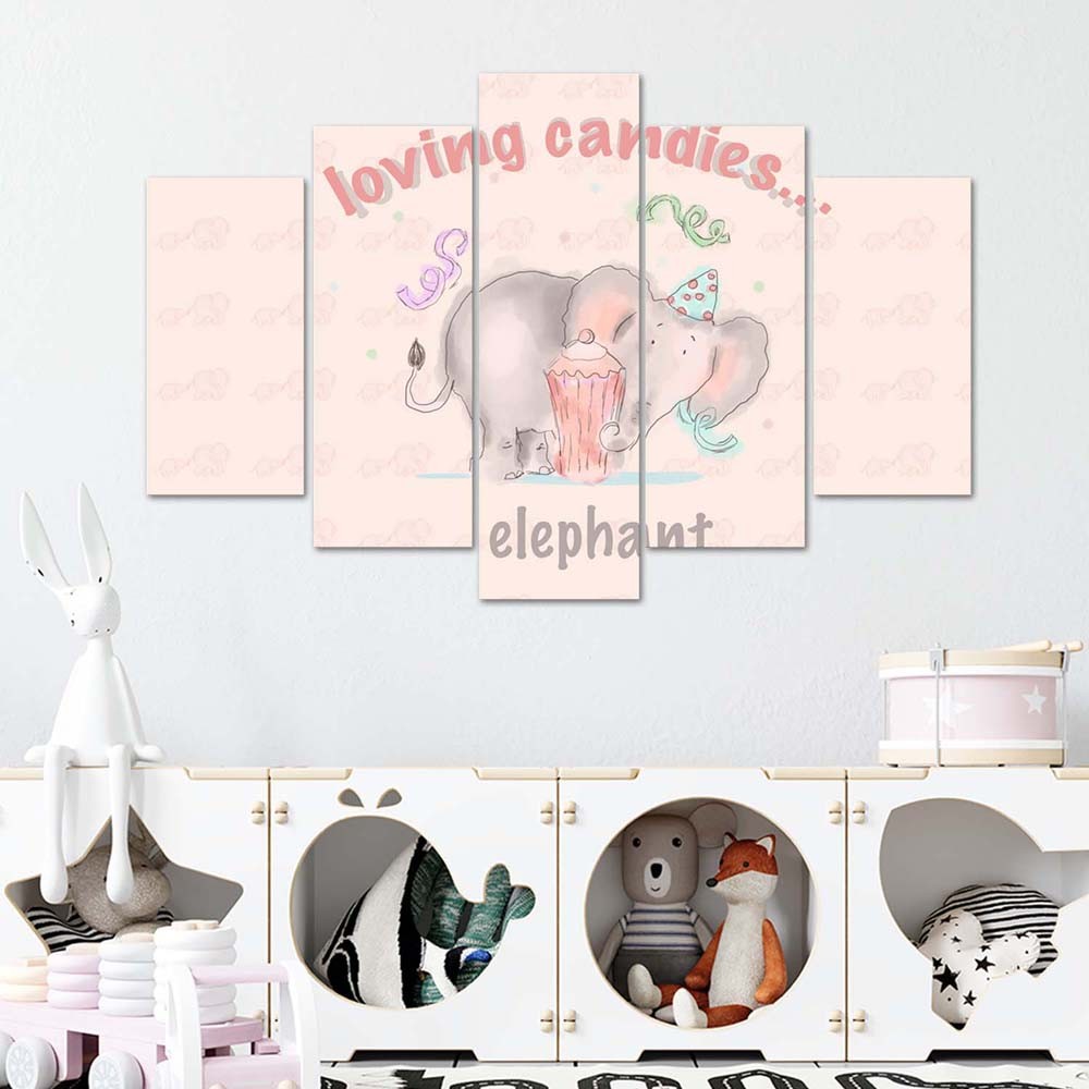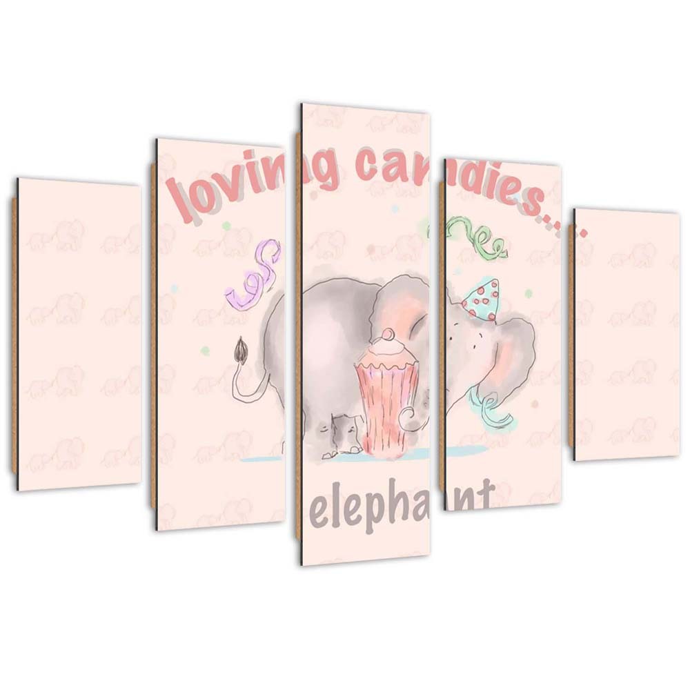 Productinformatie "Frame van vijf panelen gedrukt op hdf-kaderpapier olifant die van snoep houdt"