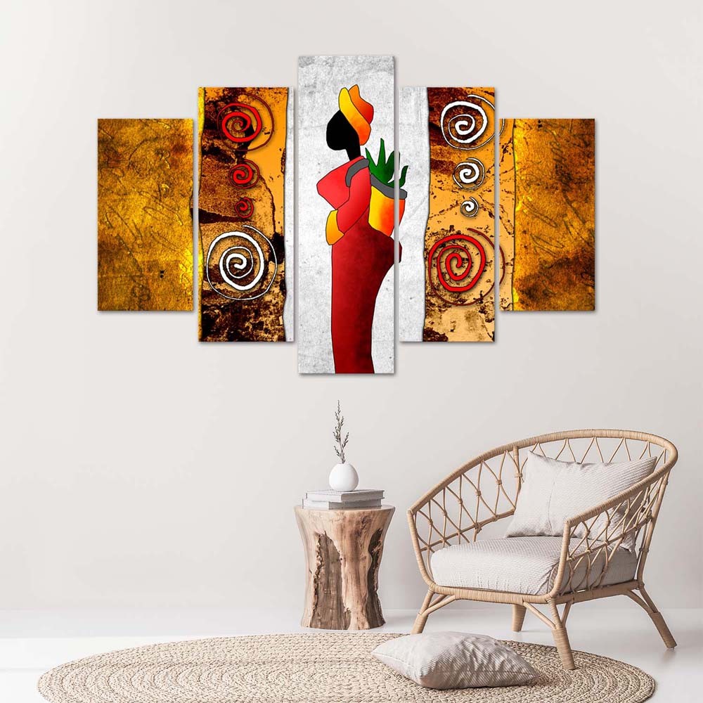 Beschrijving en kenmerken - HDF-frame van vijf panelen met illustratie van Afrikaanse vrouw gedrukt op veelkleurig papier