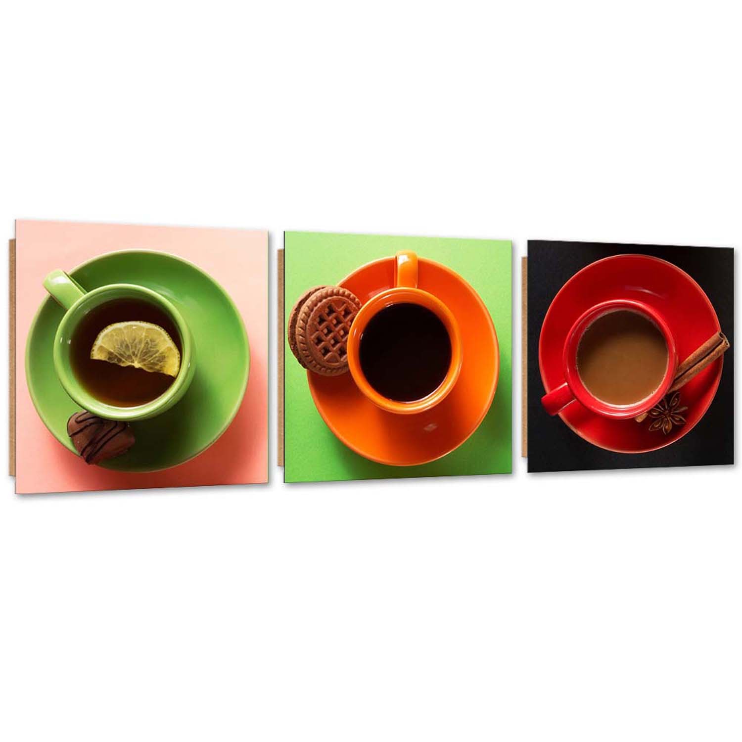 - Set van drie frames met afbeelding "gekleurde koffiekopjes" in canvas en MDF (vezel met gemiddelde dichtheid).