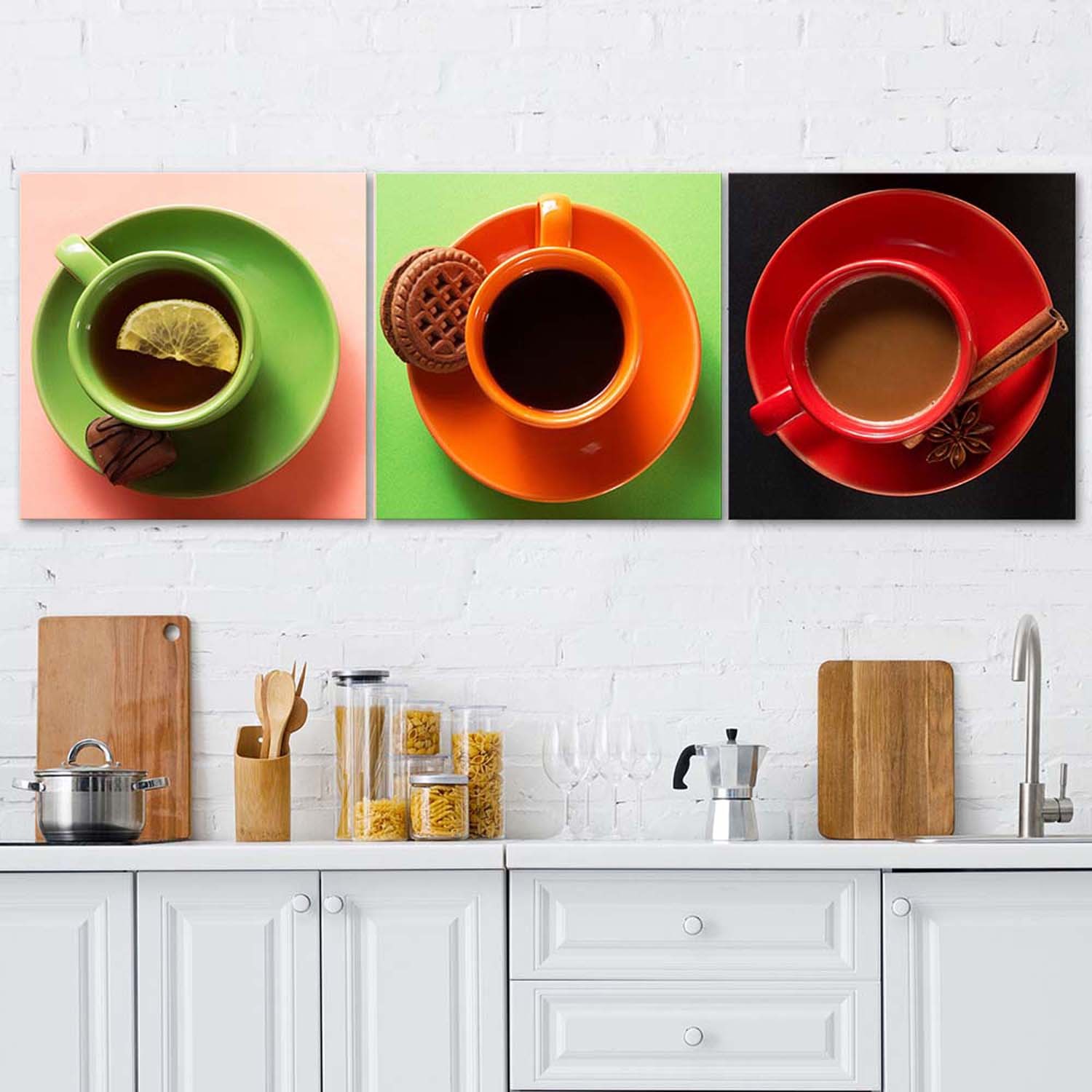 Omschrijving en kenmerken - Set decoratieve canvas en MDF paneelframes met afbeelding van gekleurde koffiekopjes