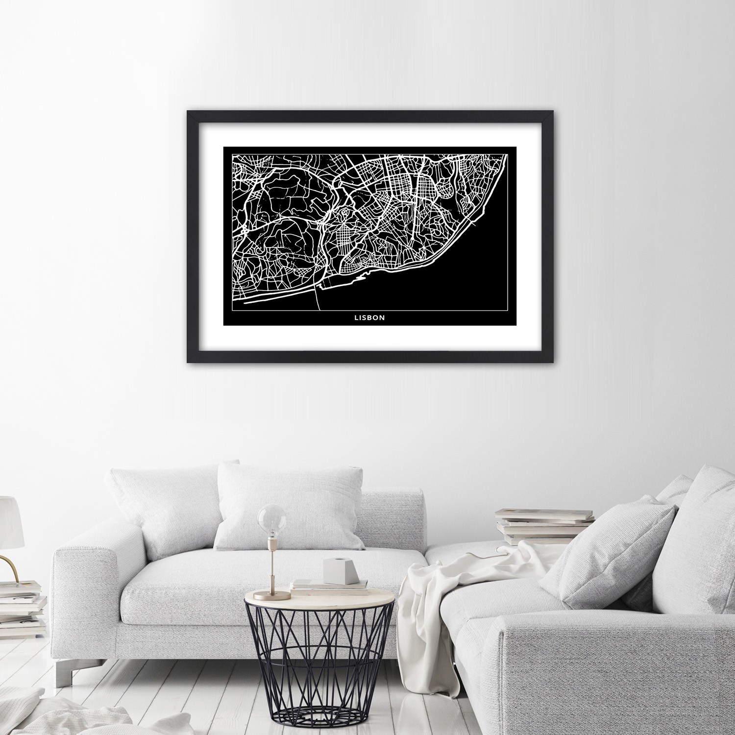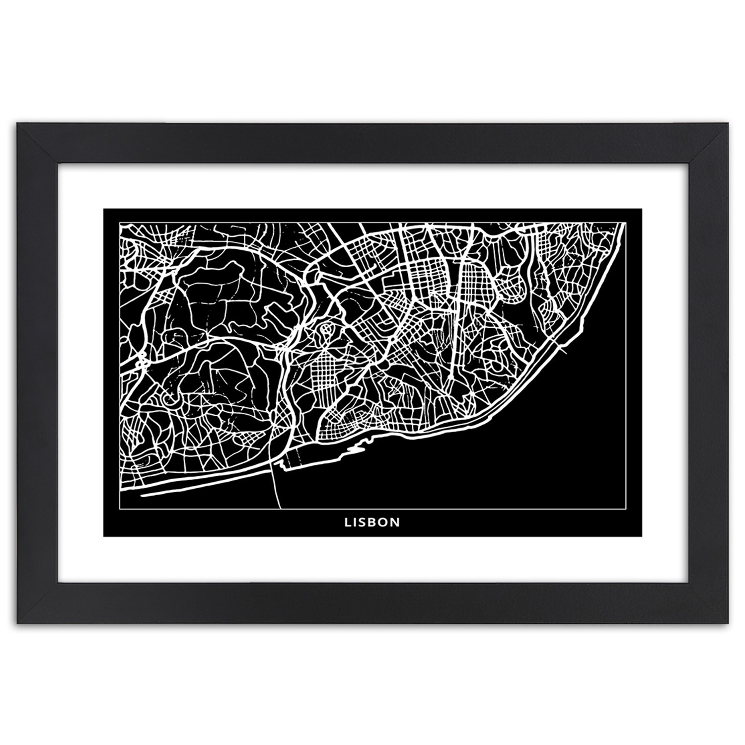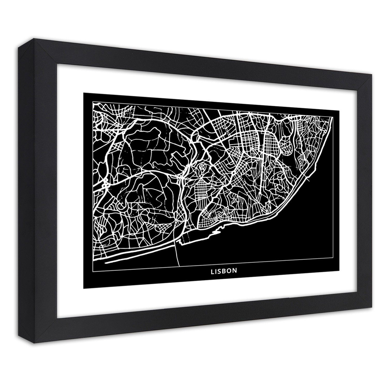 Zwart-wit canvas bedrukt frame van mdf bestaande uit een stukje kaart van lissabon