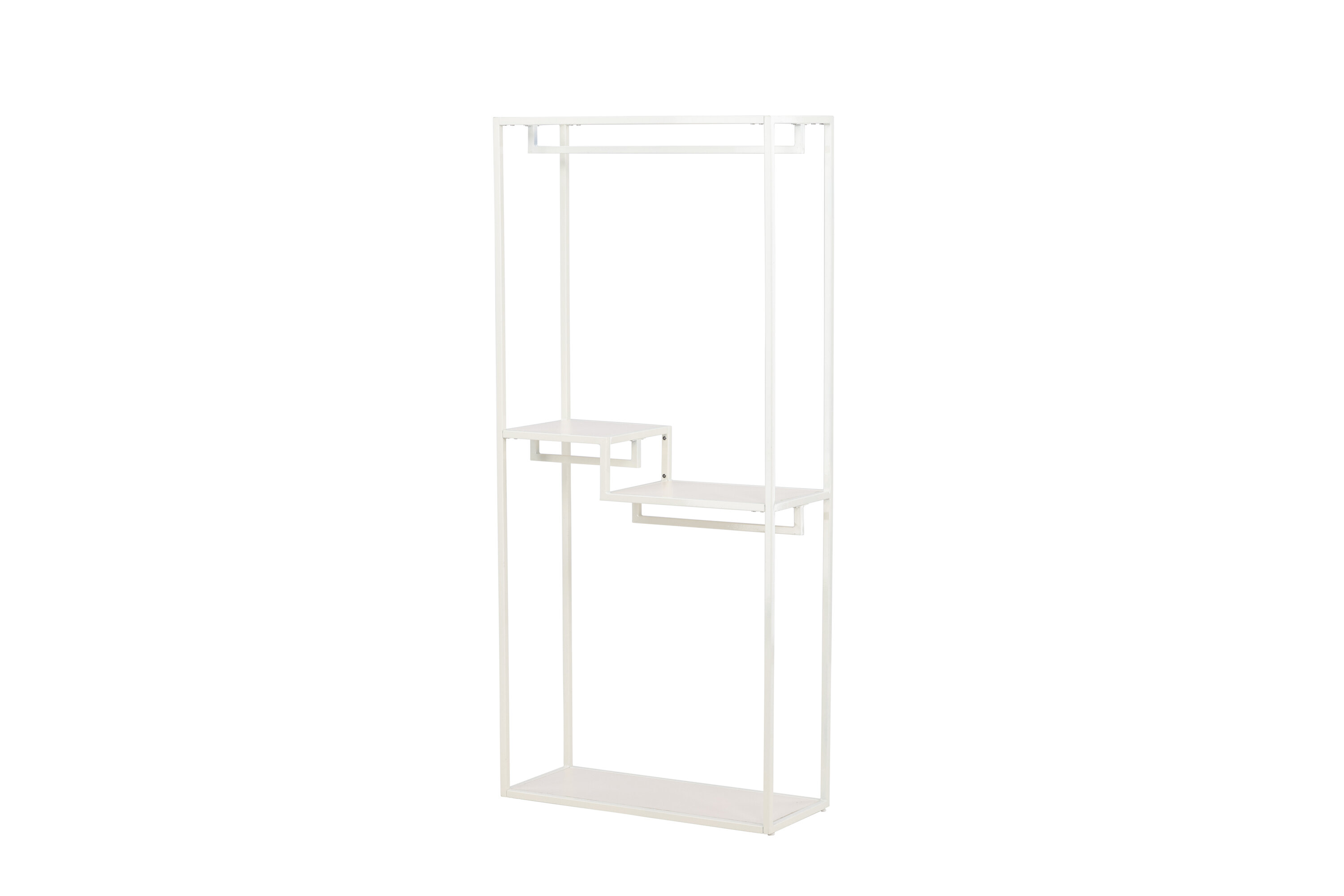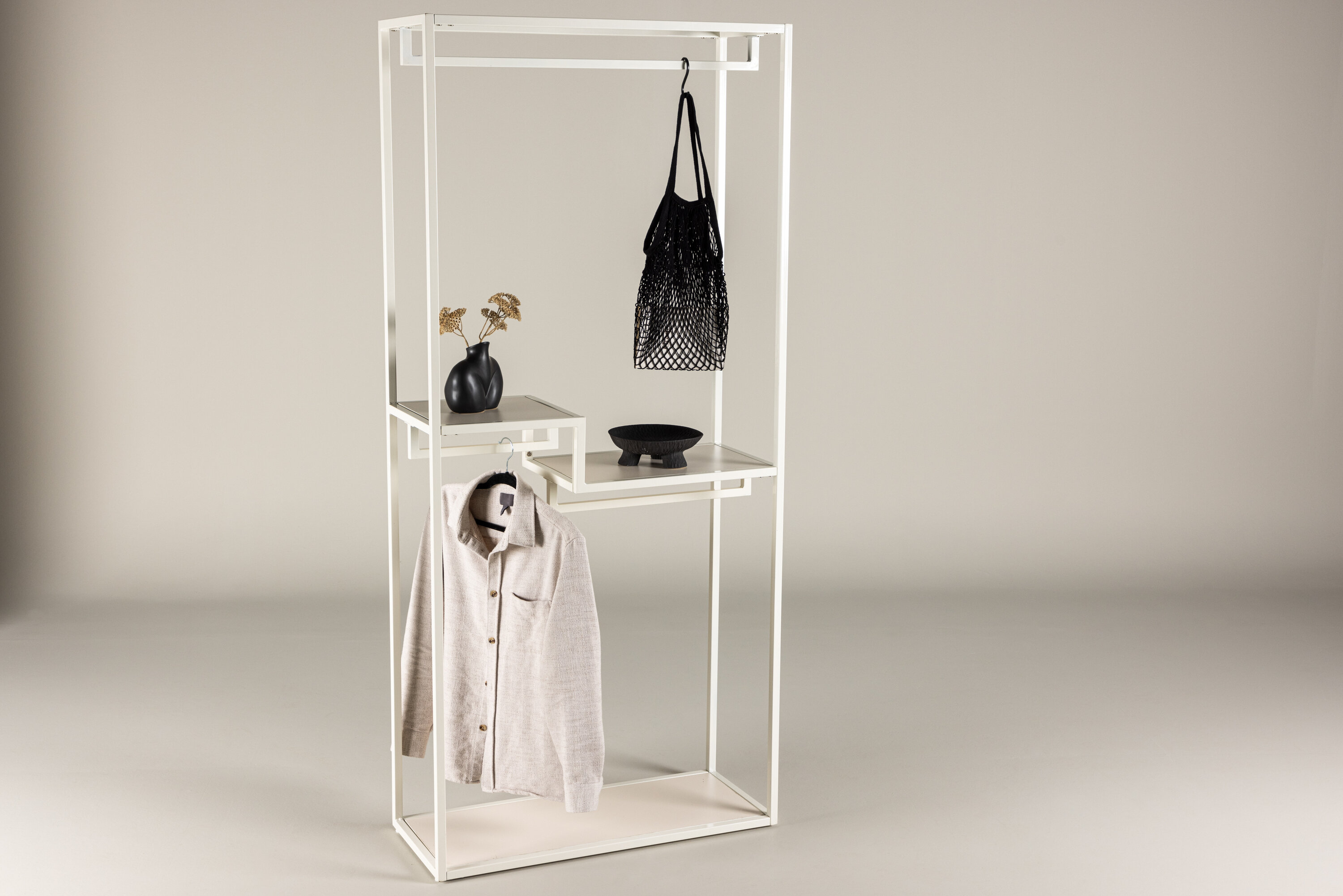 Ce qui rend Staal unique, ce sont ses étagères intelligentes. Deux étagères plus petites vous donnent la possibilité de ranger des bijoux, des vêtements pliés ou d'autres petits accessoires, tandis que l'étagère plus grande offre de l'espace pour les articles plus grands ou peut-être un élément décoratif. Et comme si cela ne suffisait pas - Staal offre également un espace pour les cintres, ce qui en fait une solution complète pour vos besoins de rangement de vêtements.