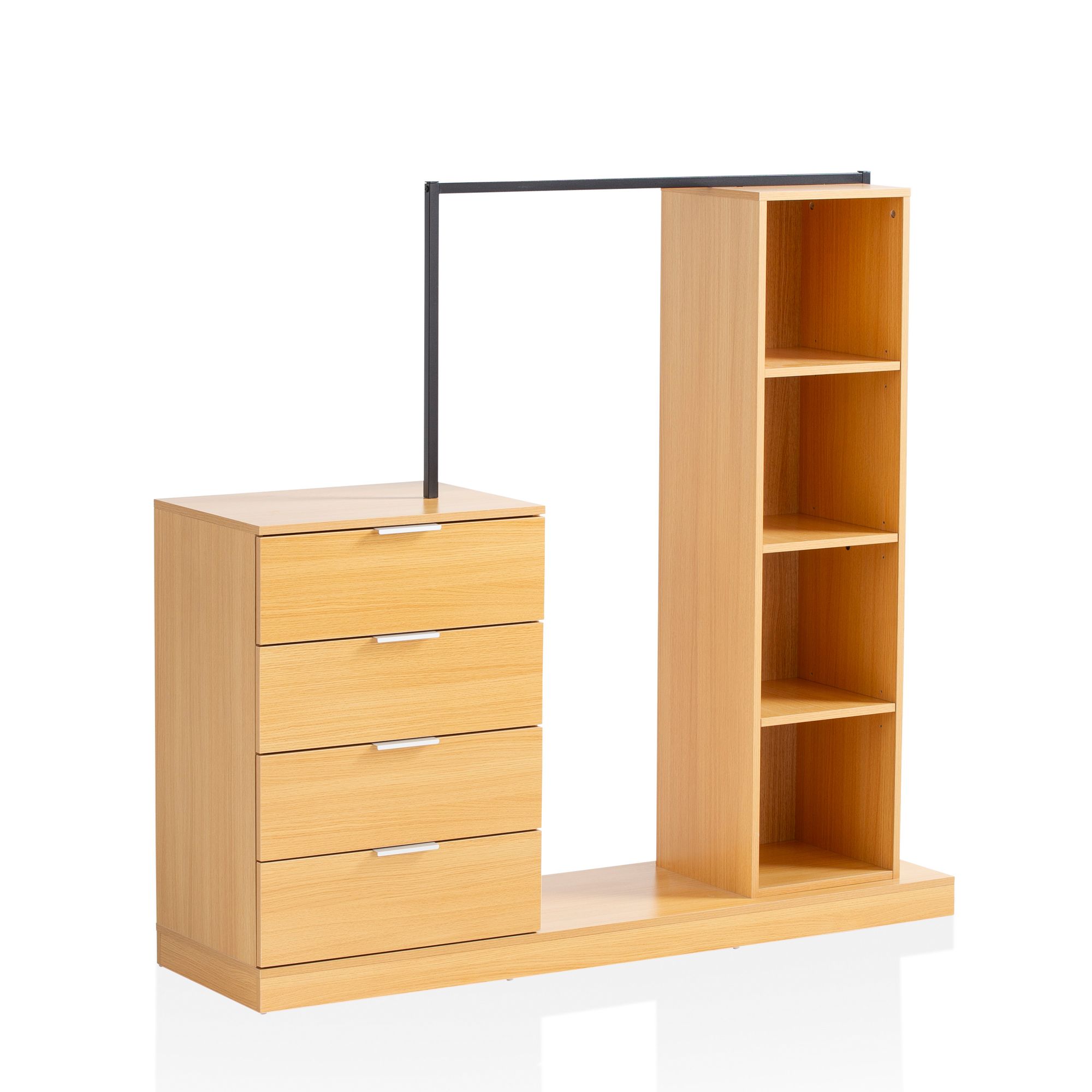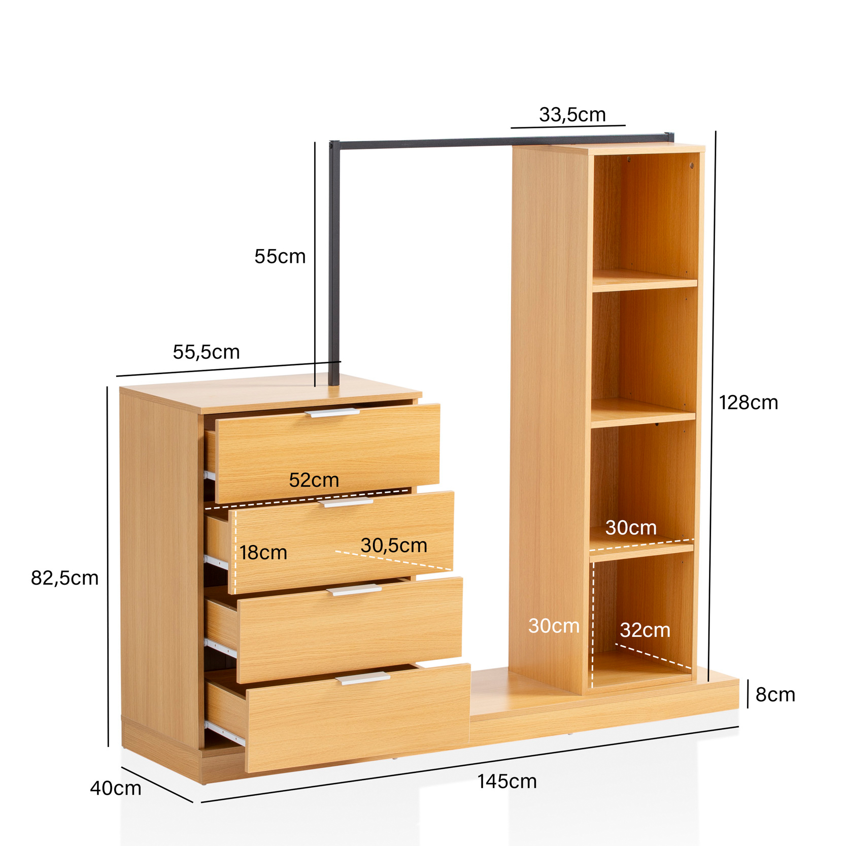 Cette garde-robe moderne en décor chêne allie élégance et fonctionnalité. Conçue pour optimiser l'espace du couloir, elle comprend une structure robuste équipée d'une tringle à vêtements, une commode à quatre tiroirs et des étagères réglables, idéales pour chaussures, vestes, écharpes et bonnets.
