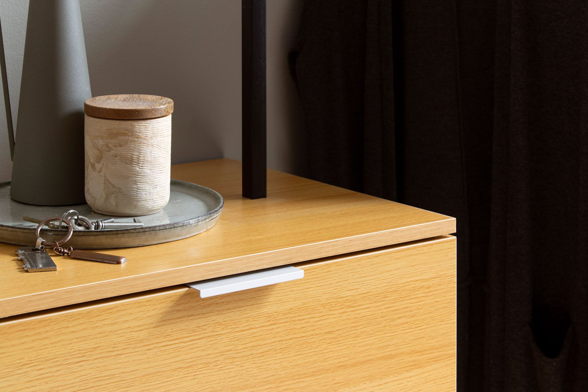 - Couleur : corps chêne clair, poignées argentées, tringle noire