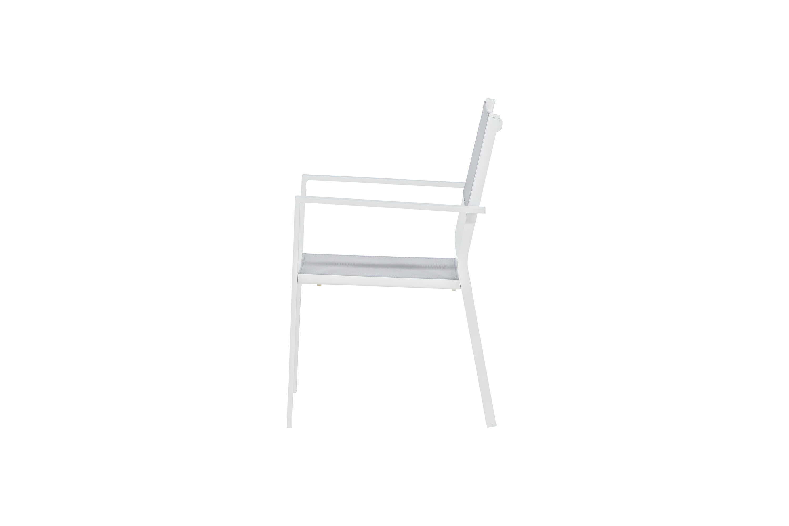 Copacabana dans son design industriel et élégant se fait excellent avec d'autres meubles d'extérieur. Sa construction blanche en aluminium et son siège gris en Textilene créent un joli accrocheur et vous donnent une chaise de salle à manger pratique qui dure dans le temps. Invitez à de nombreux moments de convivialité cet été ! La chaise est empilable.