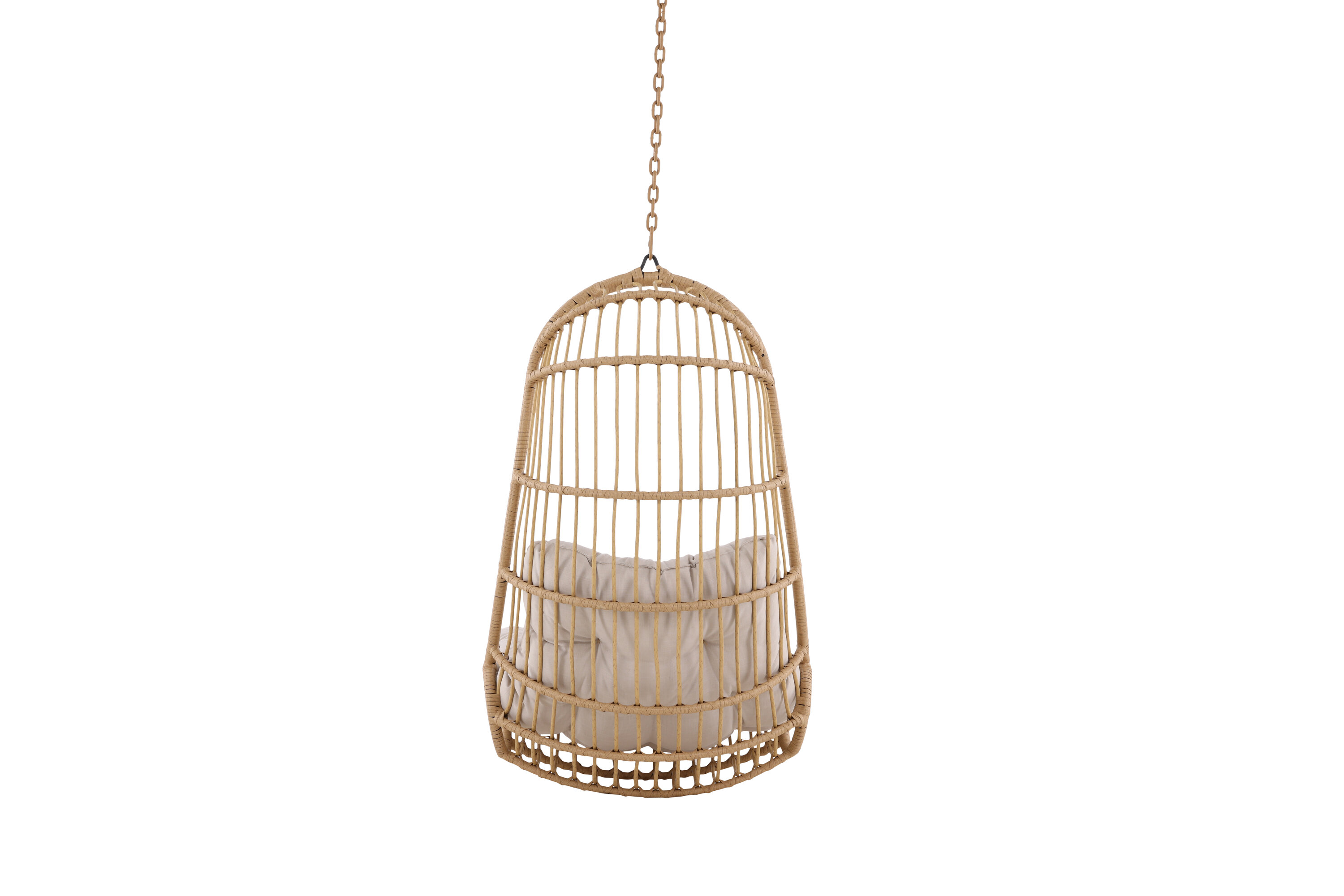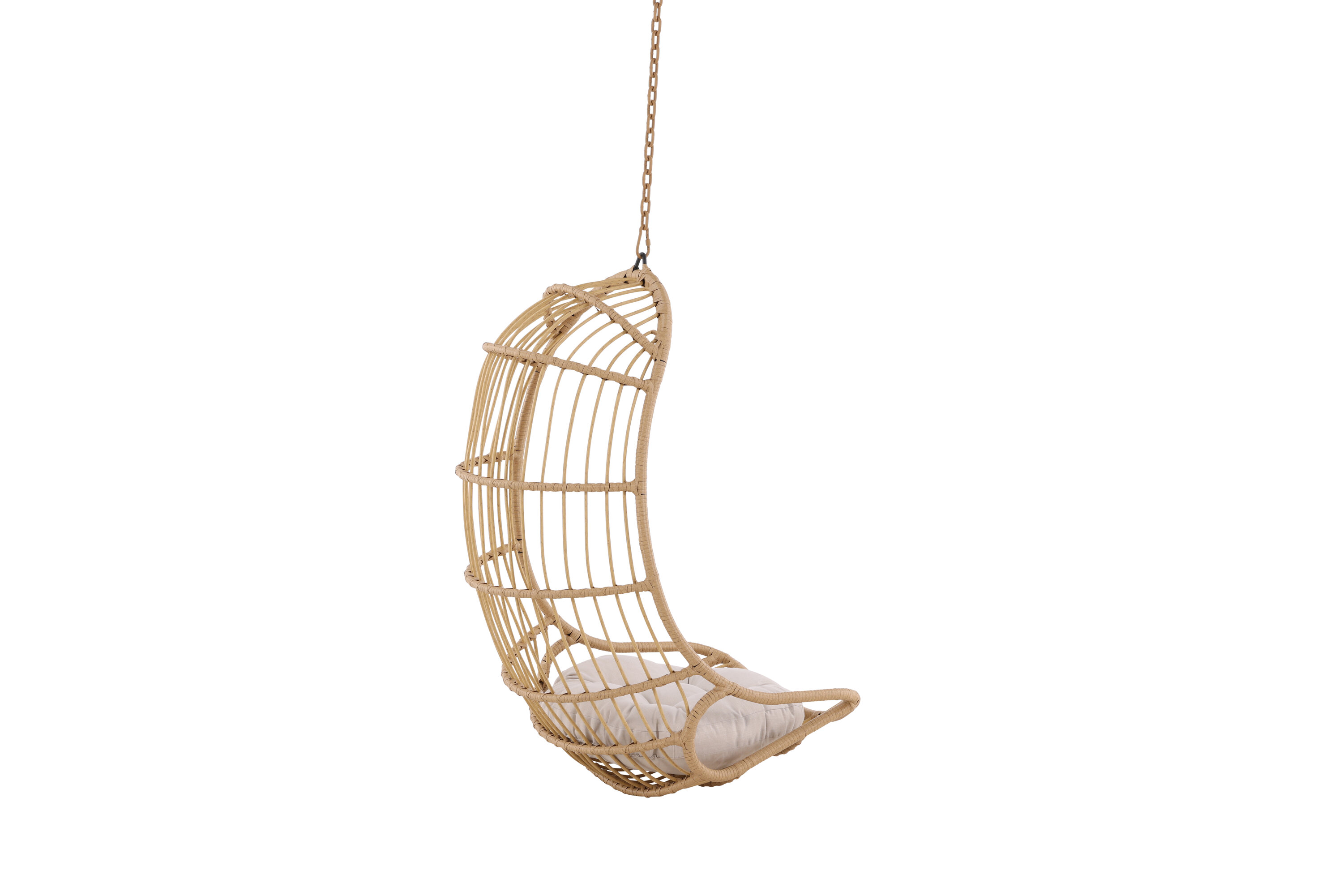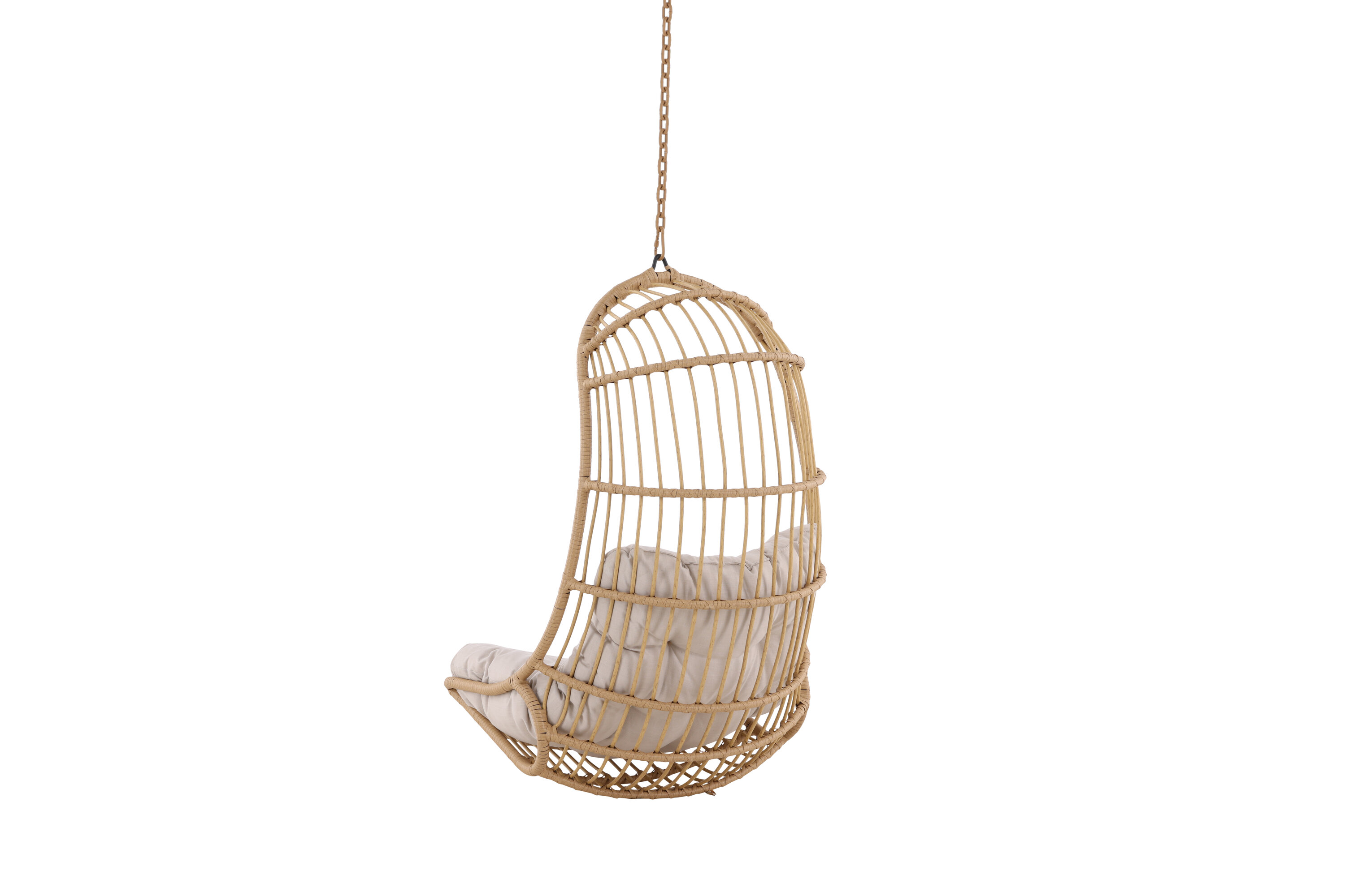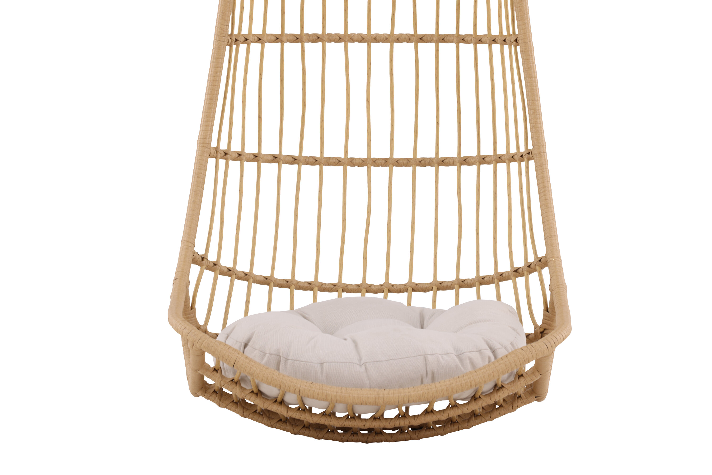 La chaise suspendue Pulau est en rotin synthétique avec un cadre en aluminium robuste. Sa couleur naturelle se fond parfaitement dans l'environnement extérieur, offrant un sentiment d'harmonie et de tranquillité.