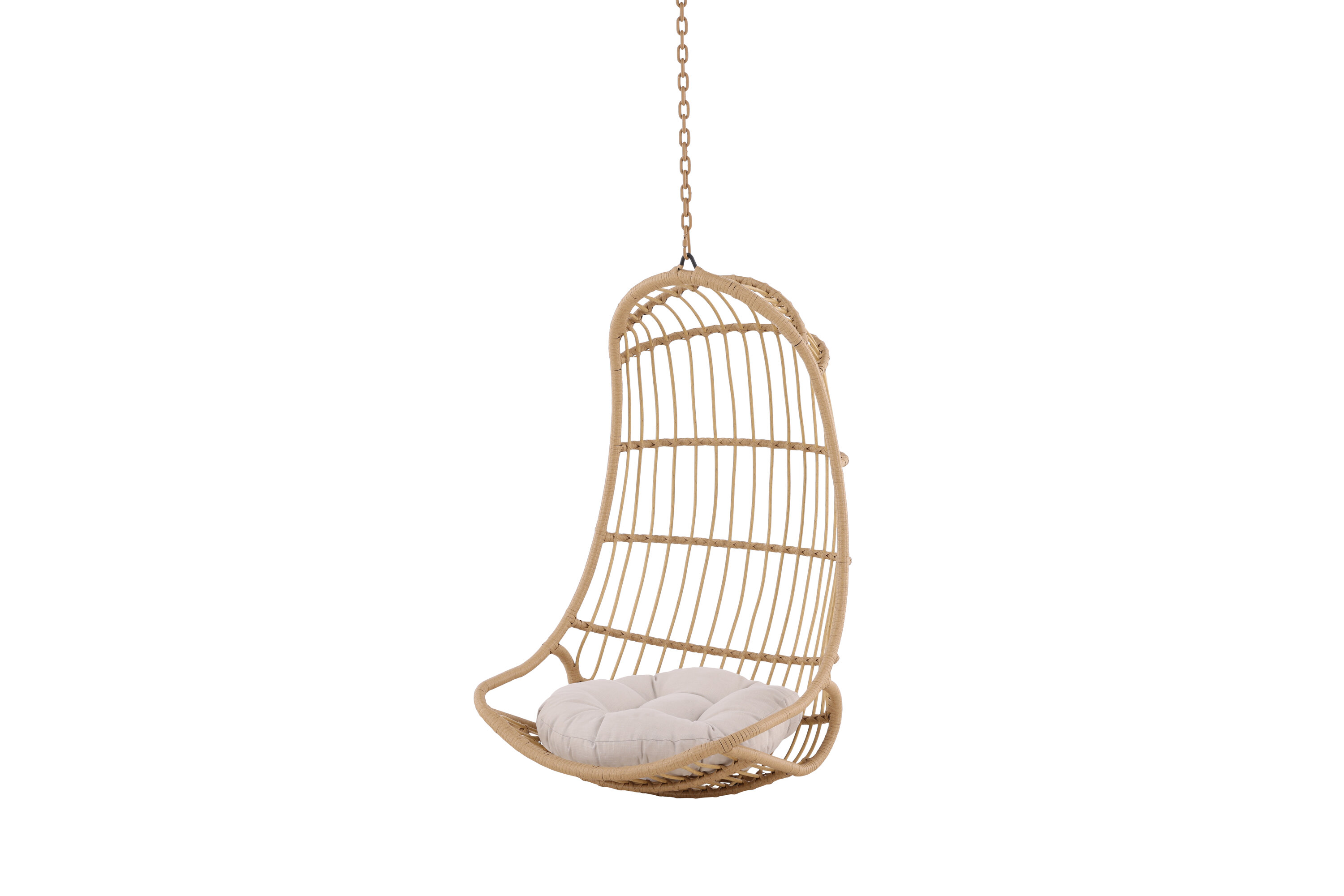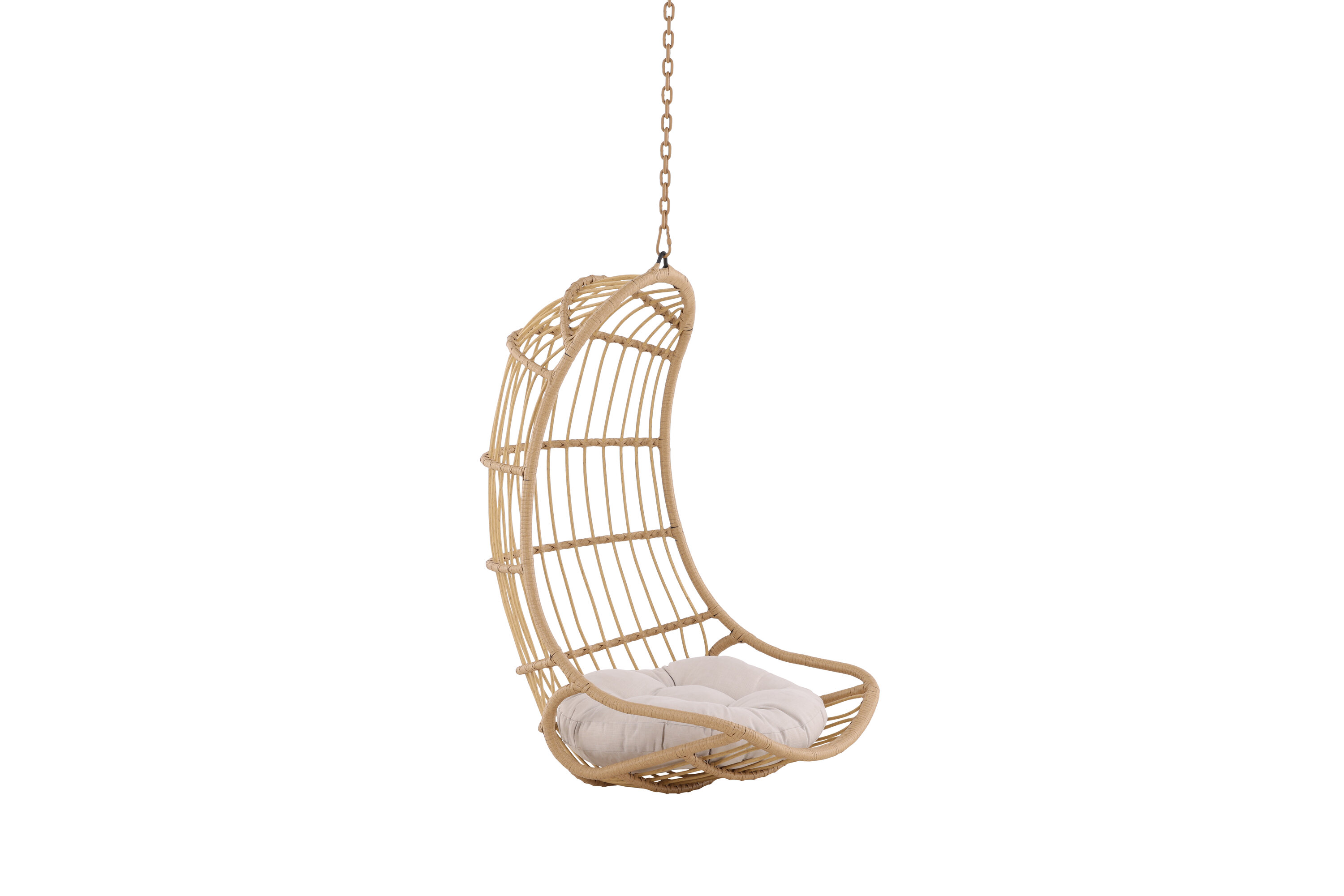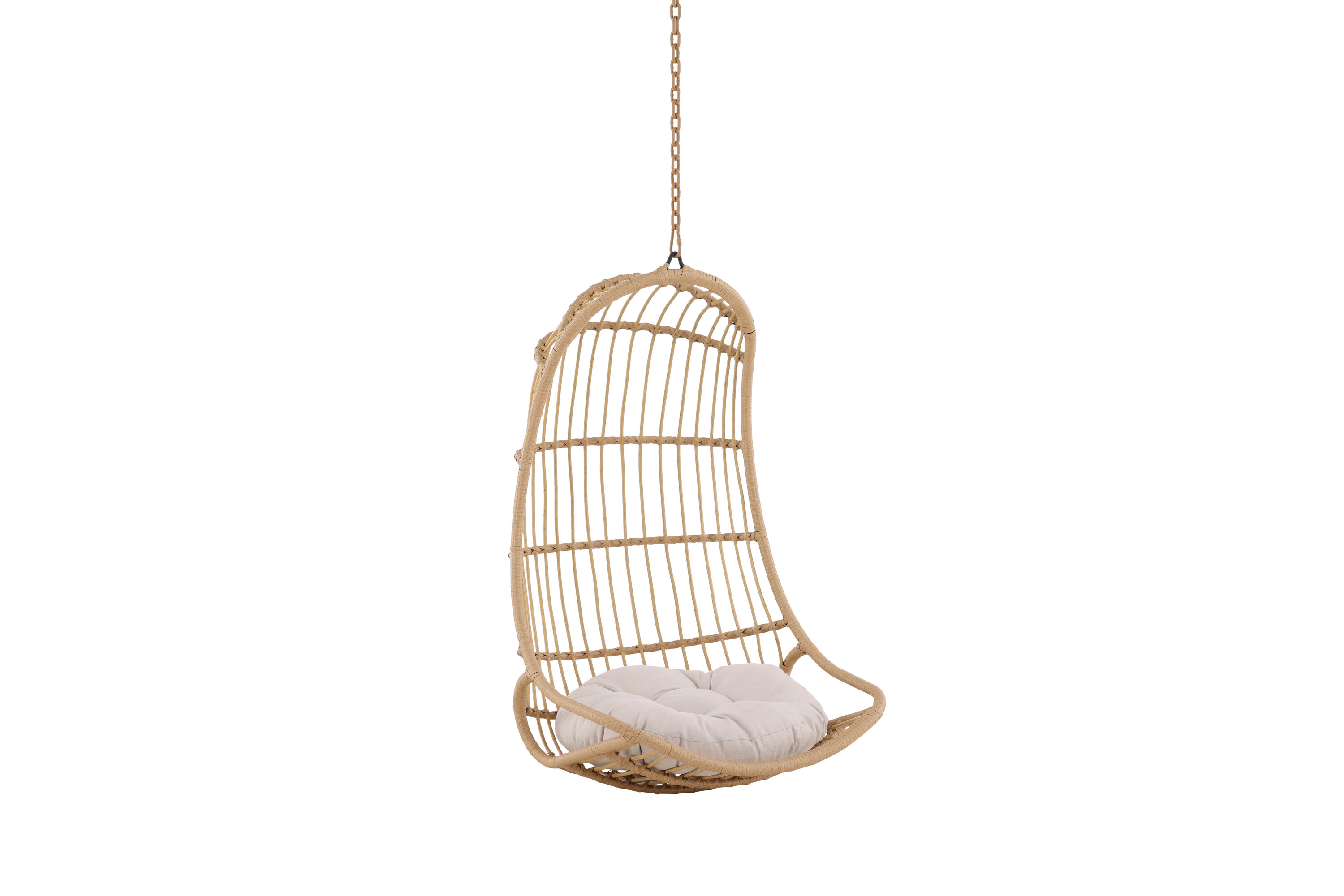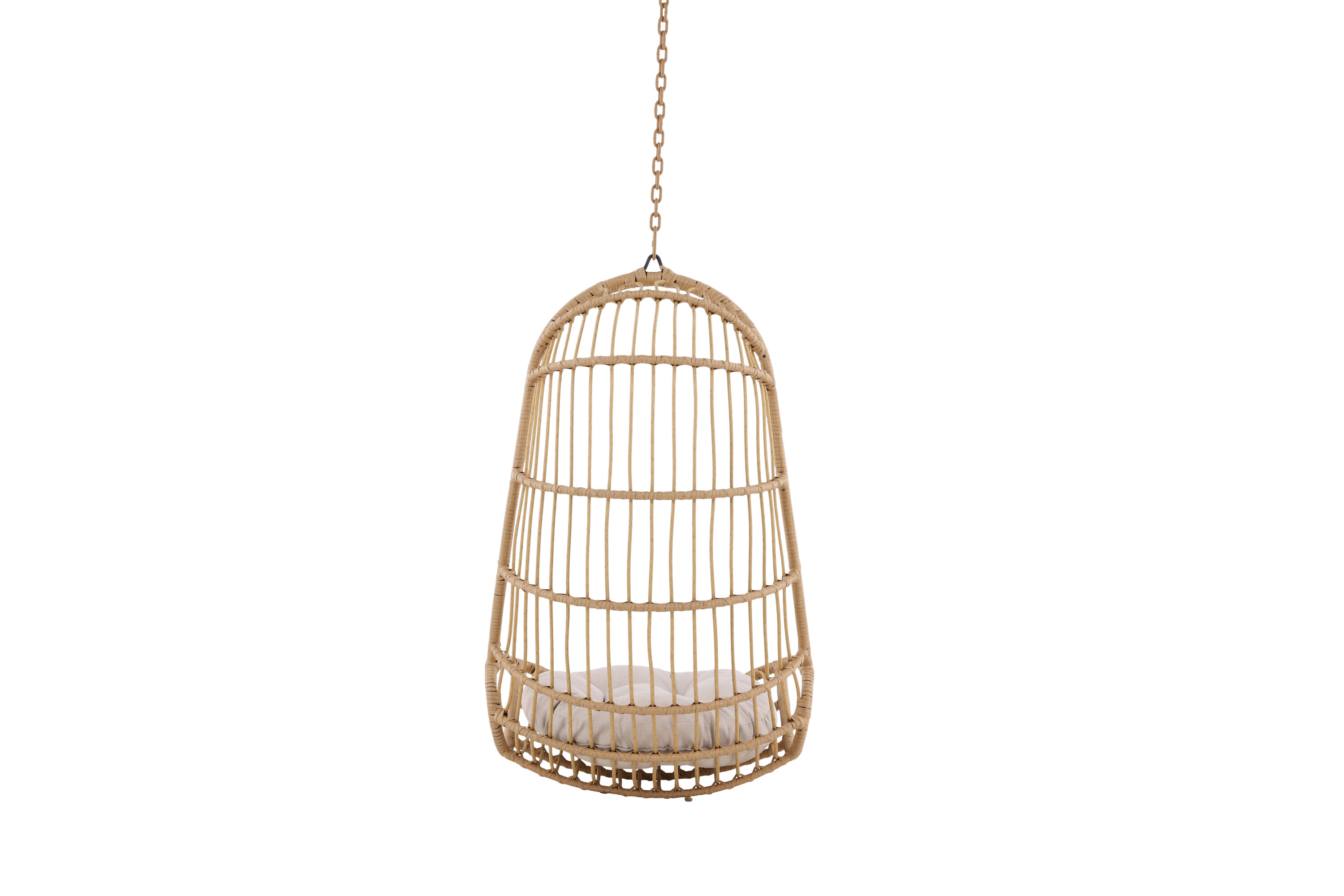 La chaise suspendue Pulau est en rotin synthétique avec un cadre en aluminium robuste. Sa couleur naturelle se fond parfaitement dans l'environnement extérieur, offrant un sentiment d'harmonie et de tranquillité.