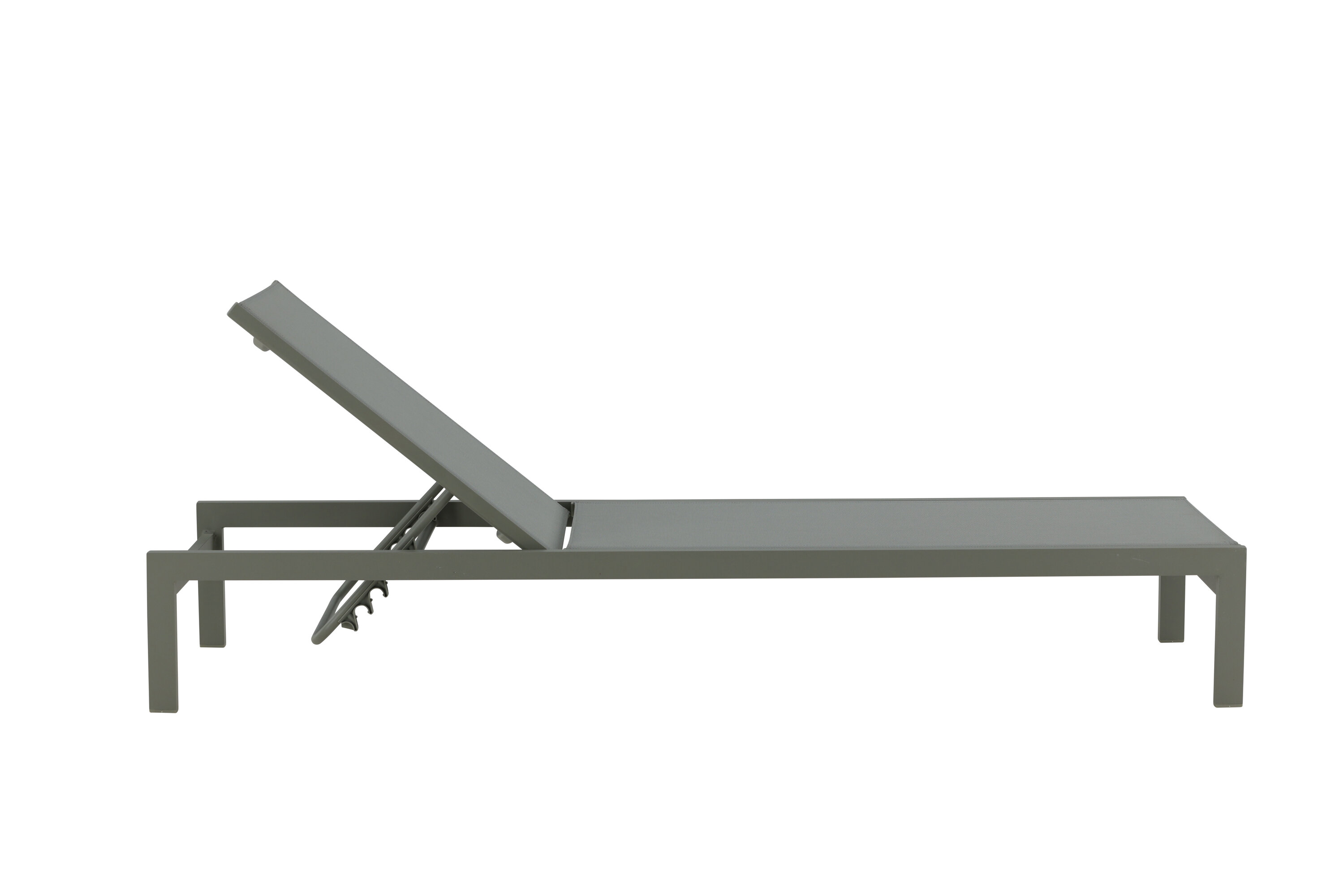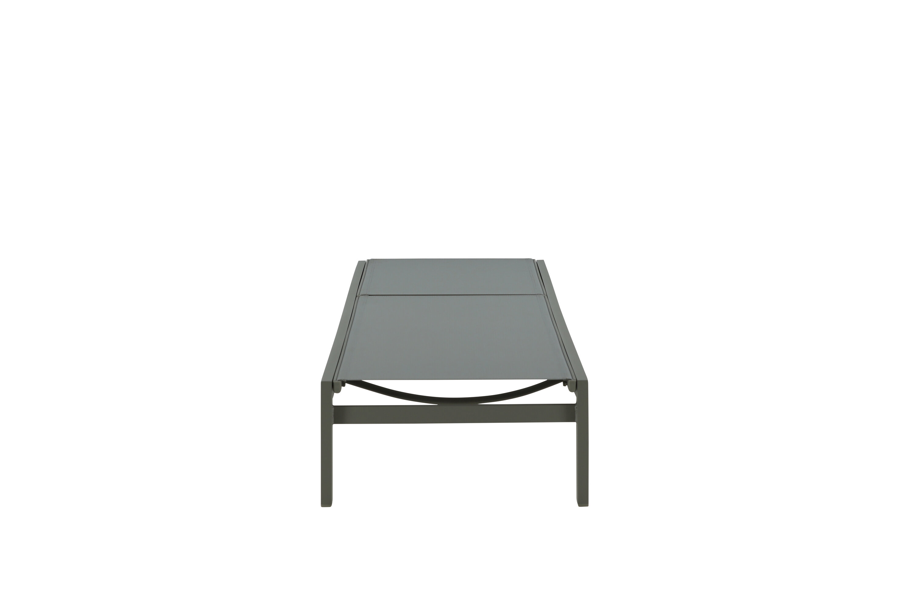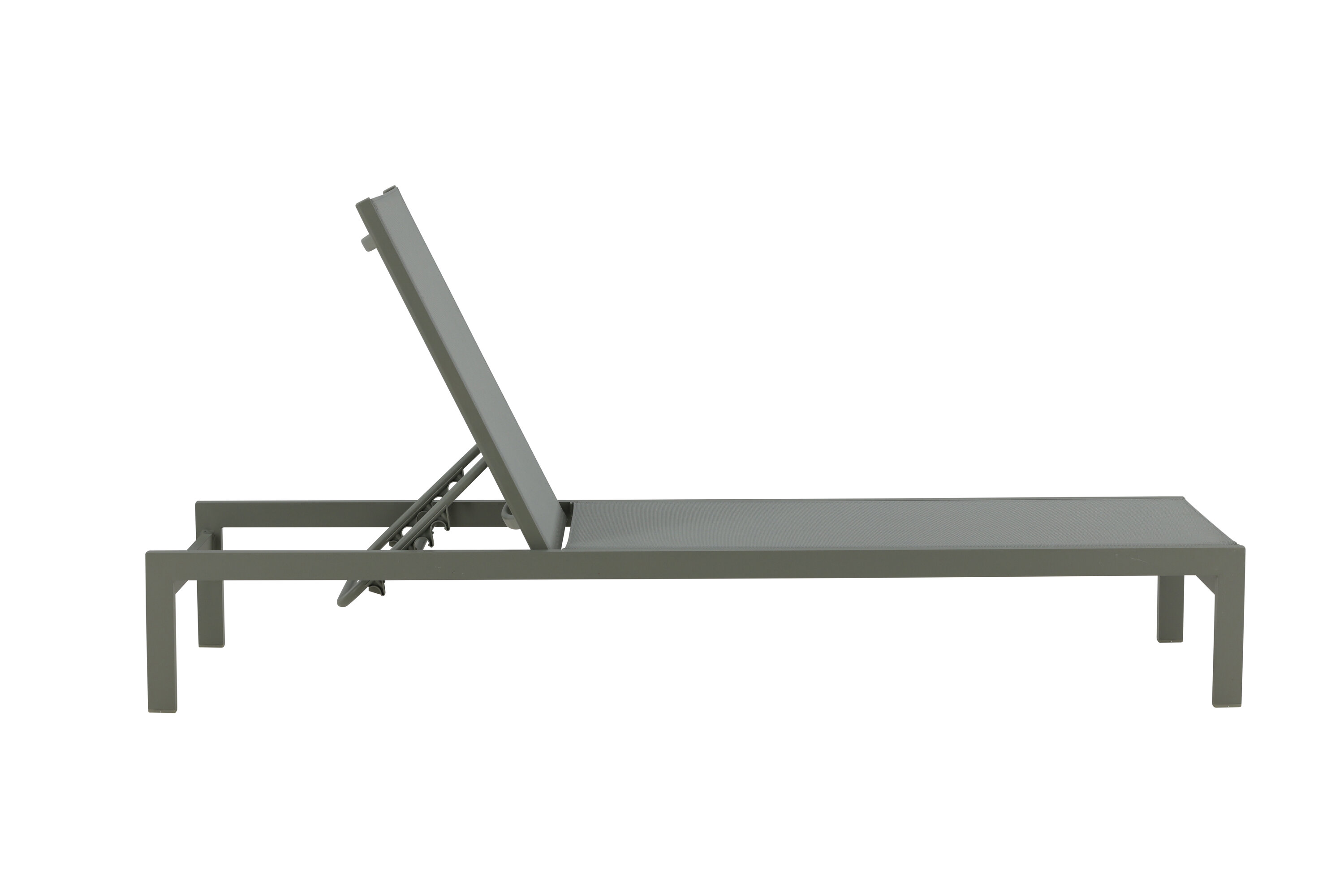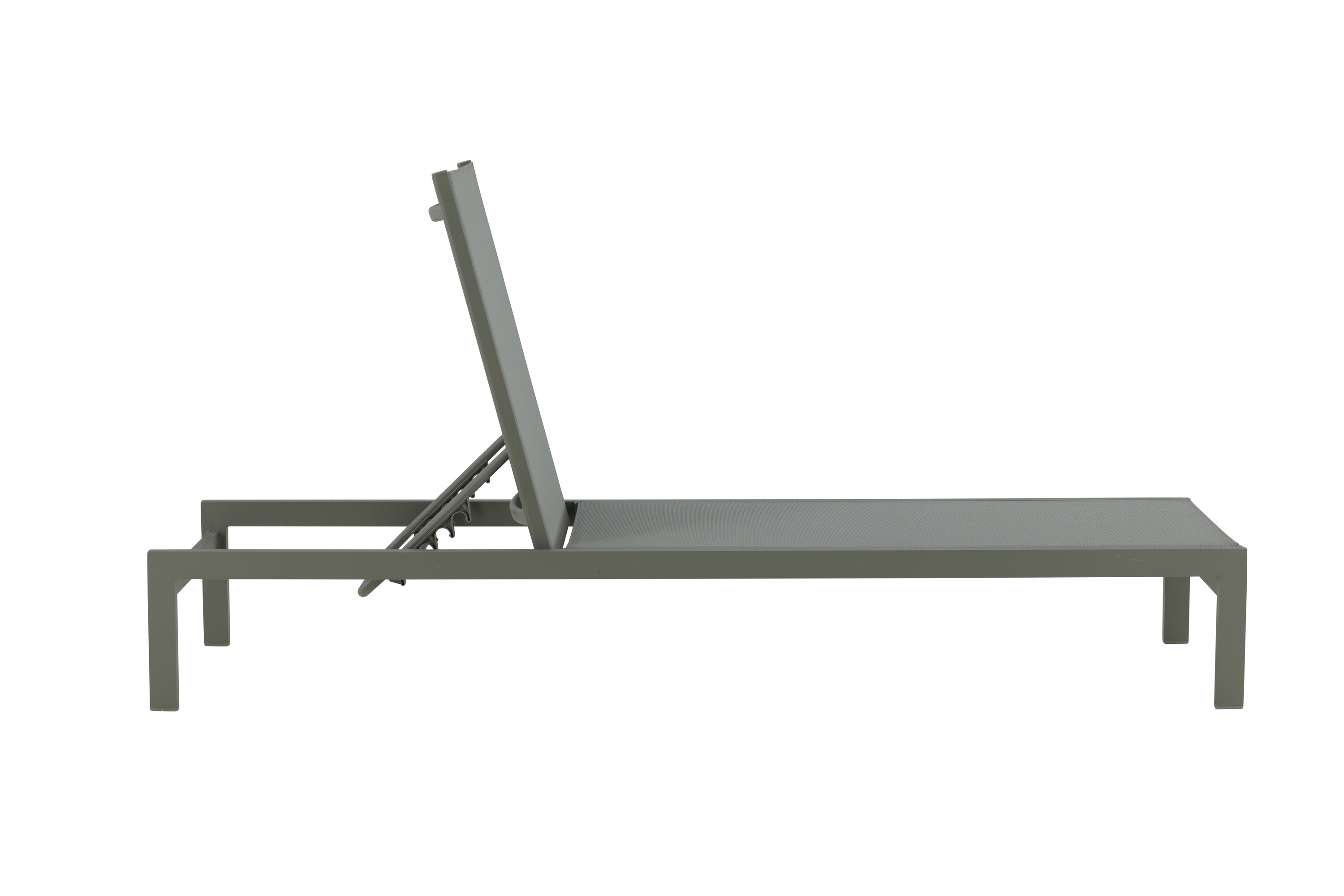 Lit de bronzage classique en aluminium laqué vert/kaki. Le dossier du transat peut être ajusté - profitez d'une belle sieste ou pratique et lisez un bon livre !