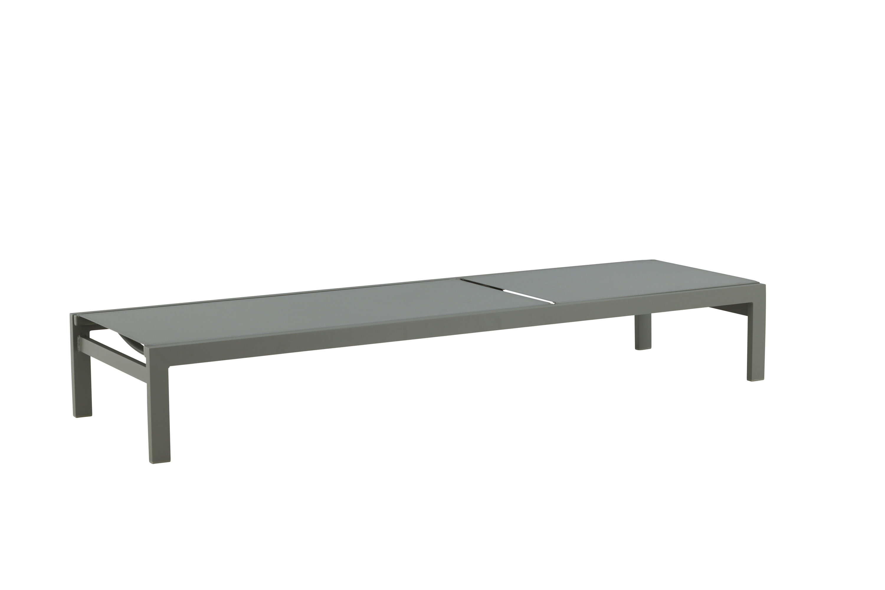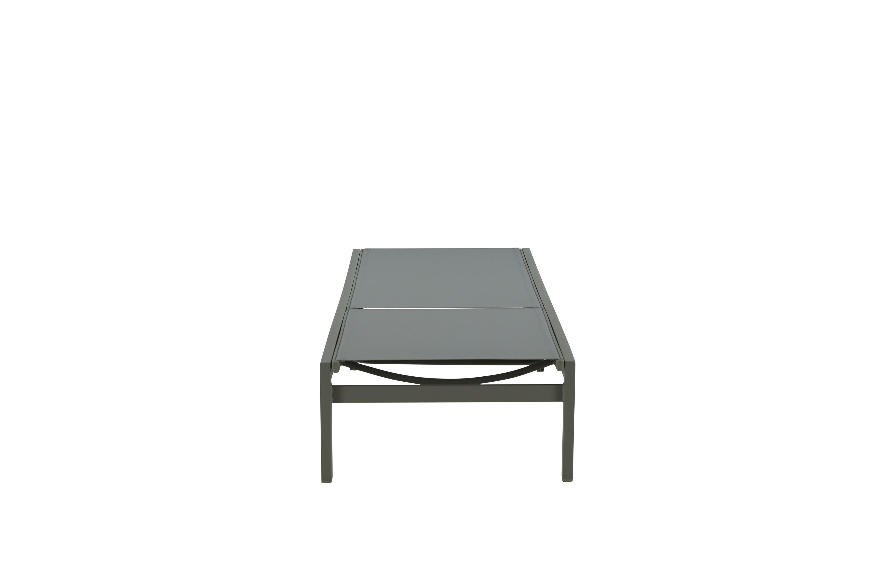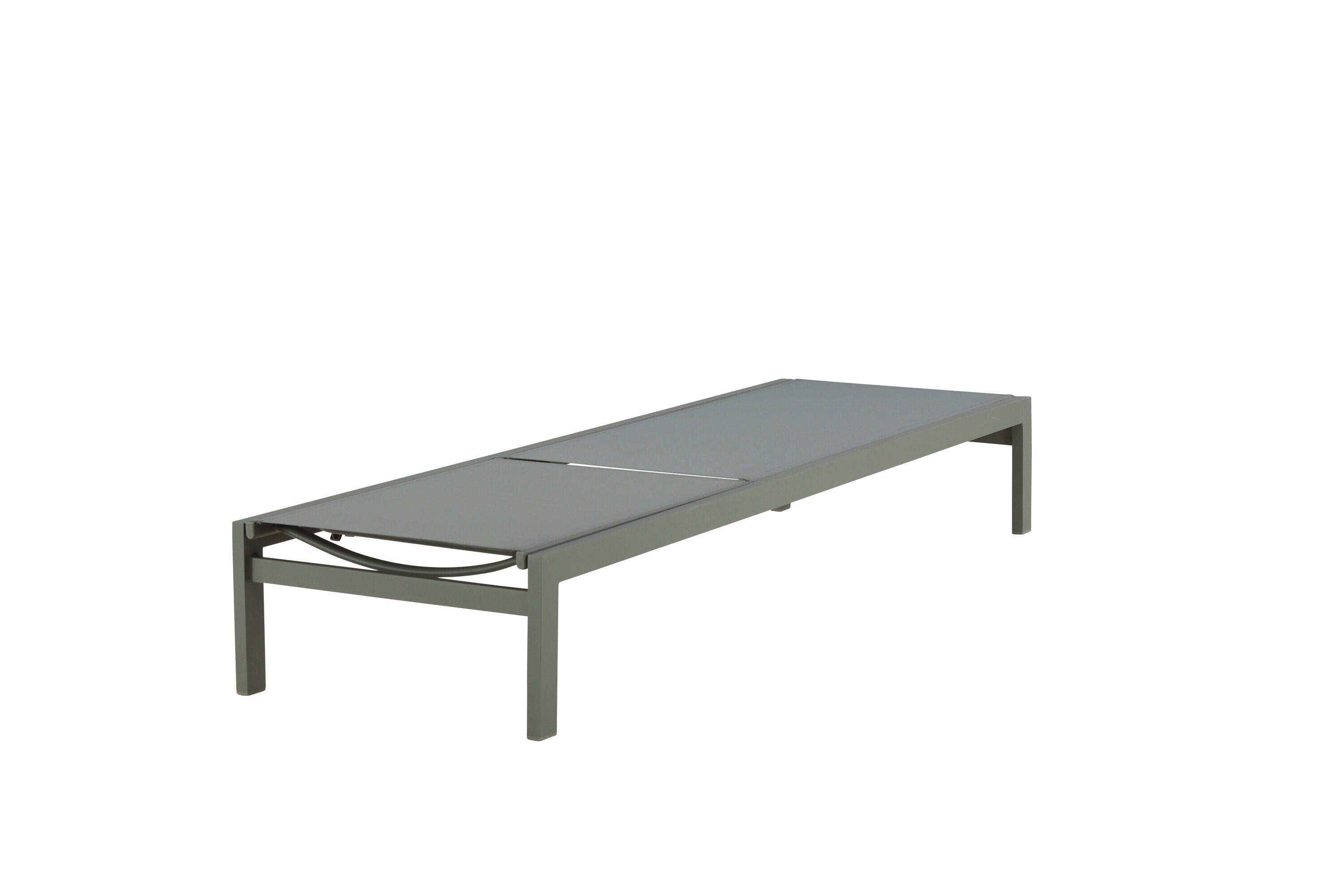 Lit de bronzage classique en aluminium laqué vert/kaki. Le dossier du transat peut être ajusté - profitez d'une belle sieste ou pratique et lisez un bon livre !