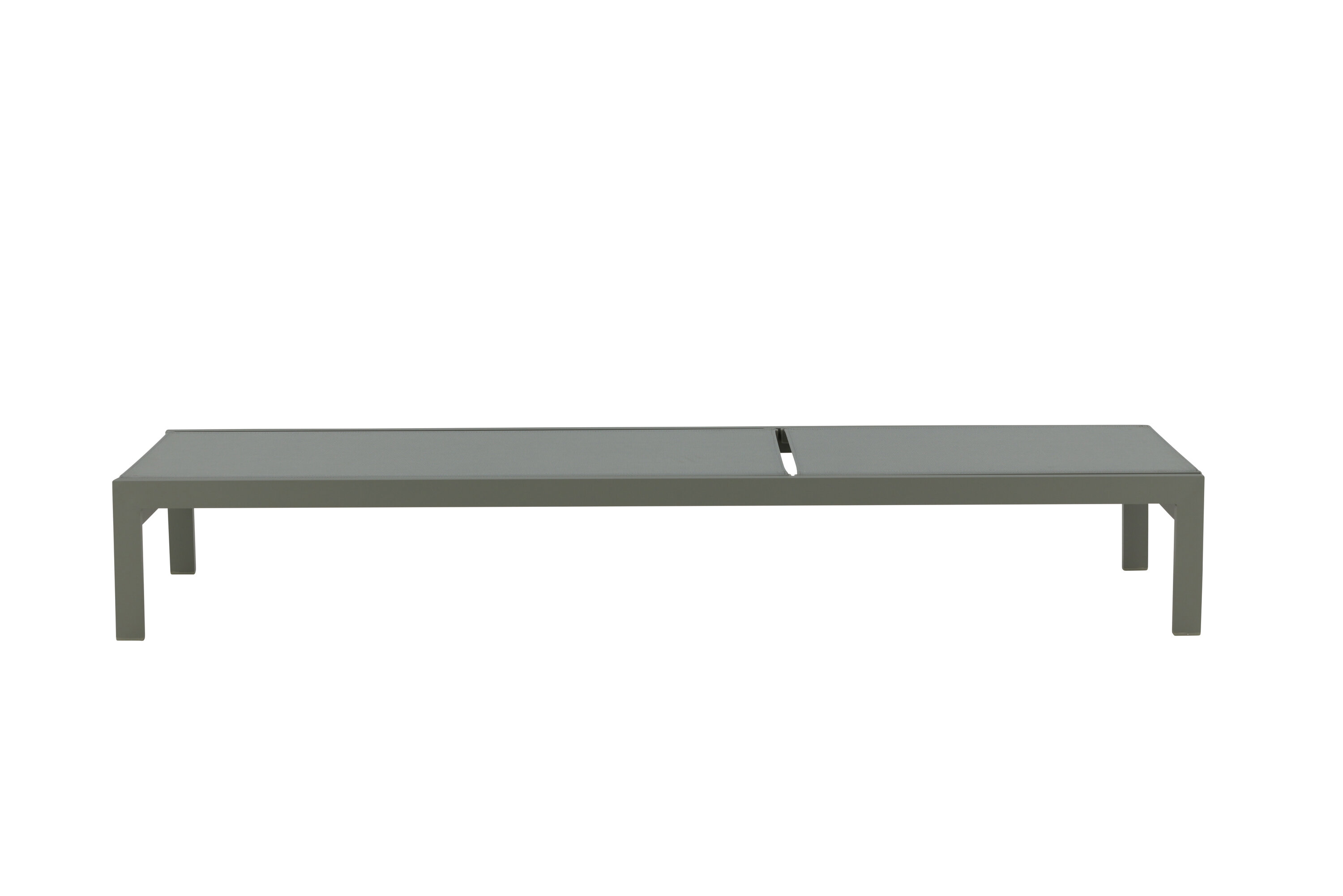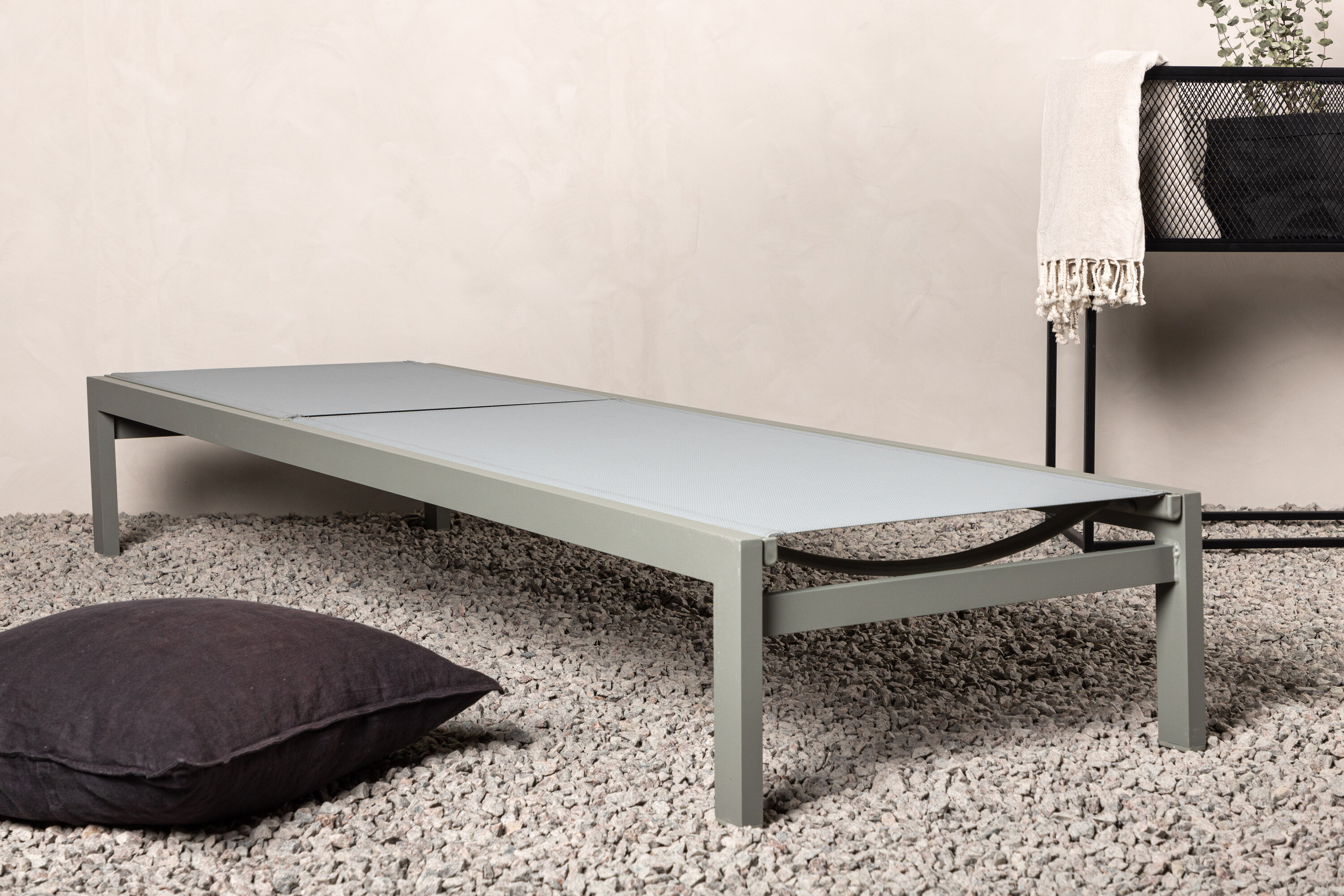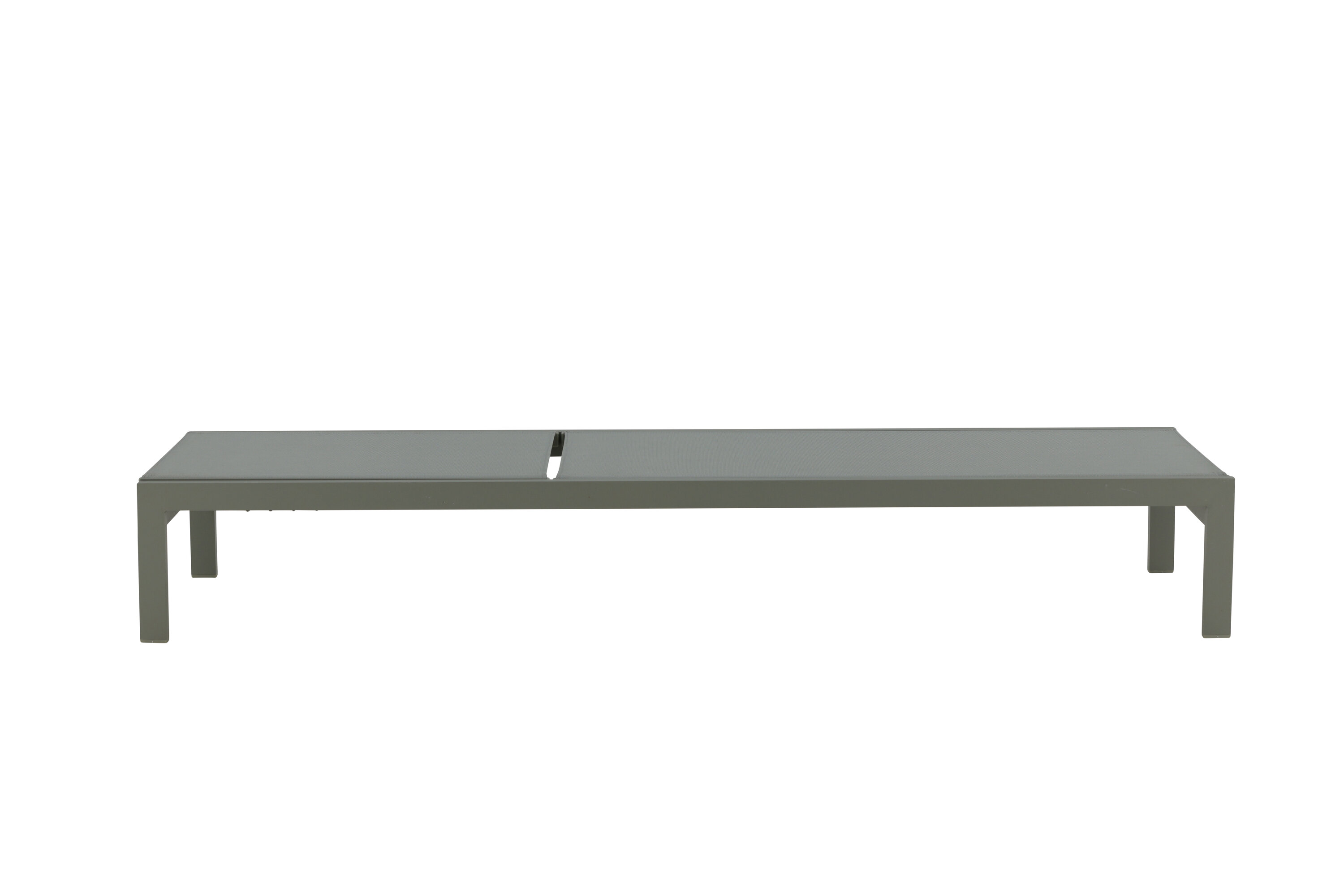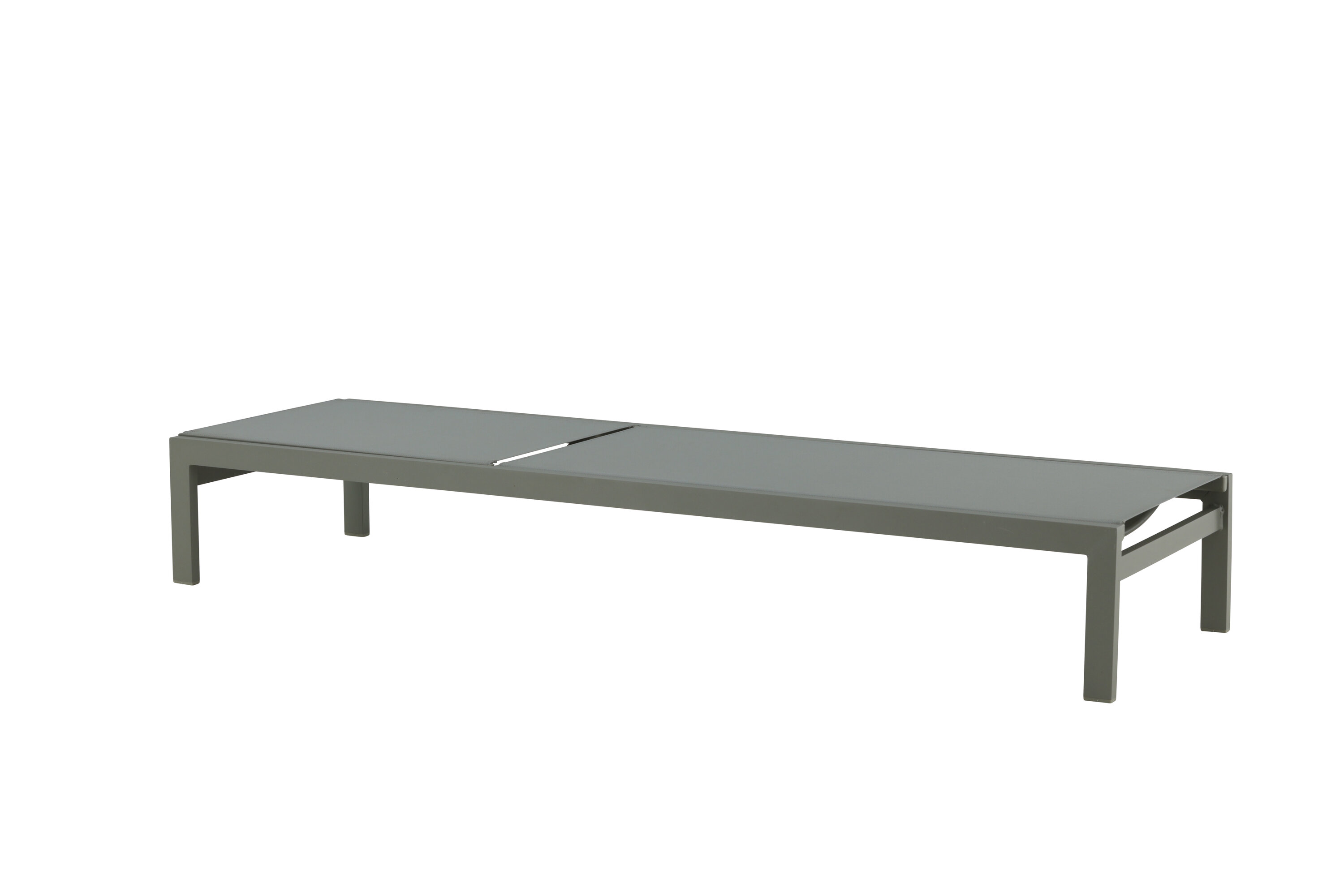 Lit de bronzage classique en aluminium laqué vert/kaki. Le dossier du transat peut être ajusté - profitez d'une belle sieste ou pratique et lisez un bon livre !