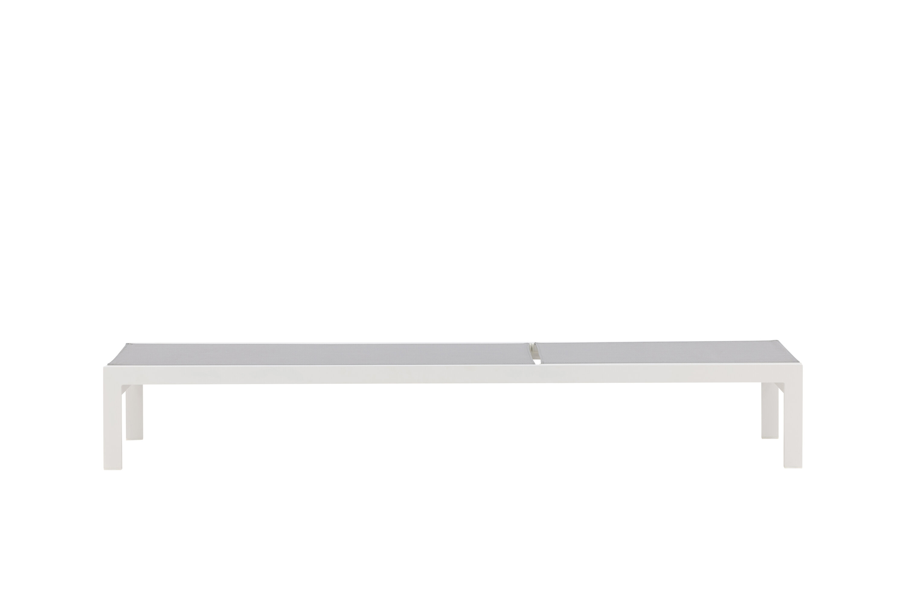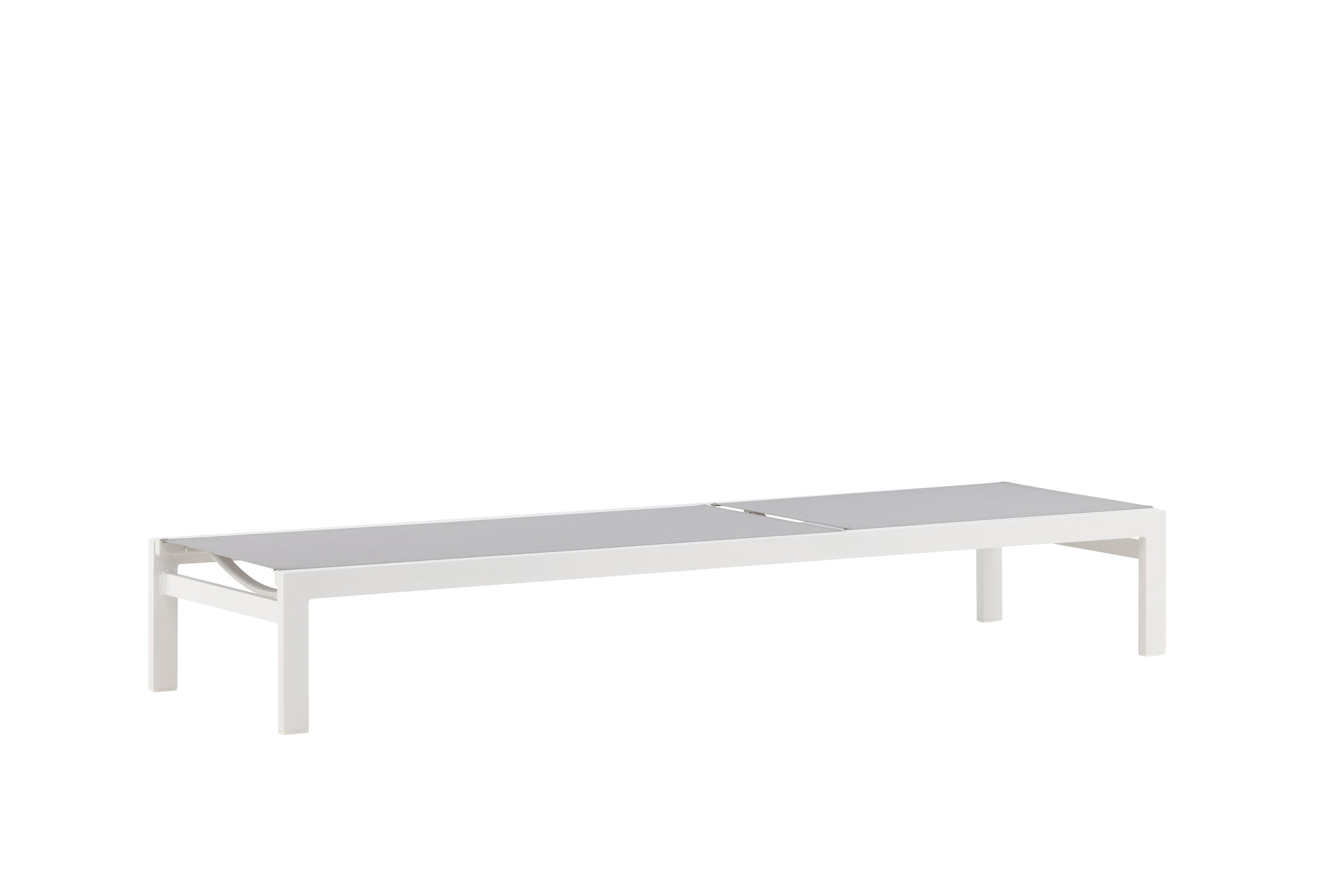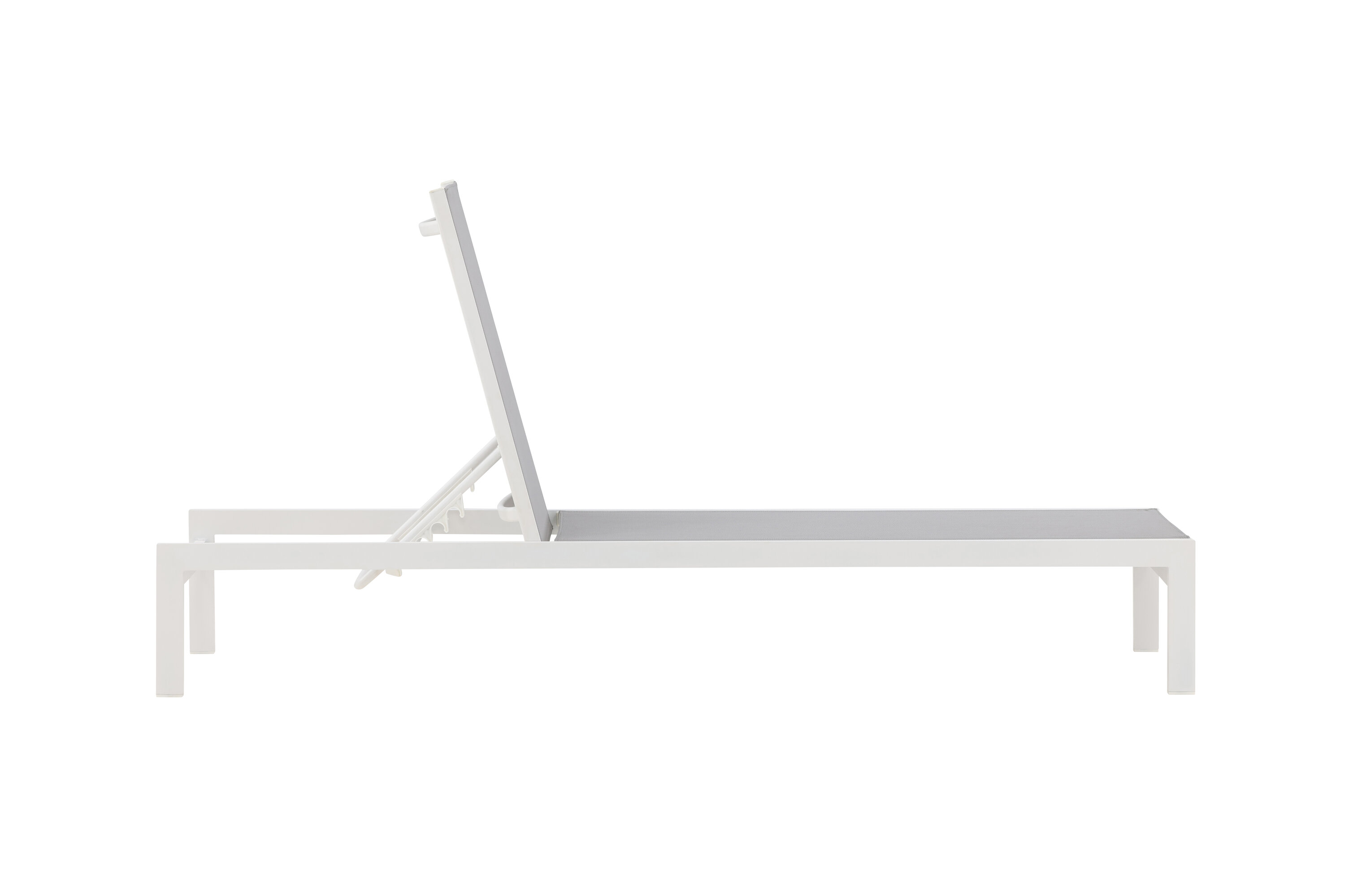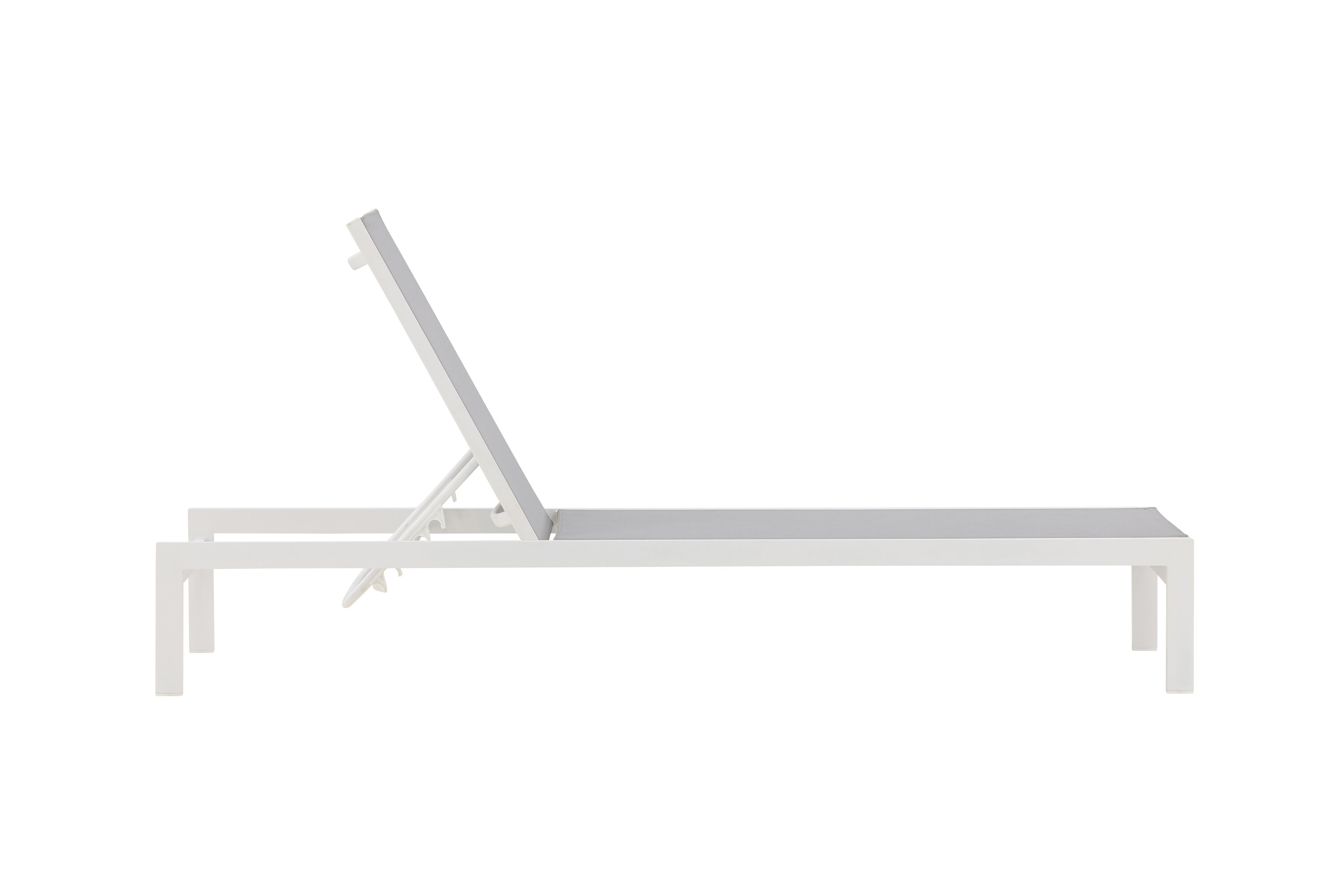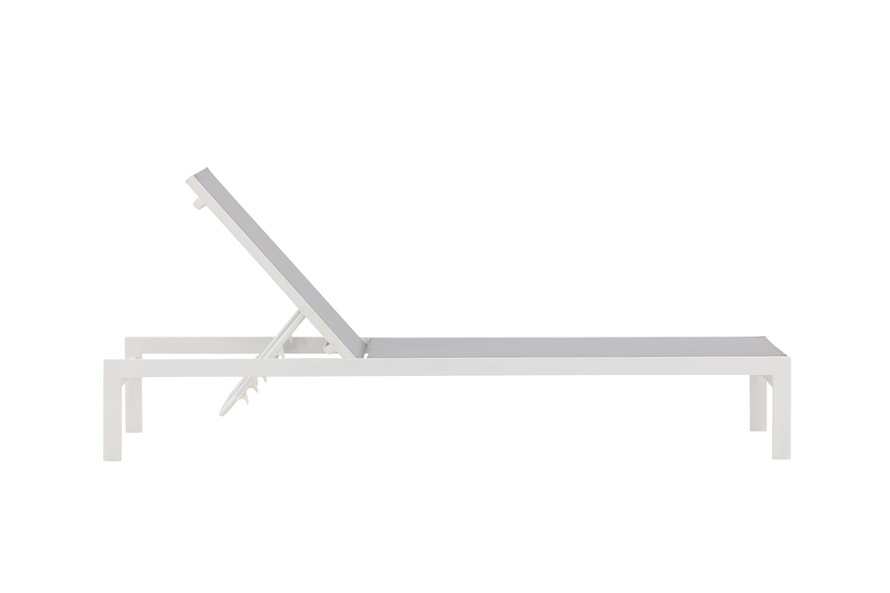 Lit de bronzage classique en aluminium blanc et textile gris. Le dossier du transat peut être ajusté - profitez d'une belle sieste ou pratique et lisez un bon livre !