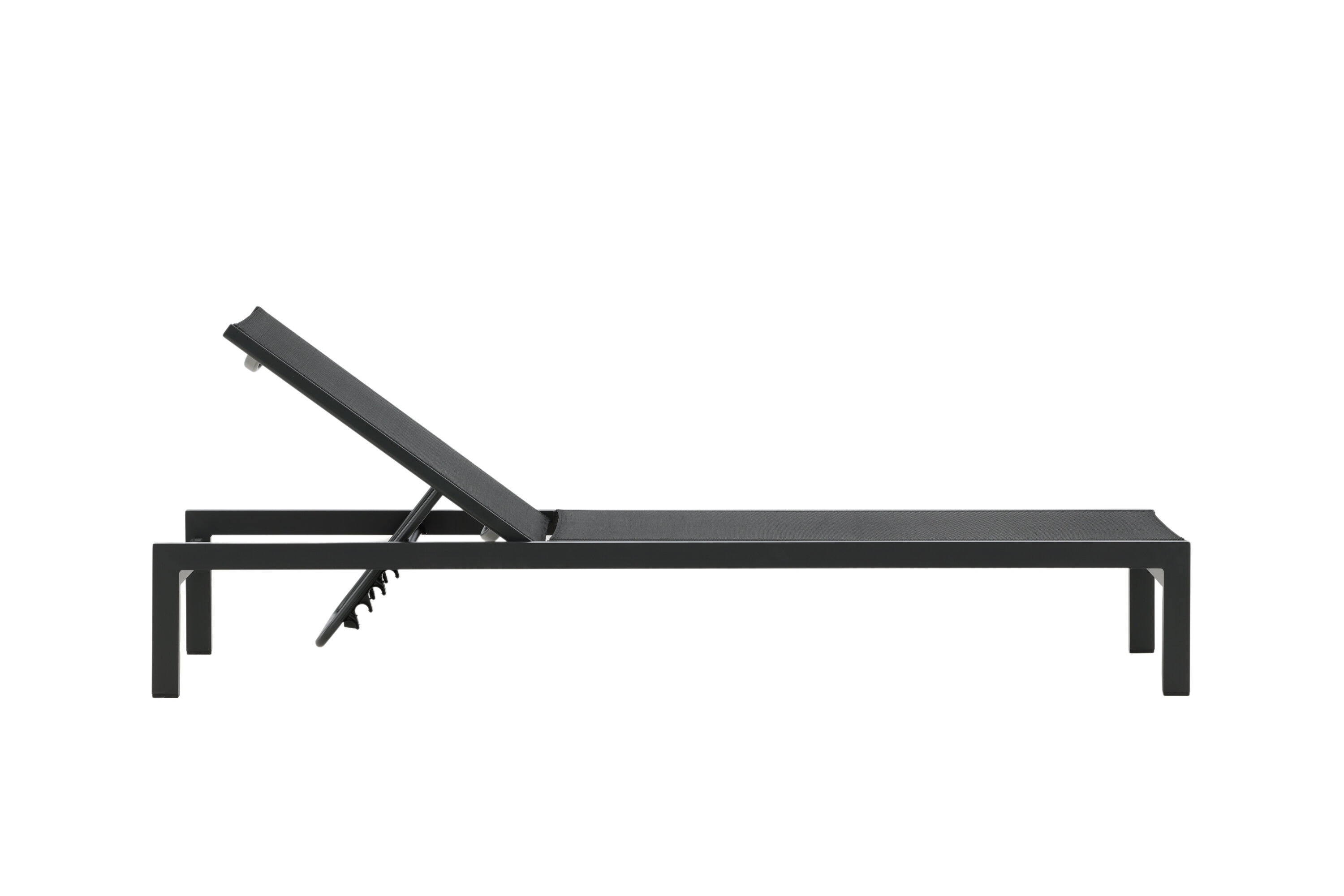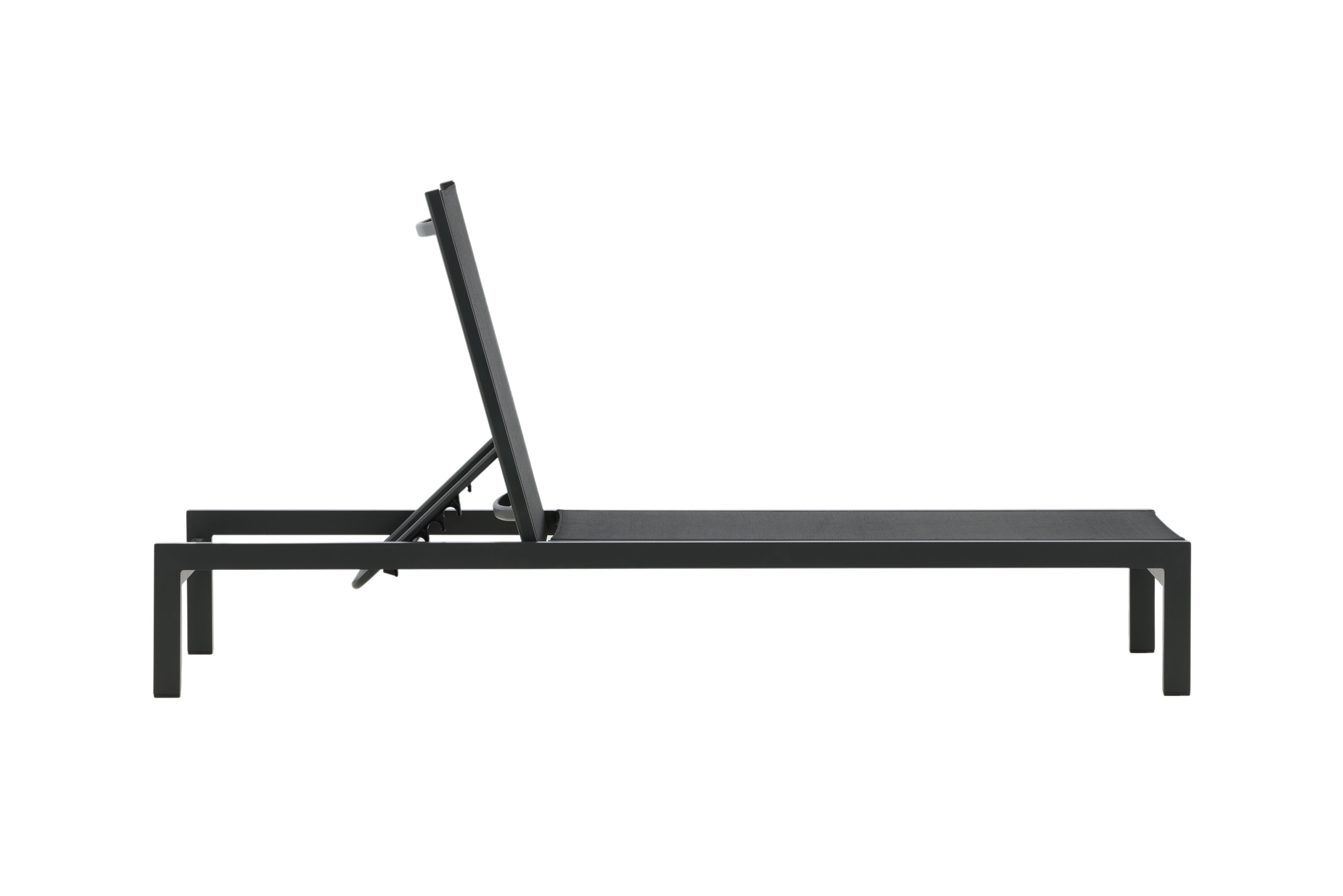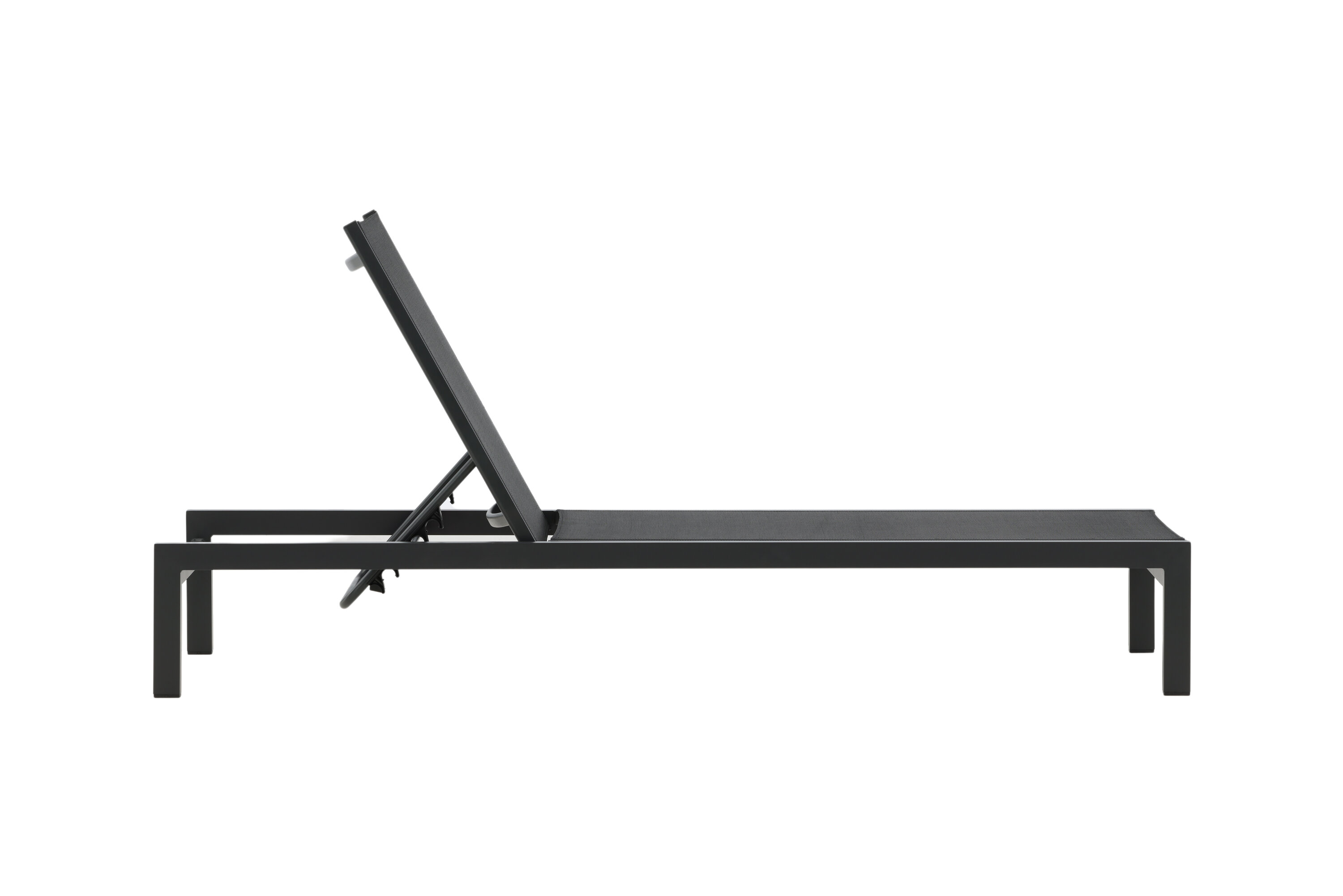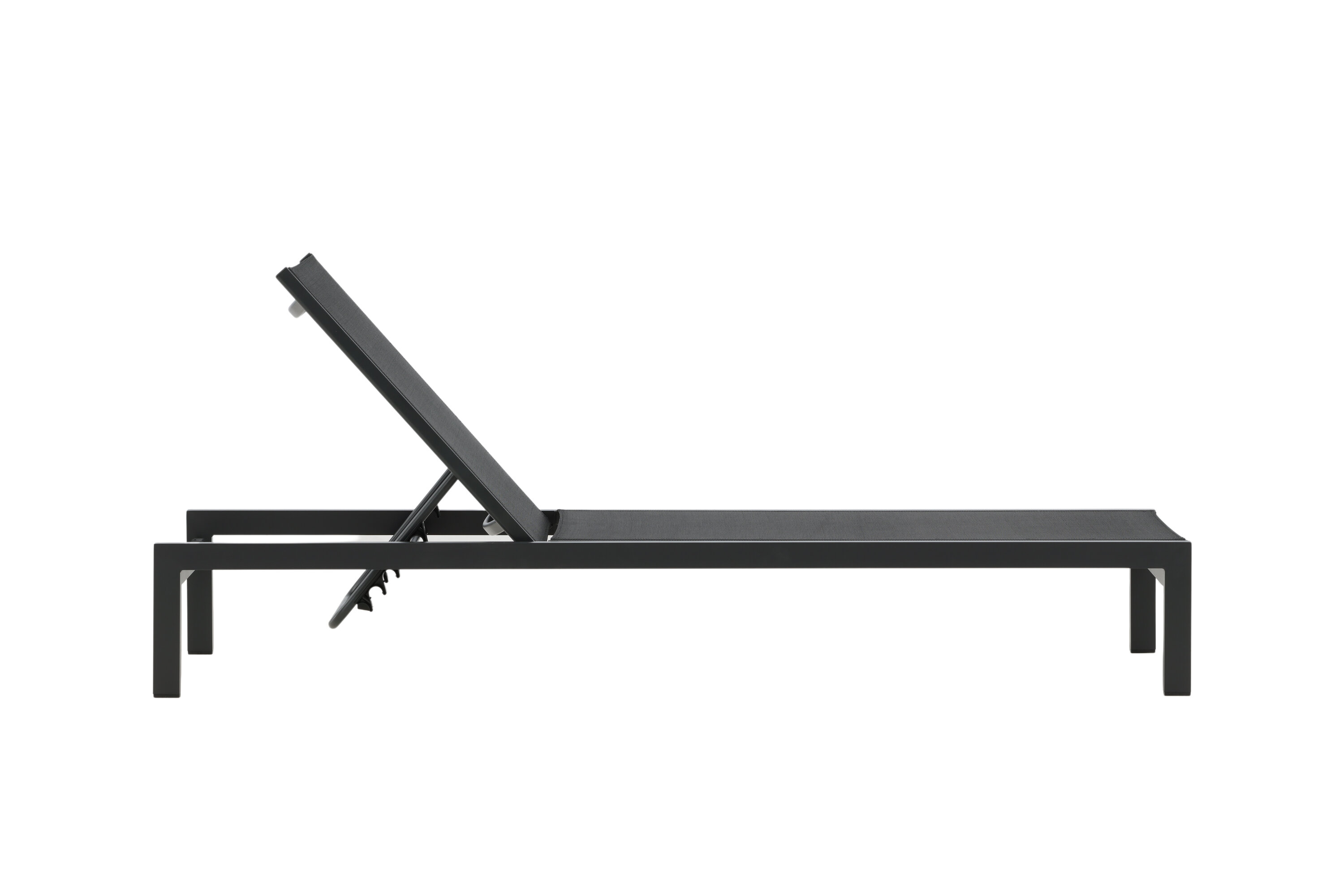 Lit de bronzage classique en aluminium noir et textile. Le dossier du transat peut être ajusté - profitez d'une belle sieste ou pratique et lisez un bon livre !