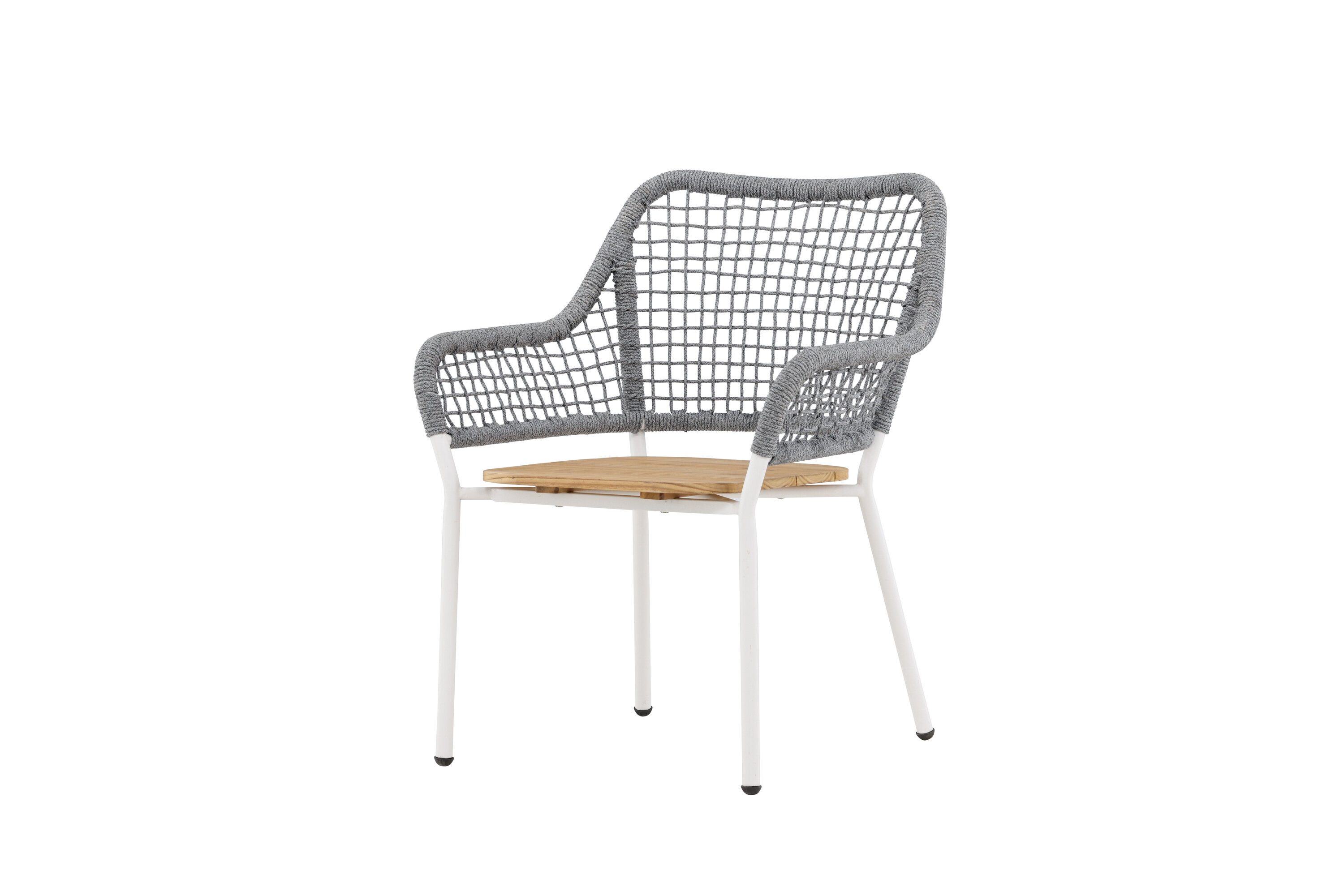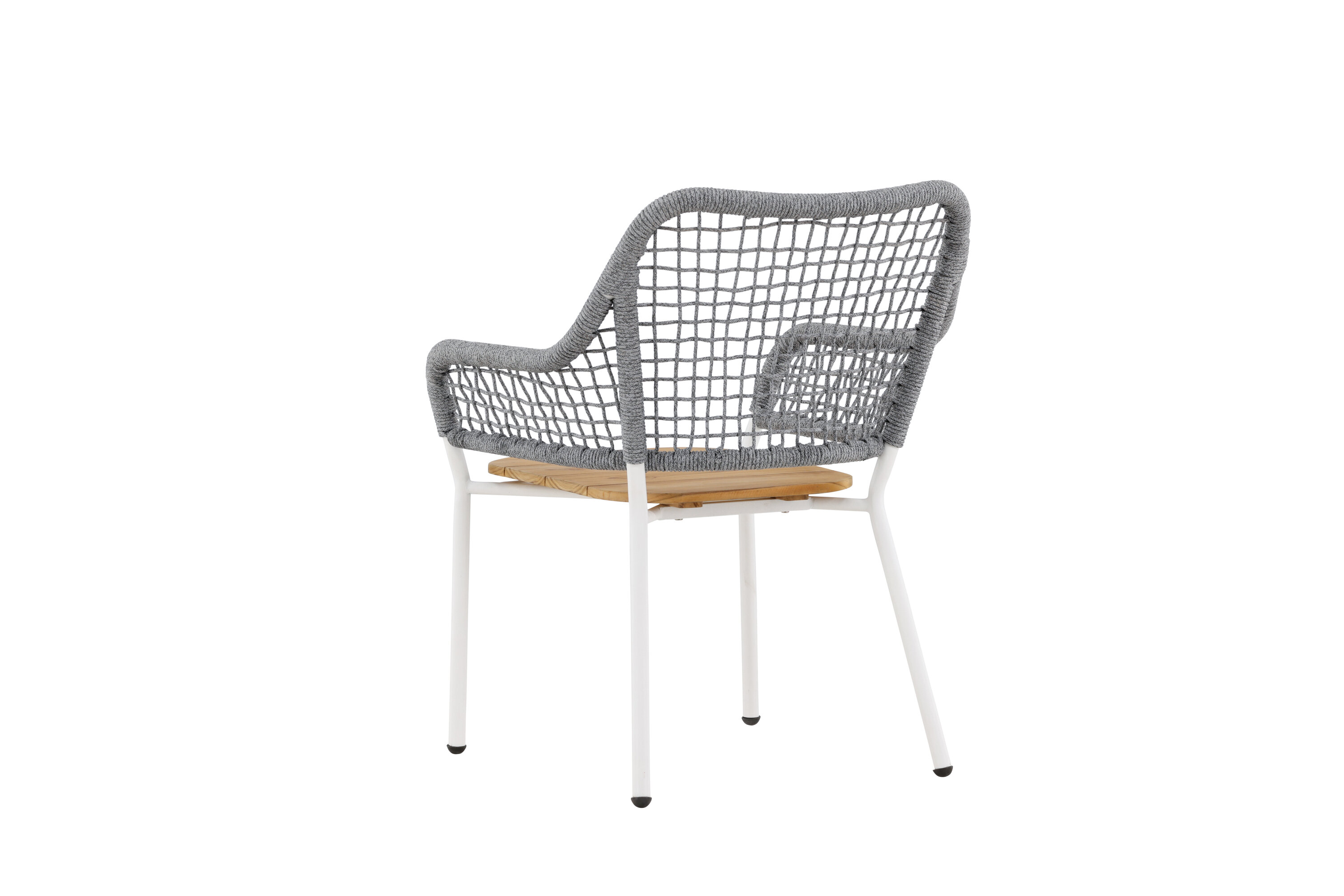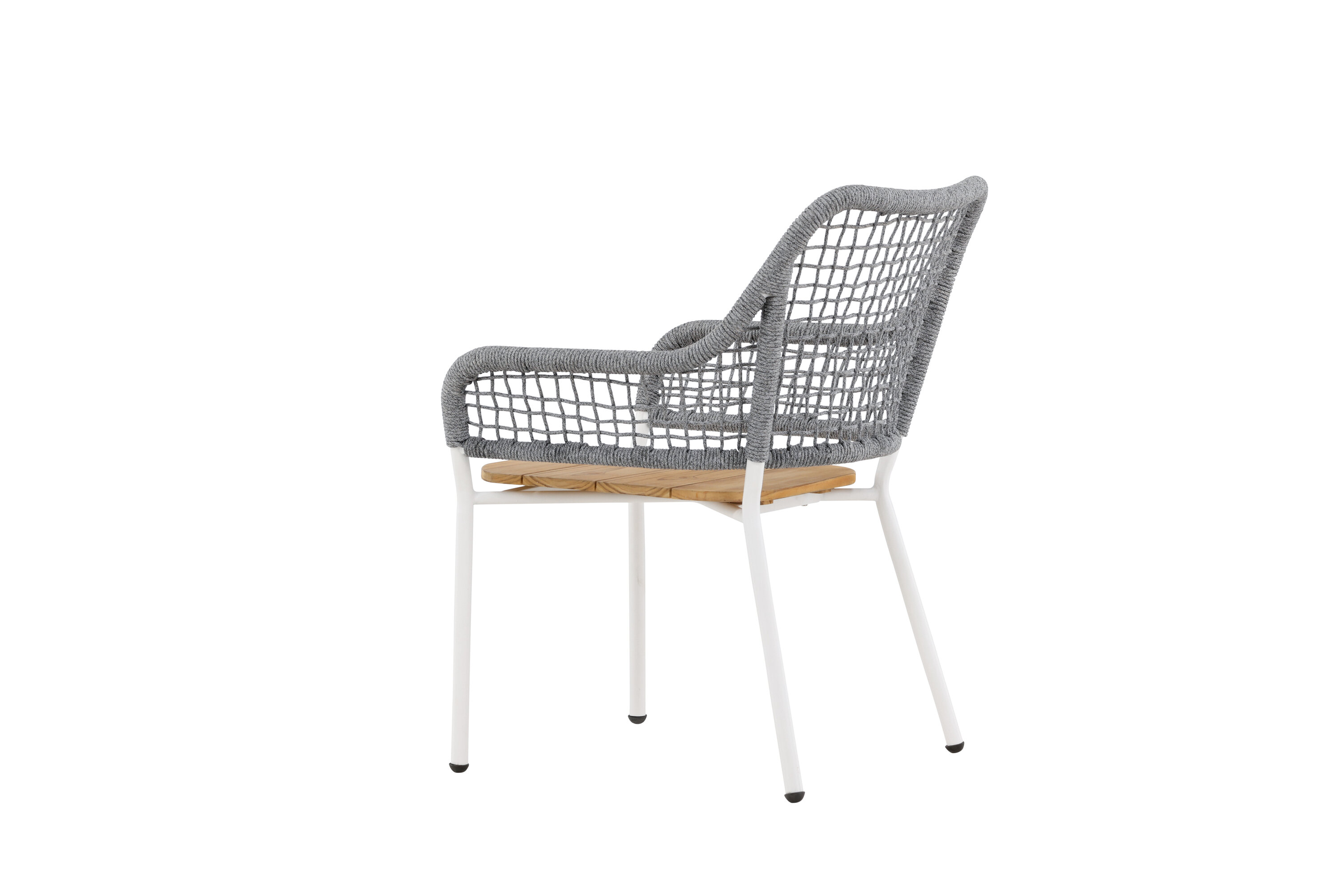 Le cadre en acier donne à Amora une base moderne et robuste, tandis que le siège en teck et le dossier en corde offrent une fusion harmonieuse de la nature et d'un design innovant. La couleur beige douce de l'assise et l'élégante corde blanche créent une atmosphère calme et accueillante.