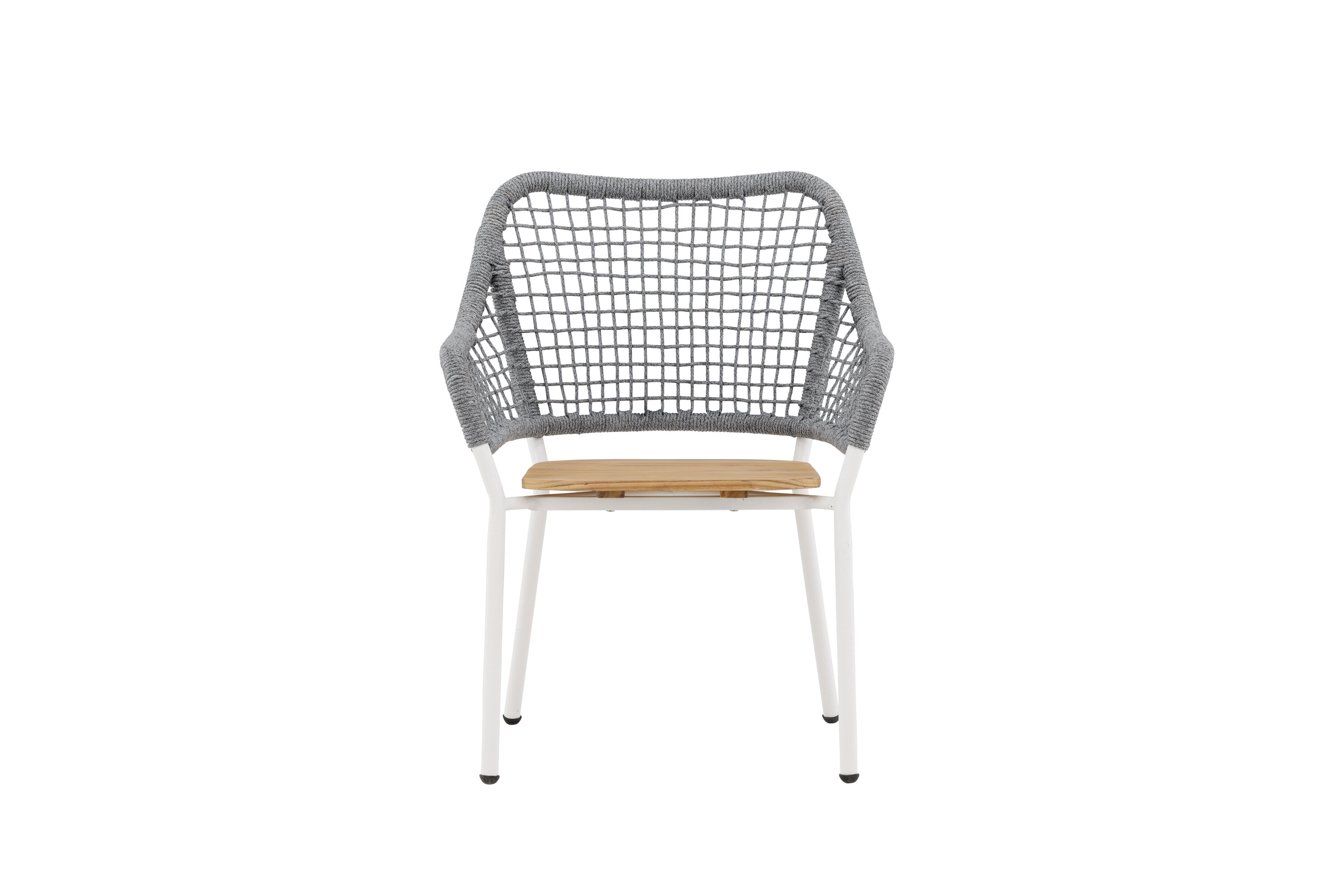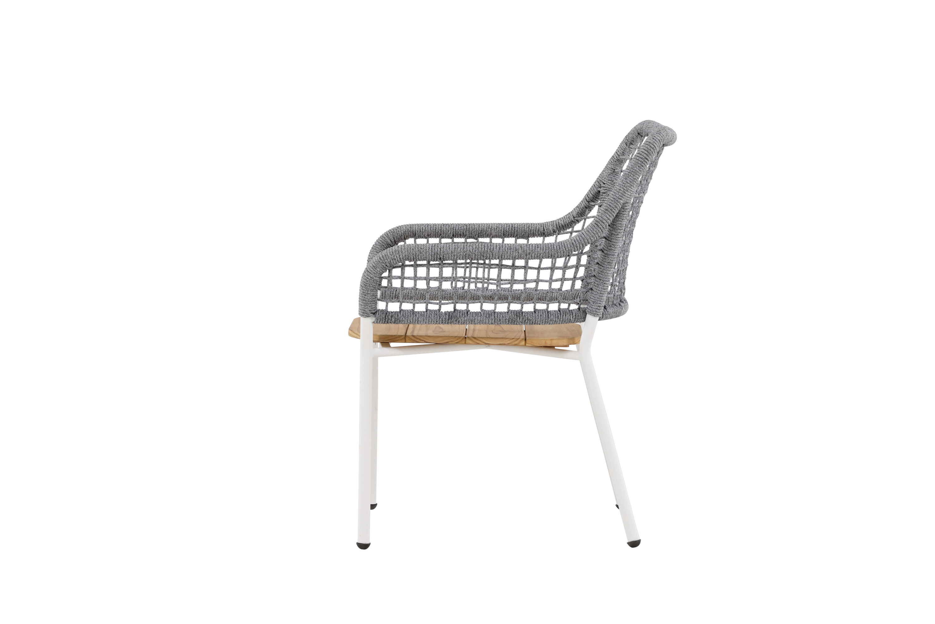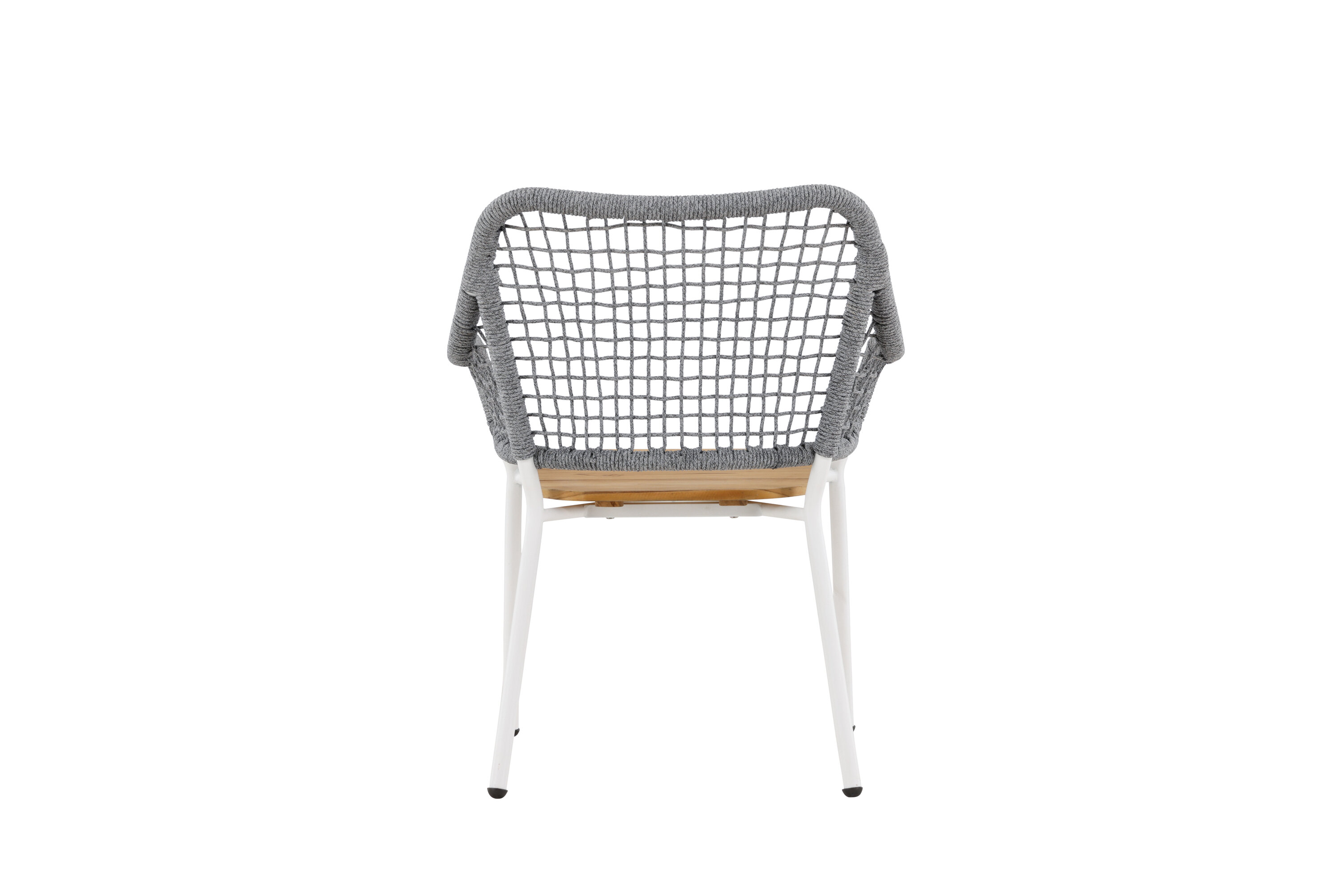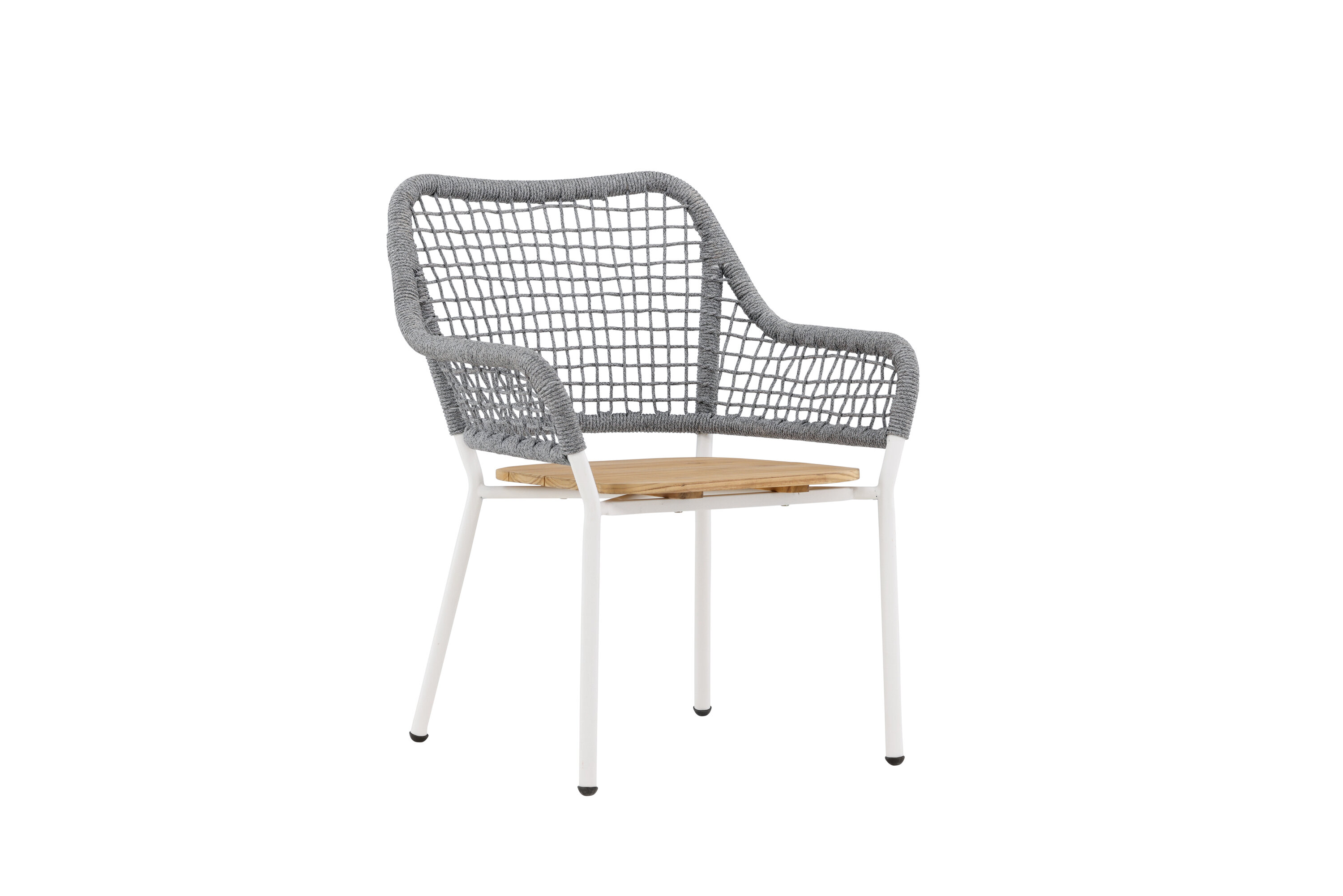 Le cadre en acier donne à Amora une base moderne et robuste, tandis que le siège en teck et le dossier en corde offrent une fusion harmonieuse de la nature et d'un design innovant. La couleur beige douce de l'assise et l'élégante corde blanche créent une atmosphère calme et accueillante.