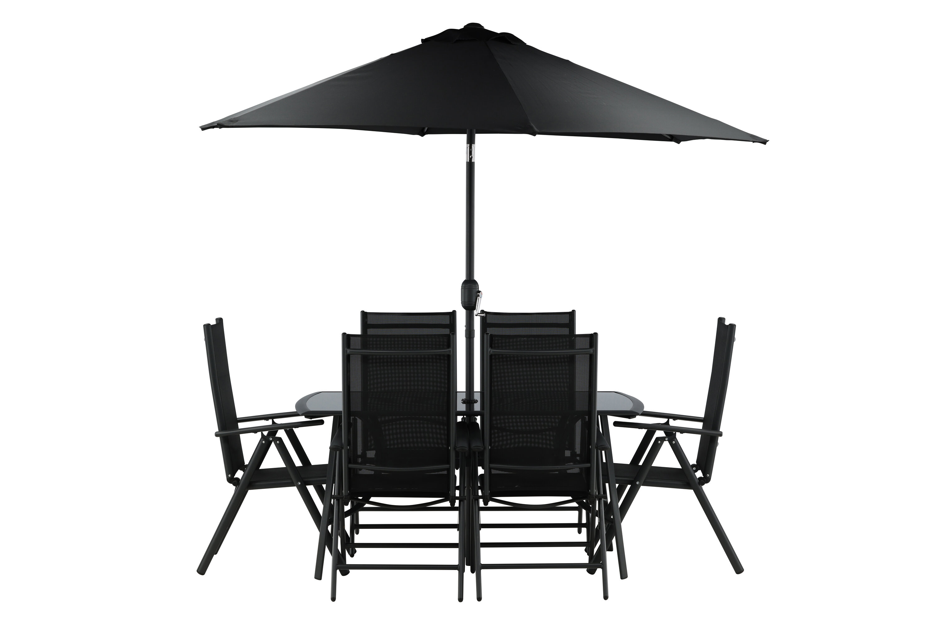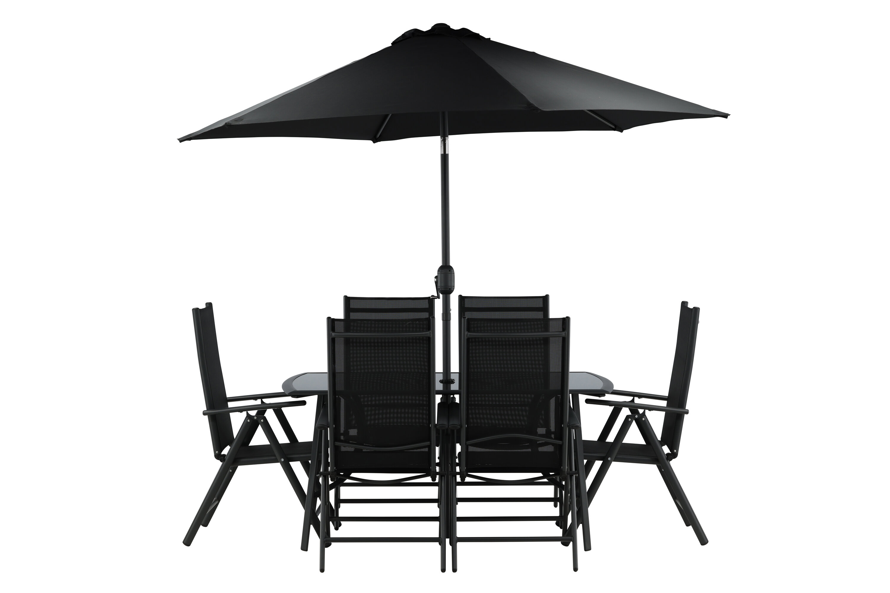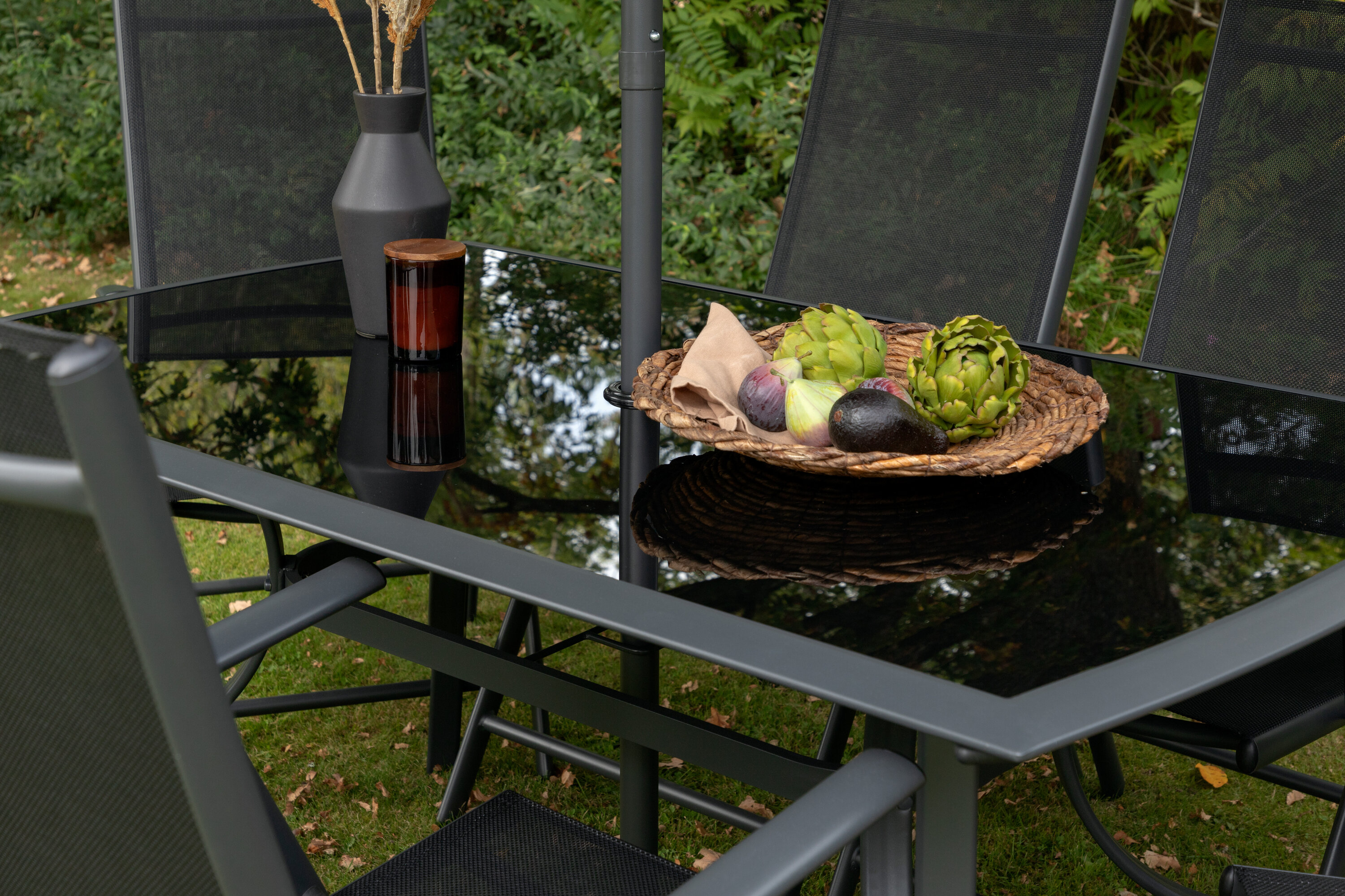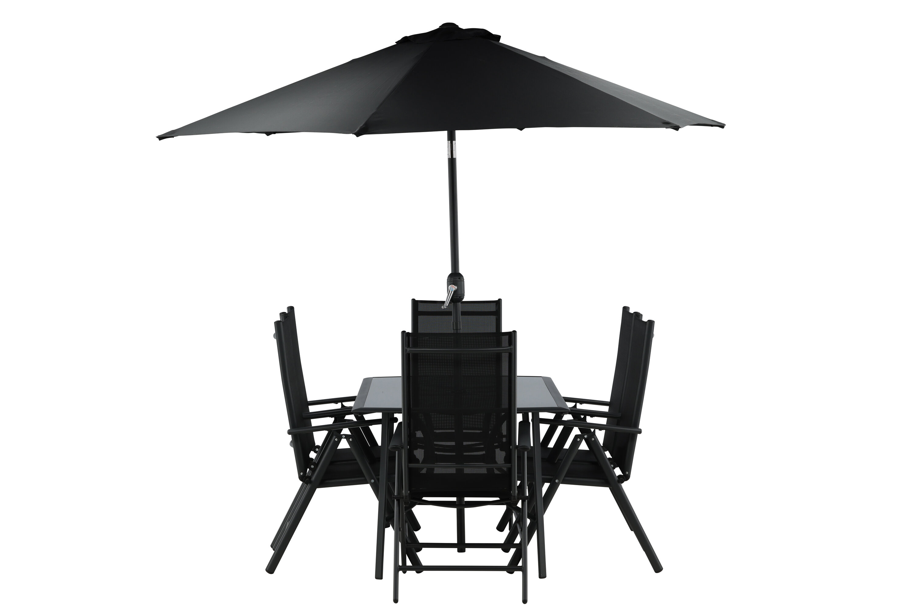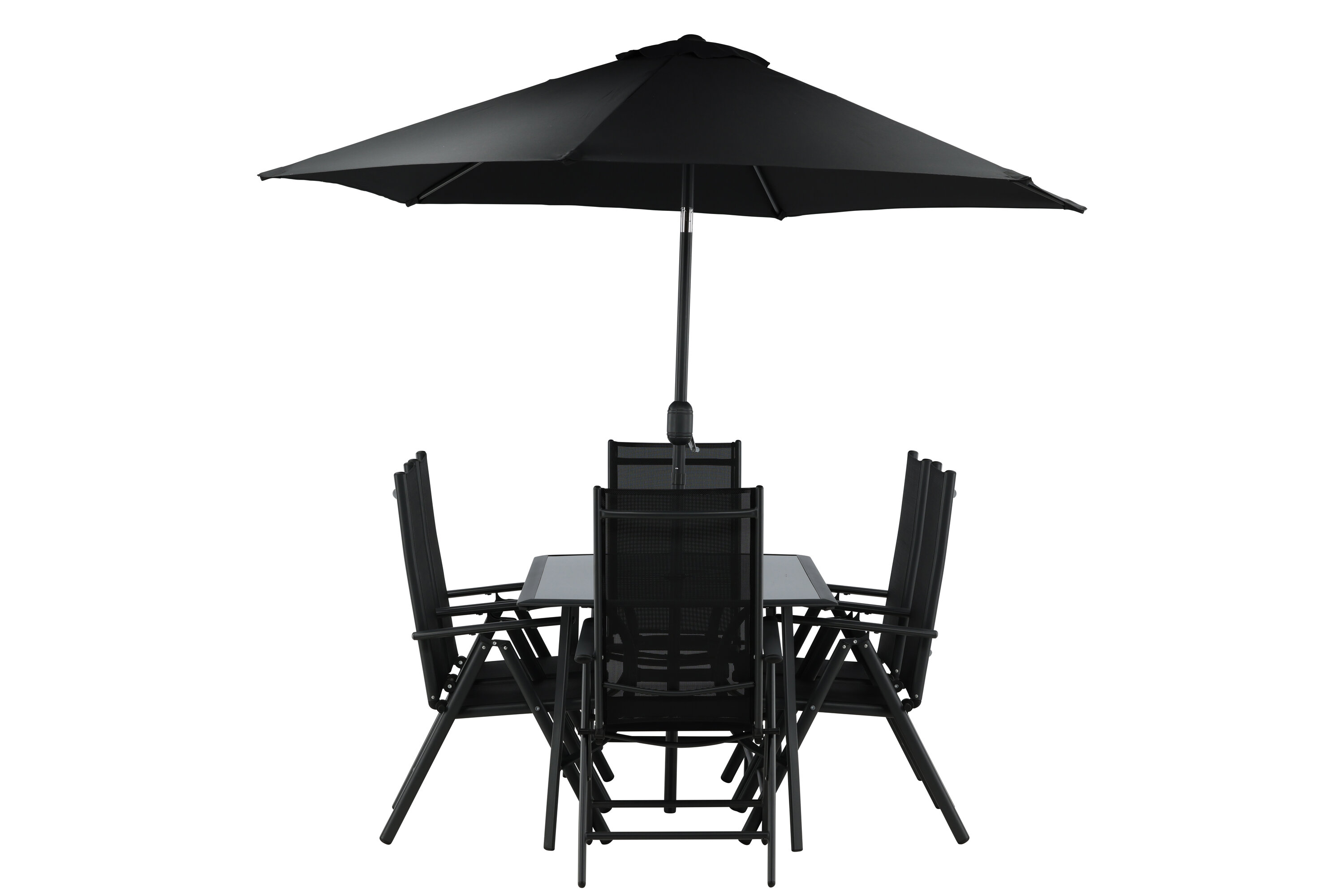 Rafraîchissez-vous à l'ombre pendant un moment dans un groupe de restauration moderne sous un parasol intelligent ! Le groupe Brekki propose à la fois une table à manger élégante avec un plateau en verre et des pieds droits en aluminium noir. Ici avec des chaises de salle à manger pliantes avec un siège en textilène noir et un cadre en aluminium. Le parasol est fixé au milieu de la table et est là pour vous protéger des rayons chauds du soleil pendant le dîner. Le parasol a un tissu noir avec un cadre en aluminium. Ça ne peut pas être mieux que ça !