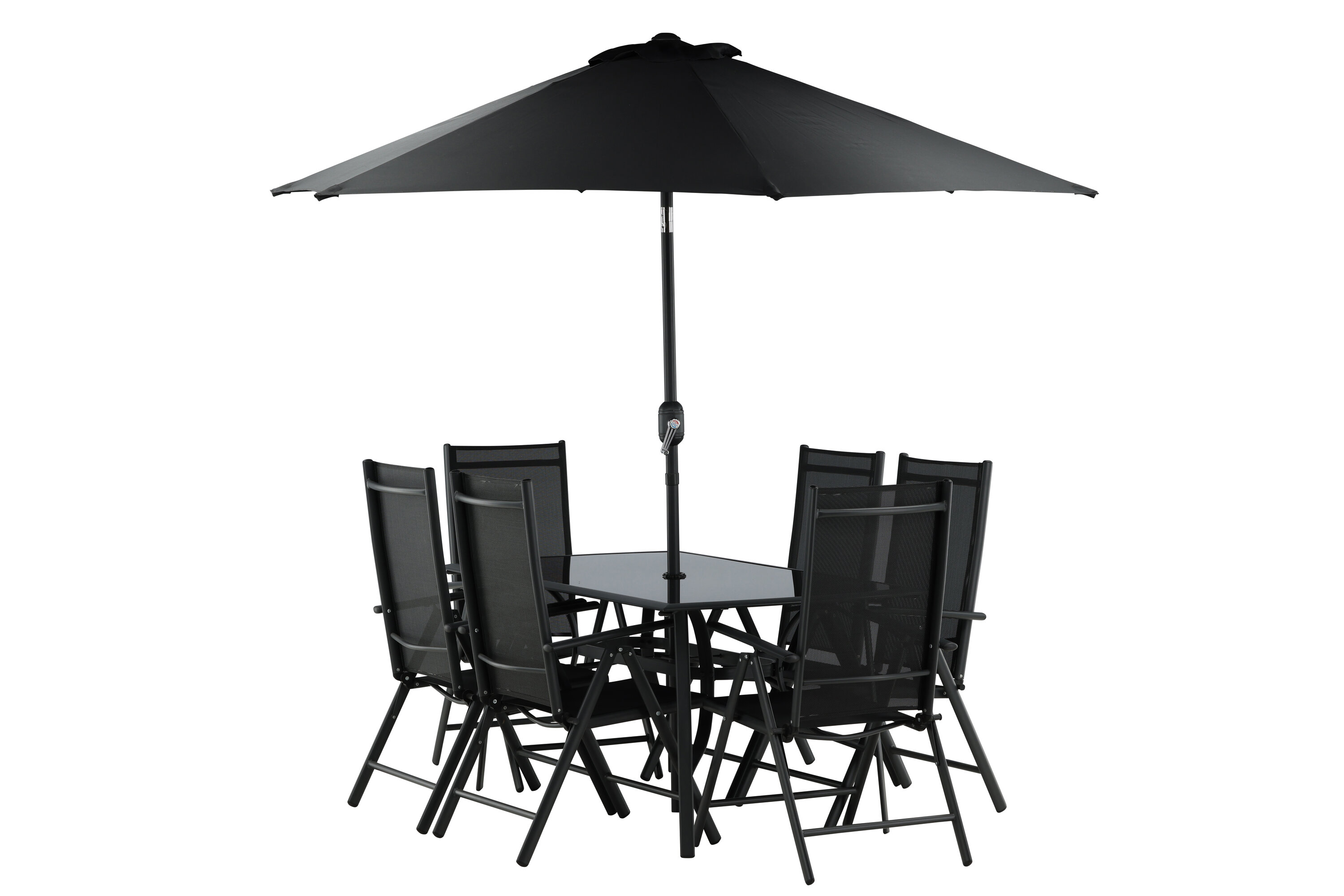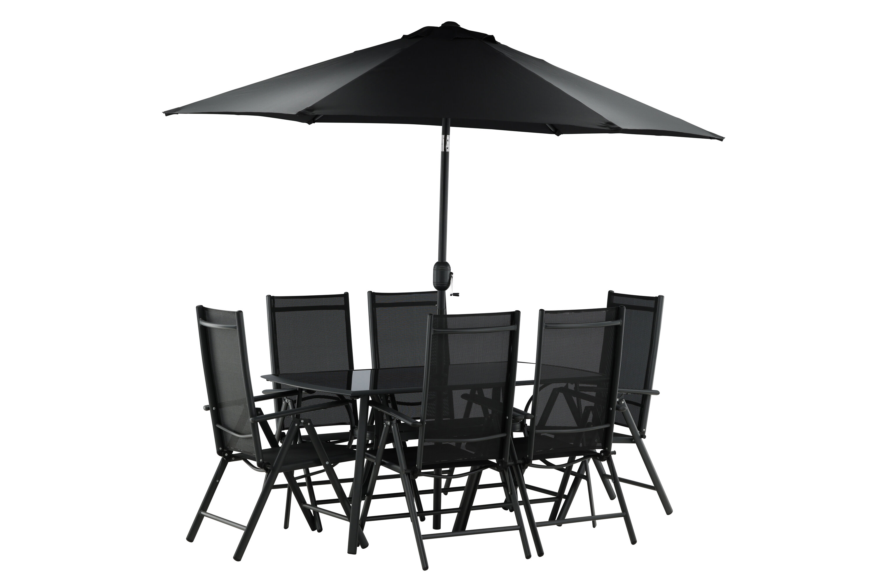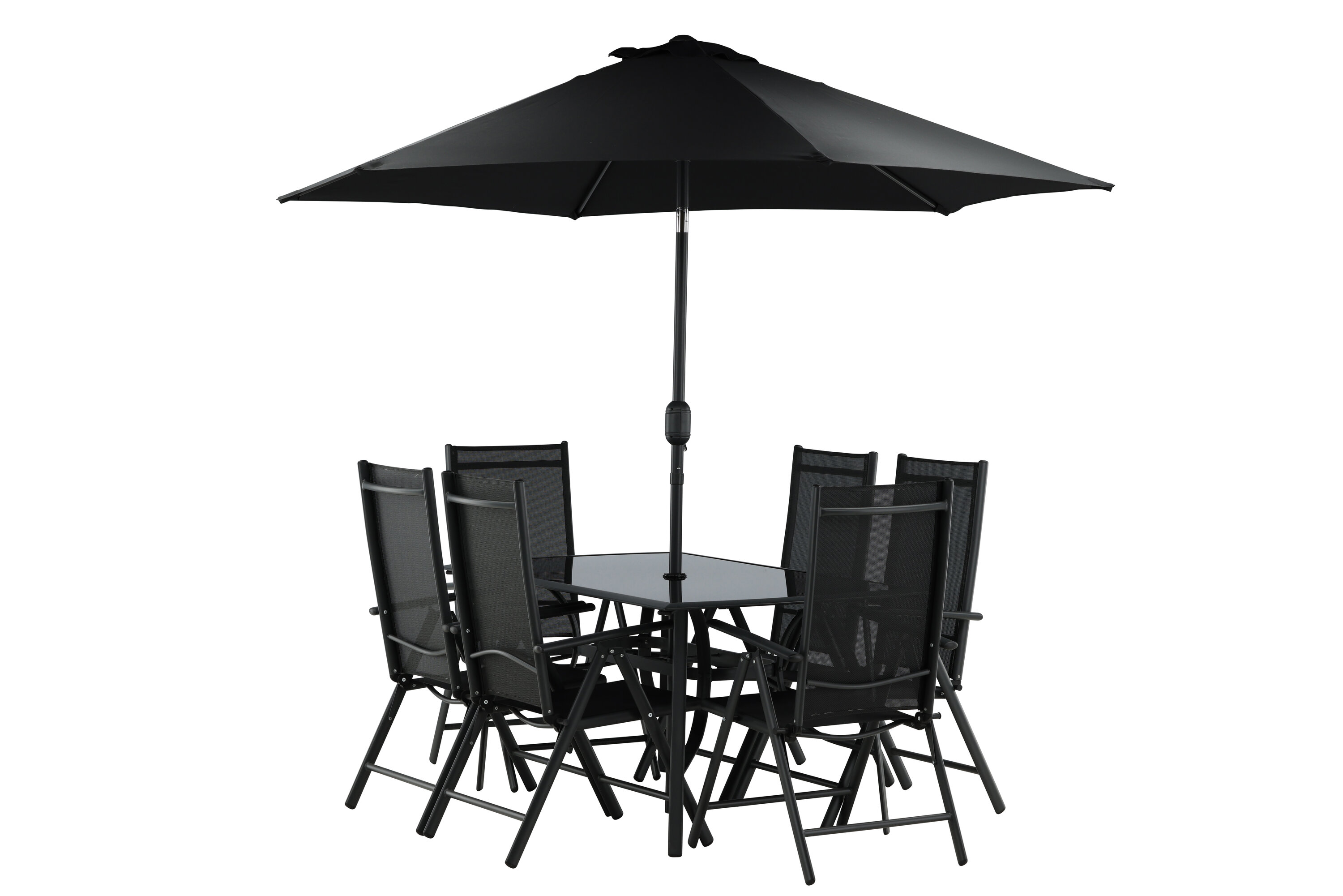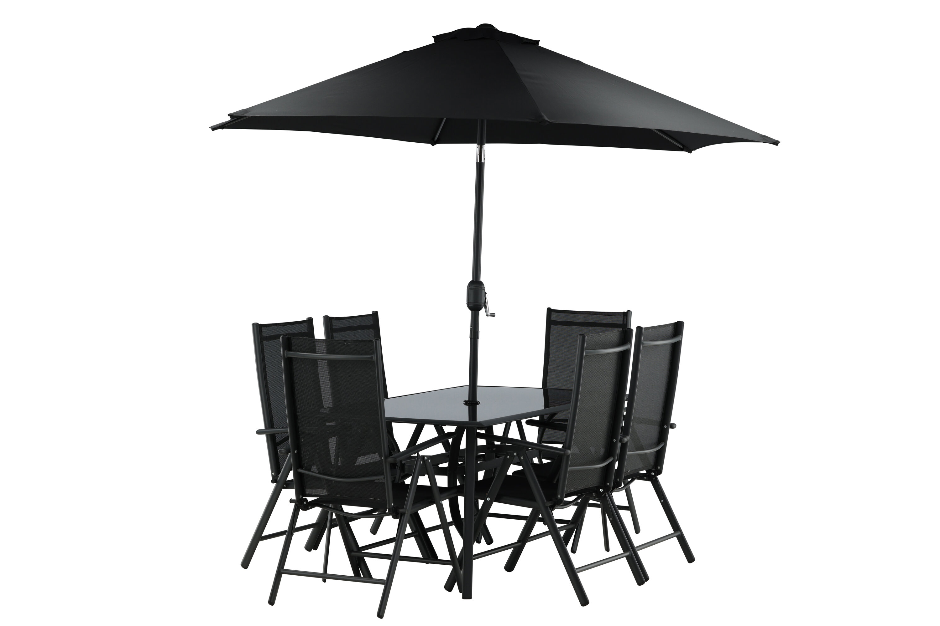 Rafraîchissez-vous à l'ombre pendant un moment dans un groupe de restauration moderne sous un parasol intelligent ! Le groupe Brekki propose à la fois une table à manger élégante avec un plateau en verre et des pieds droits en aluminium noir. Ici avec des chaises de salle à manger pliantes avec un siège en textilène noir et un cadre en aluminium. Le parasol est fixé au milieu de la table et est là pour vous protéger des rayons chauds du soleil pendant le dîner. Le parasol a un tissu noir avec un cadre en aluminium. Ça ne peut pas être mieux que ça !