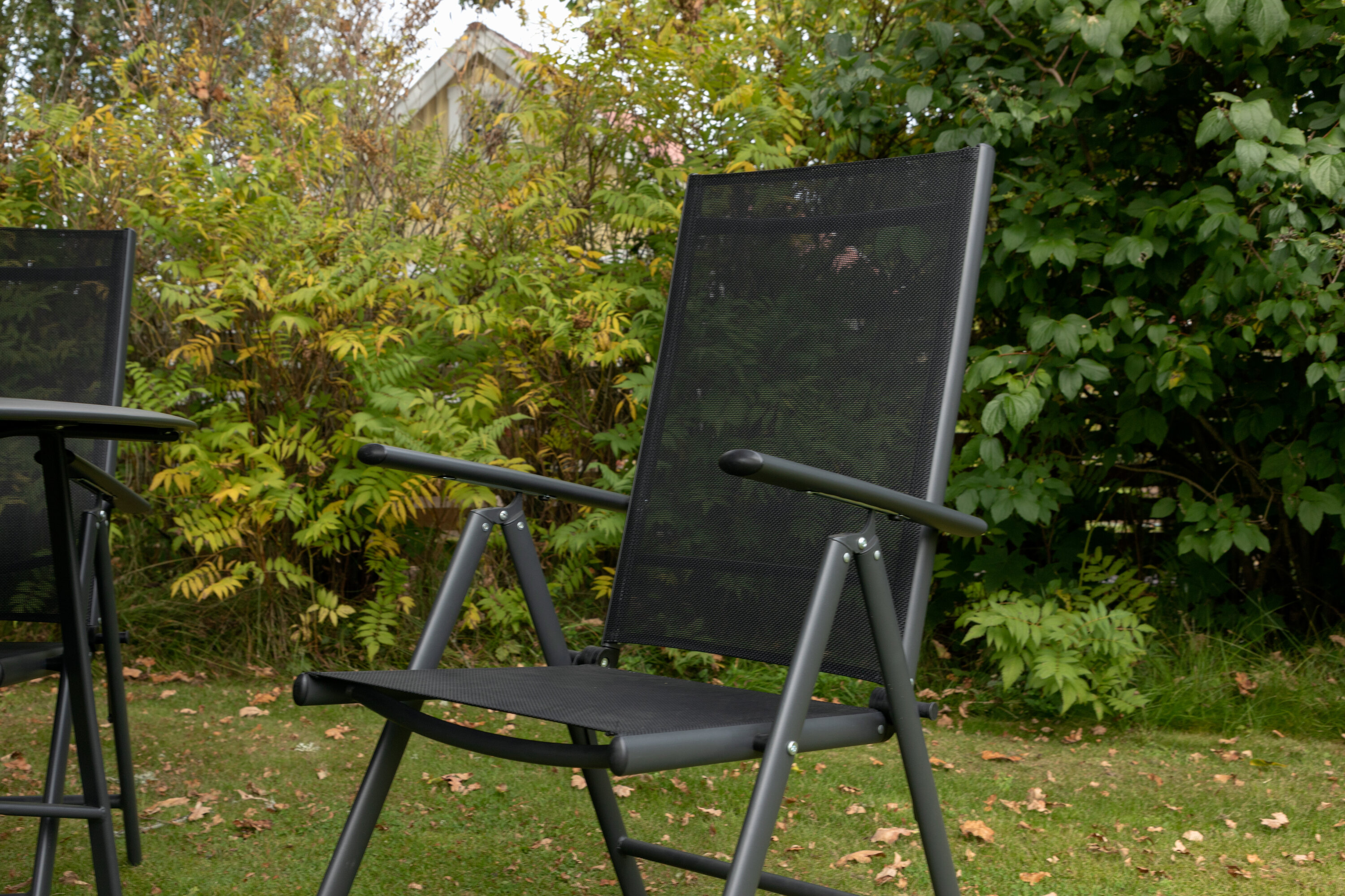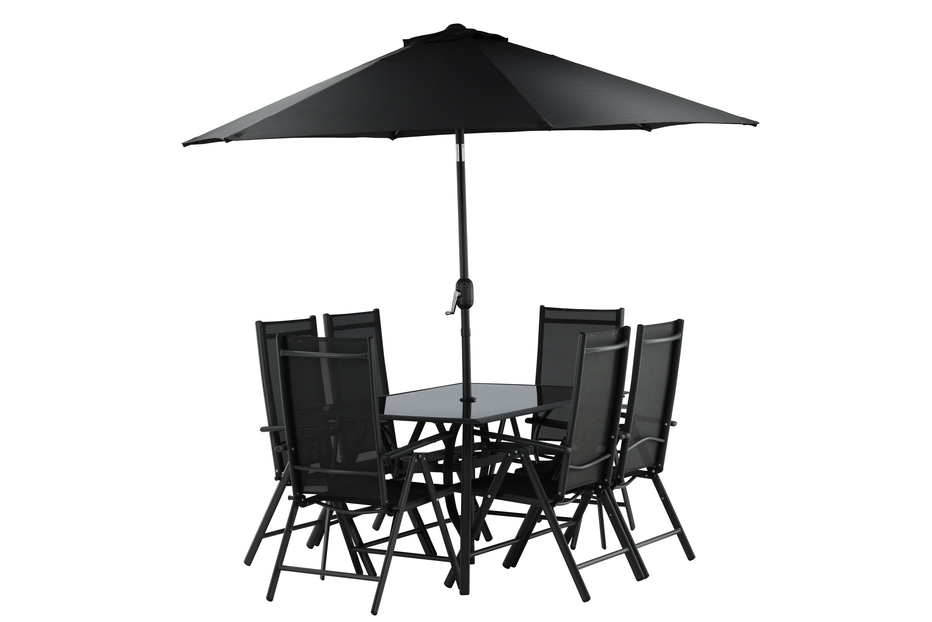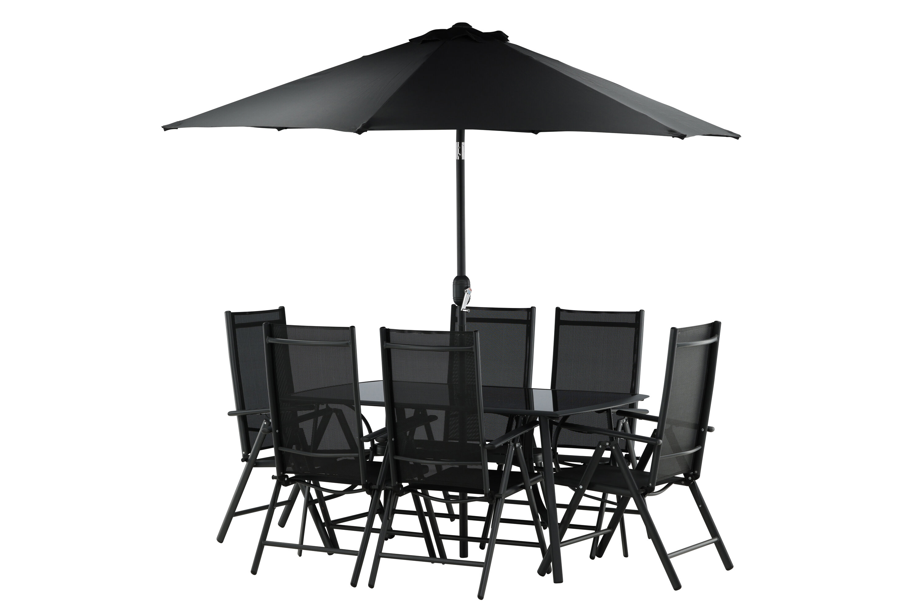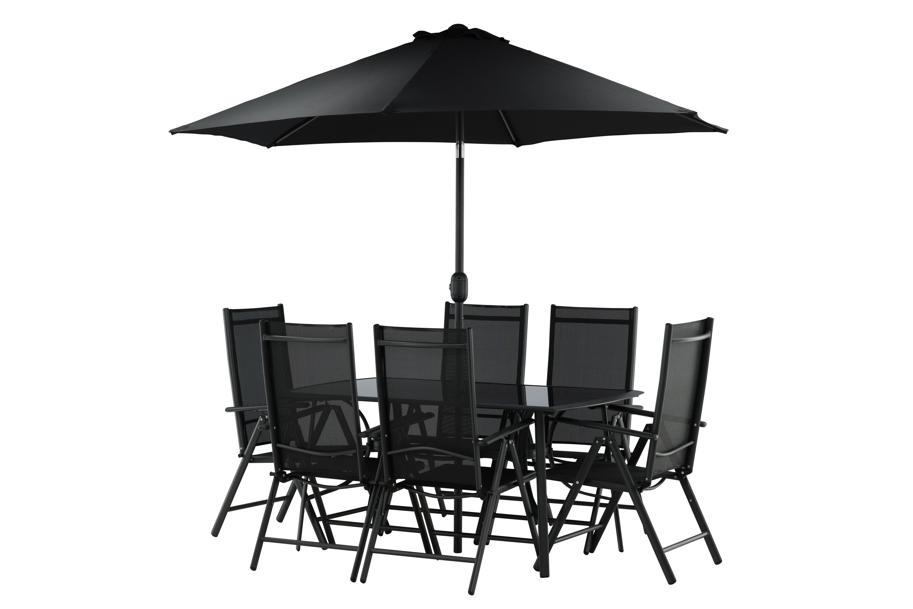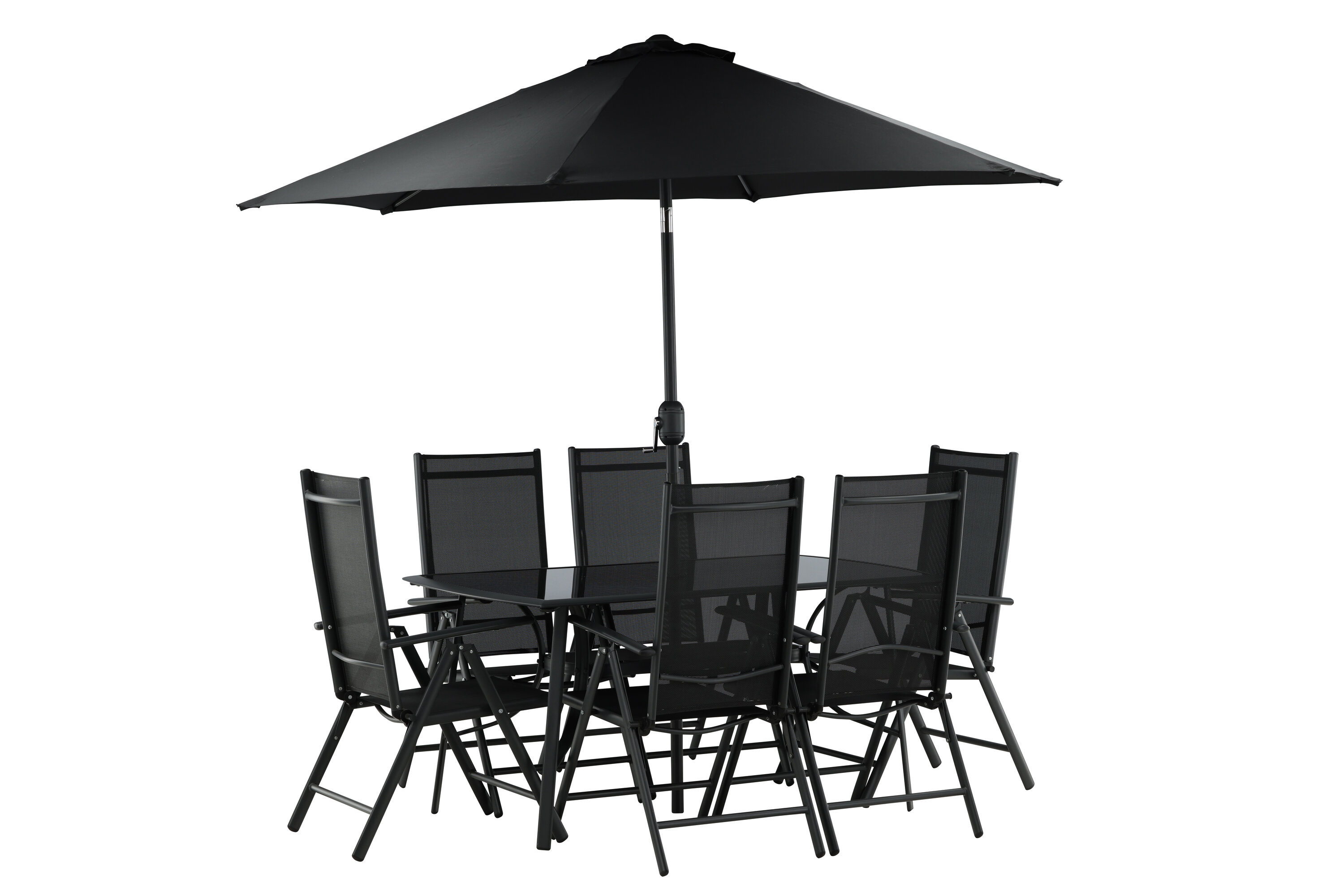 Rafraîchissez-vous à l'ombre pendant un moment dans un groupe de restauration moderne sous un parasol intelligent ! Le groupe Brekki propose à la fois une table à manger élégante avec un plateau en verre et des pieds droits en aluminium noir. Ici avec des chaises de salle à manger pliantes avec un siège en textilène noir et un cadre en aluminium. Le parasol est fixé au milieu de la table et est là pour vous protéger des rayons chauds du soleil pendant le dîner. Le parasol a un tissu noir avec un cadre en aluminium. Ça ne peut pas être mieux que ça !