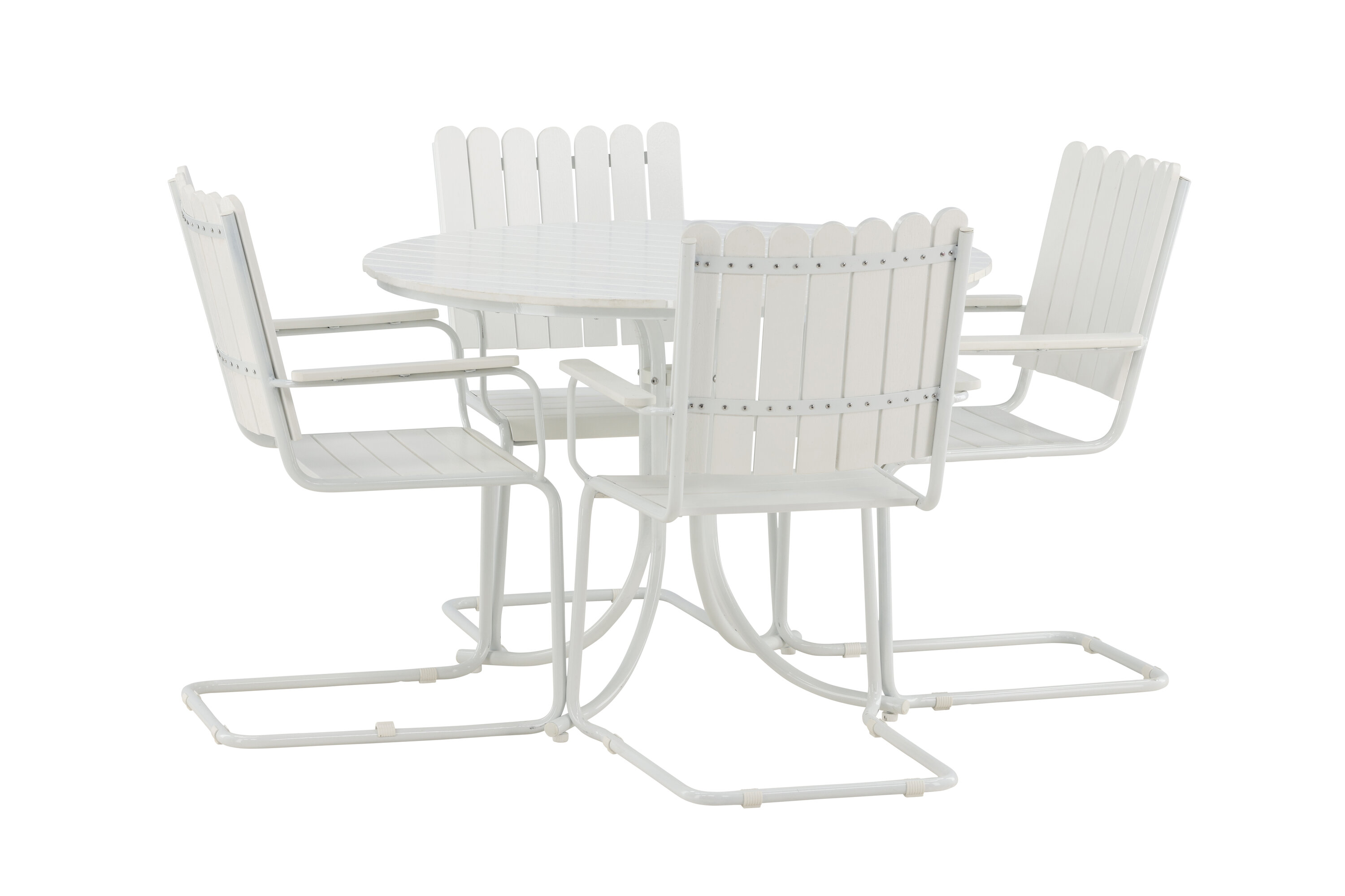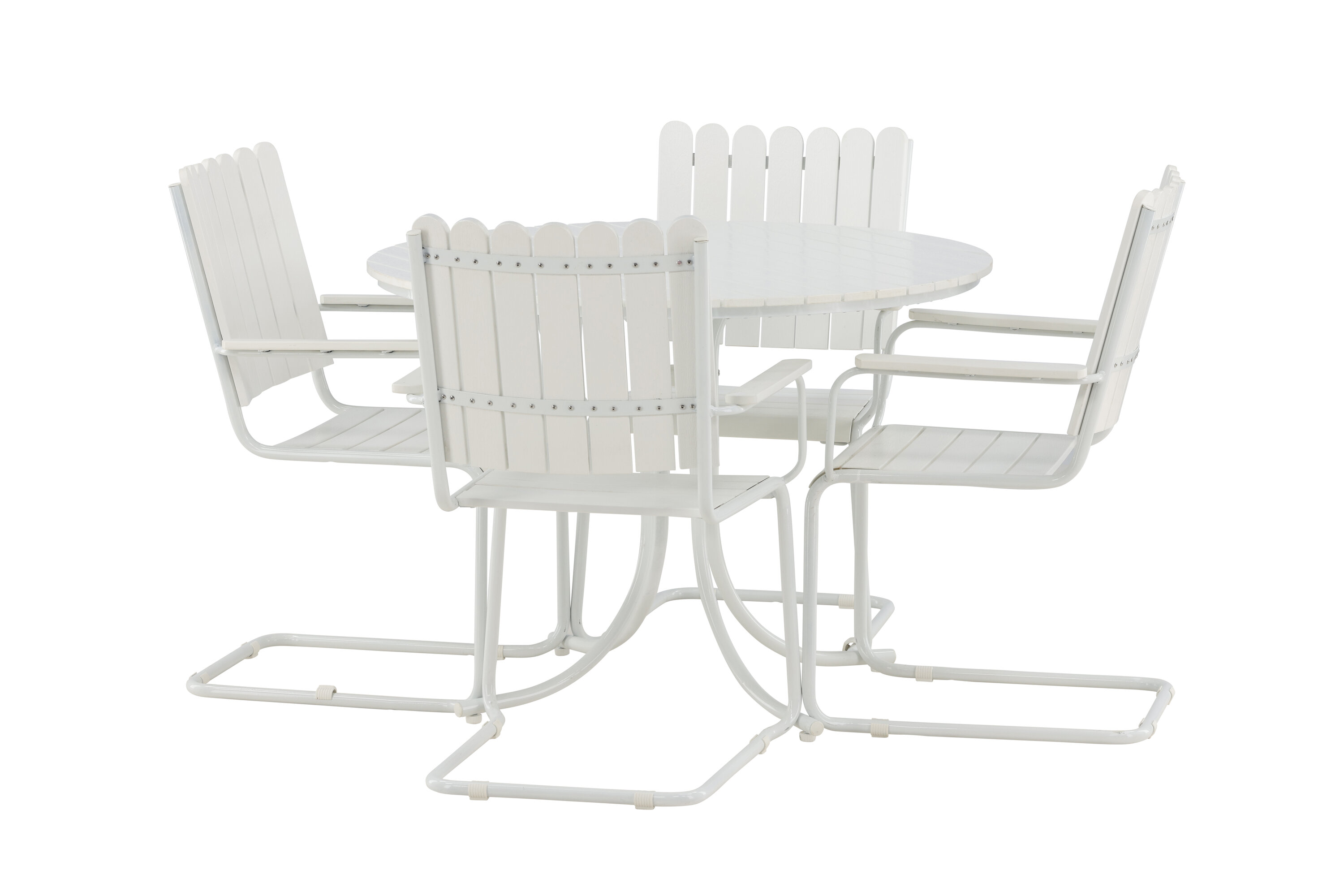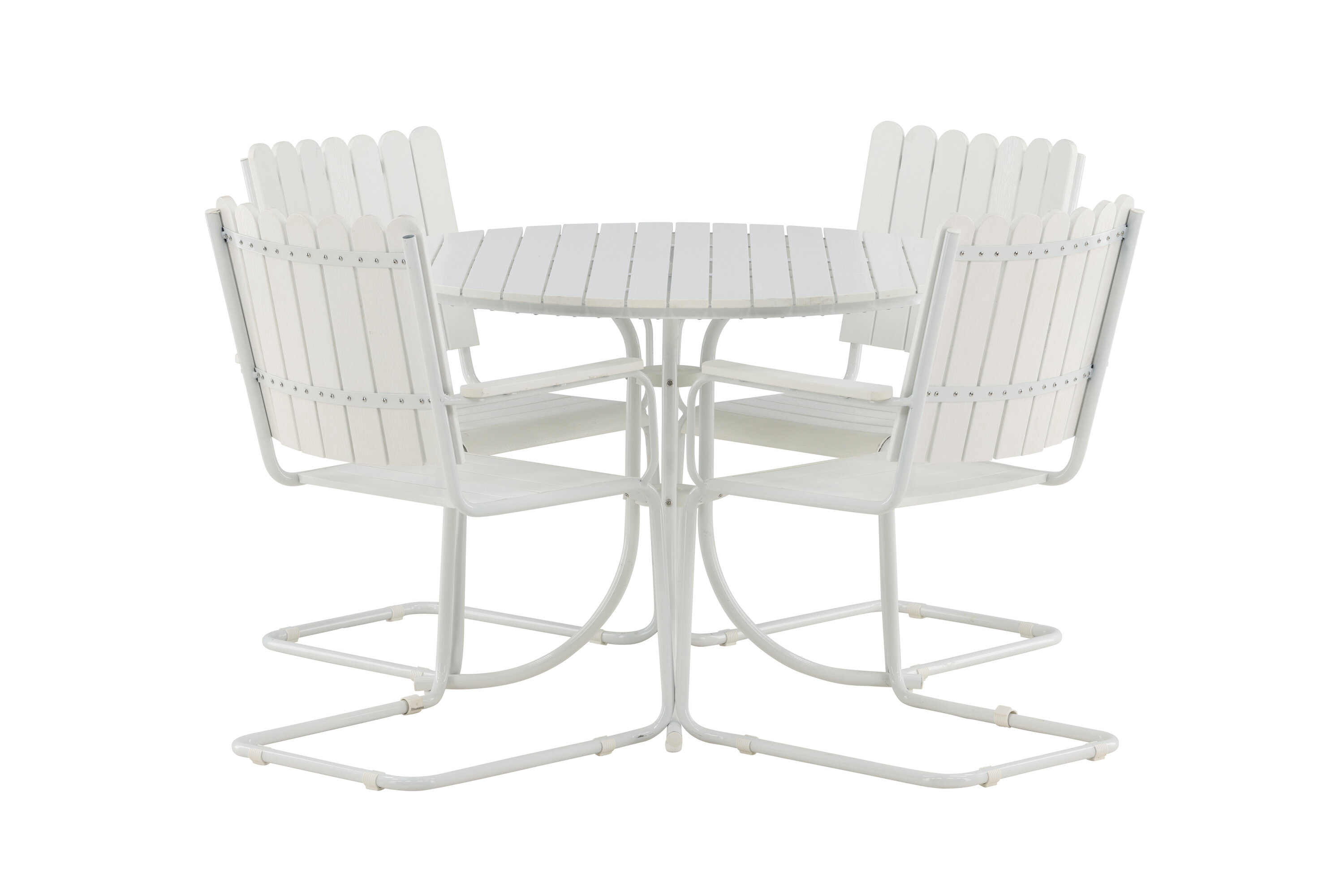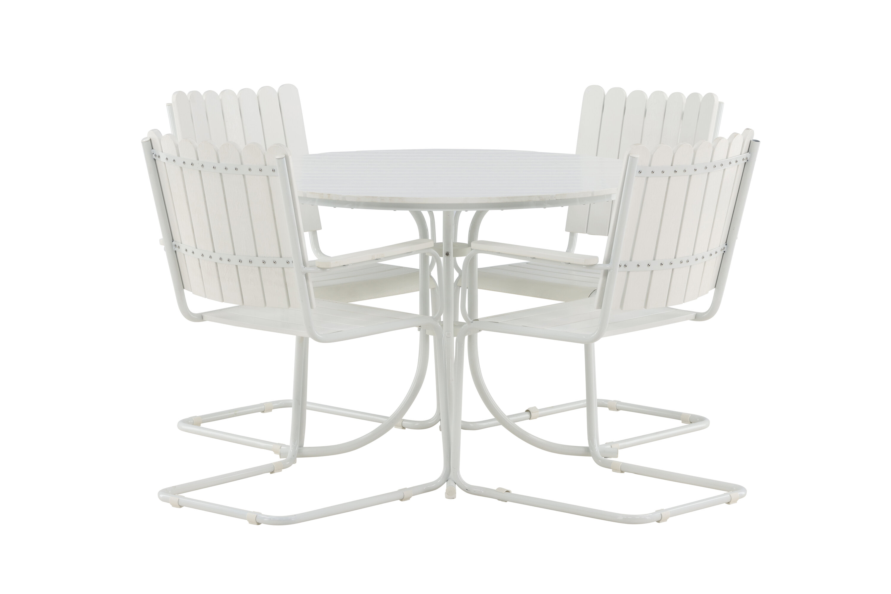 Un groupe alimentaire avec une table ronde et quatre chaises qui se balancent facilement. Les matériaux de la chaise et de la table sont l'acier et le bois d'Aint.