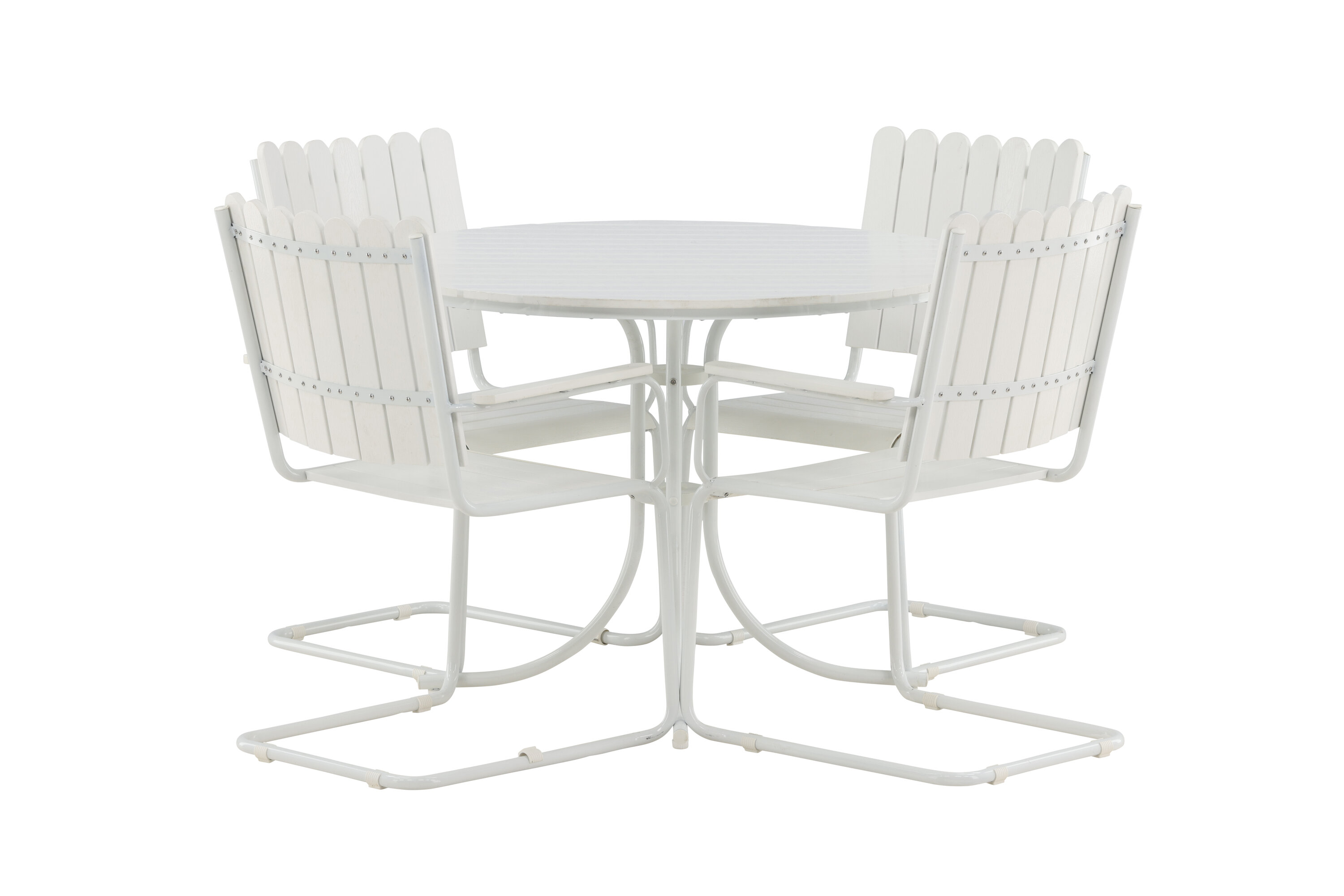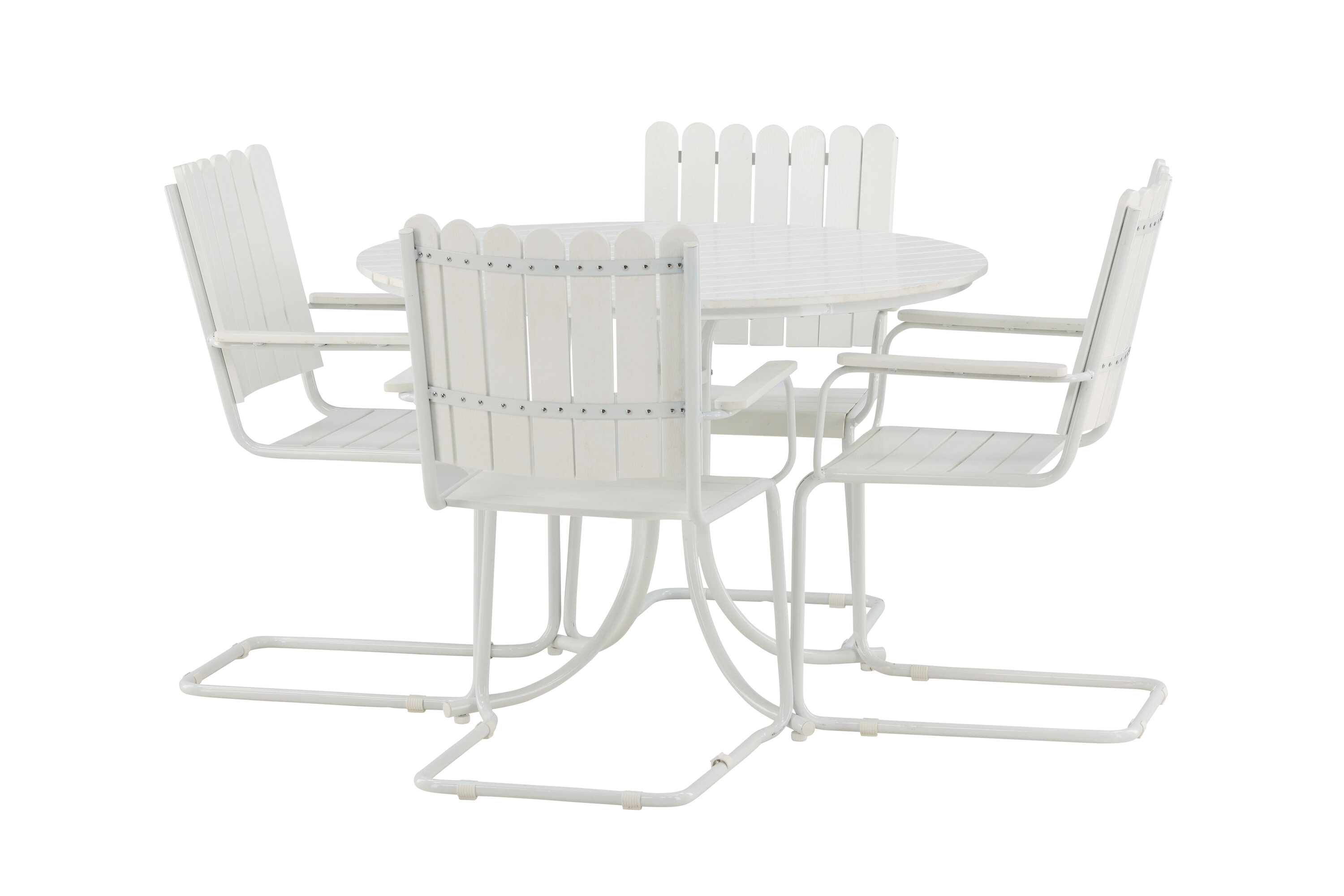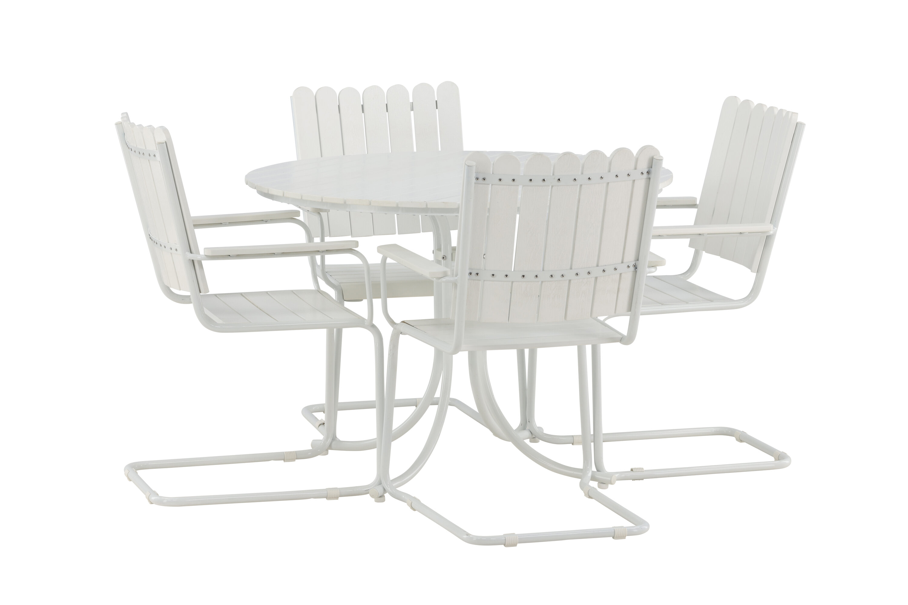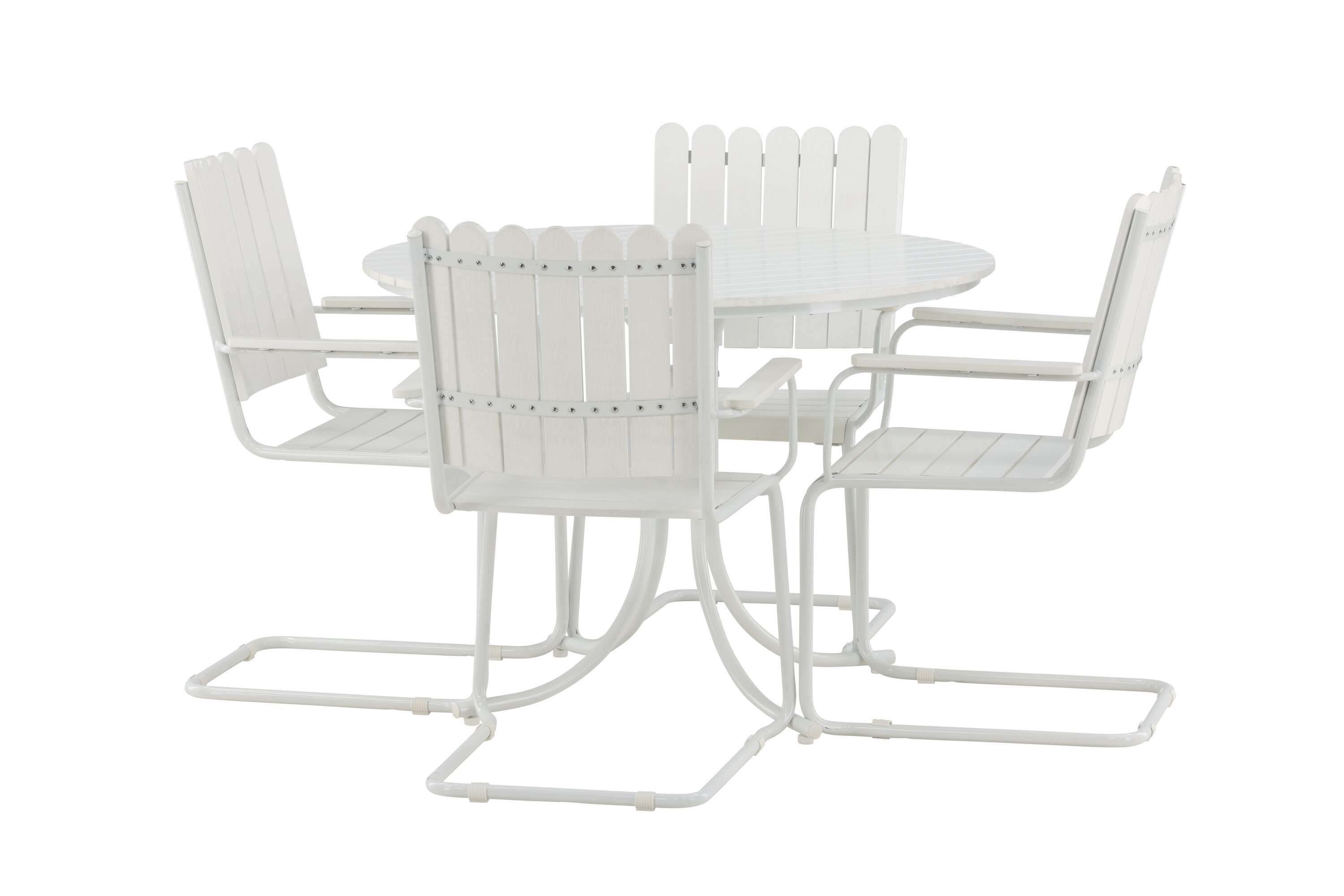 Un groupe alimentaire avec une table ronde et quatre chaises qui se balancent facilement. Les matériaux de la chaise et de la table sont l'acier et le bois d'Aint.