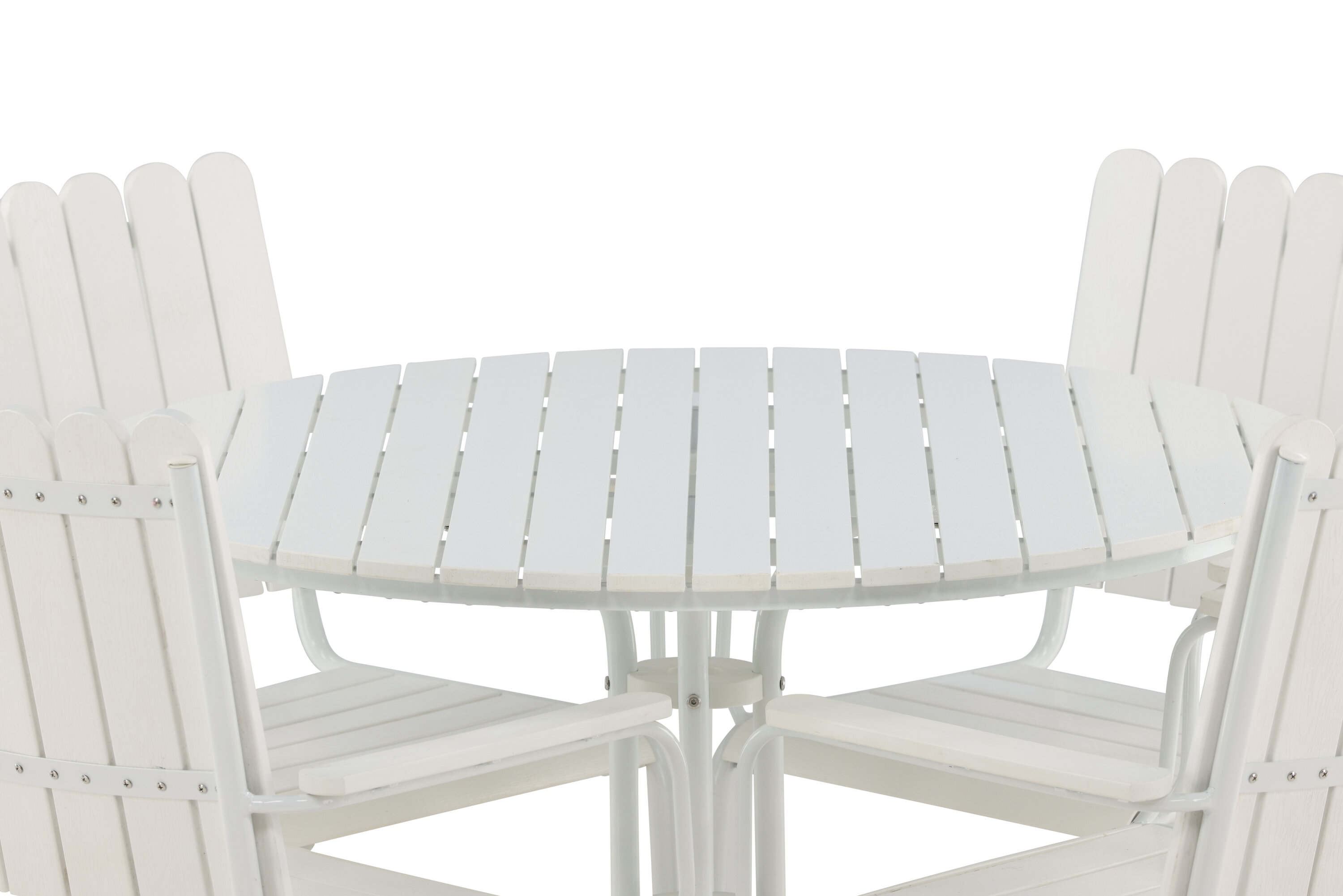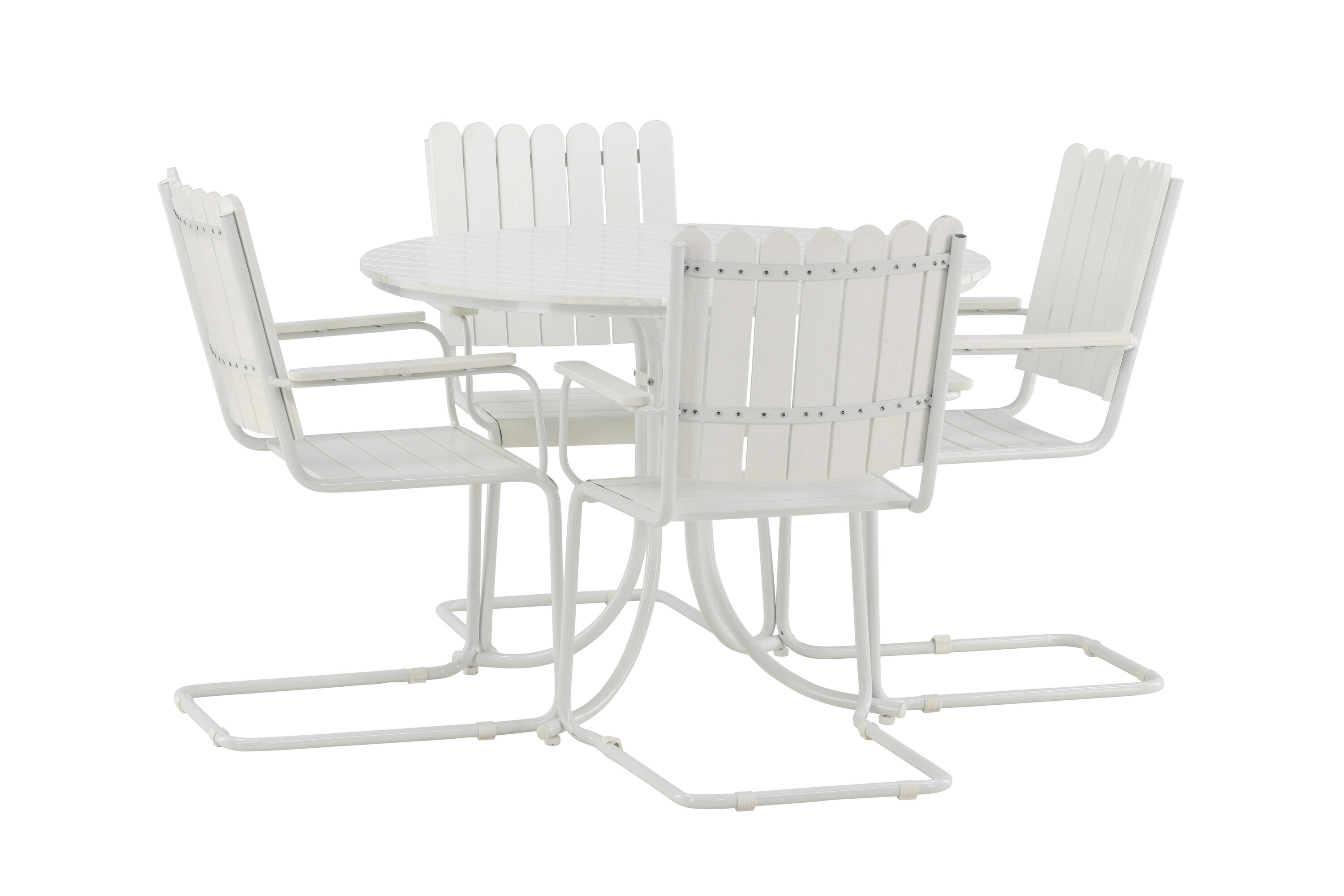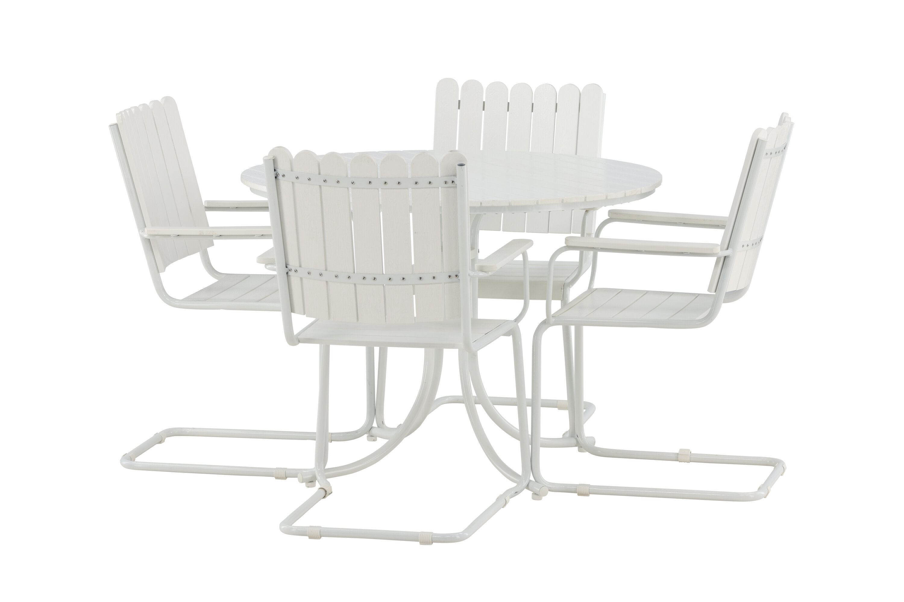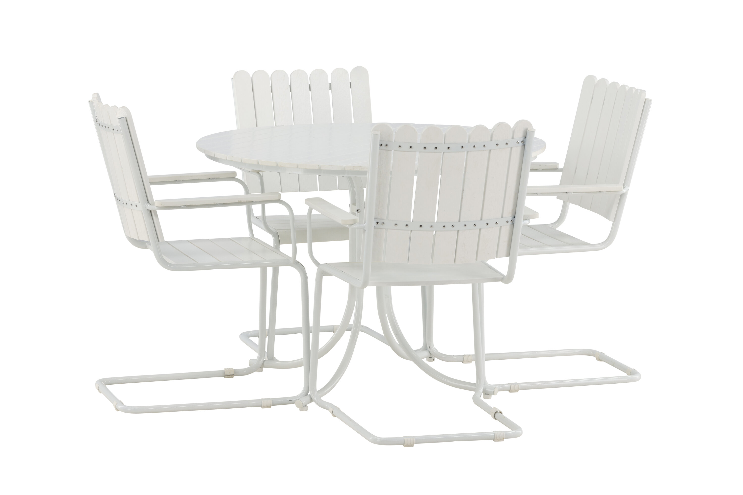 Un groupe alimentaire avec une table ronde et quatre chaises qui se balancent facilement. Les matériaux de la chaise et de la table sont l'acier et le bois d'Aint.