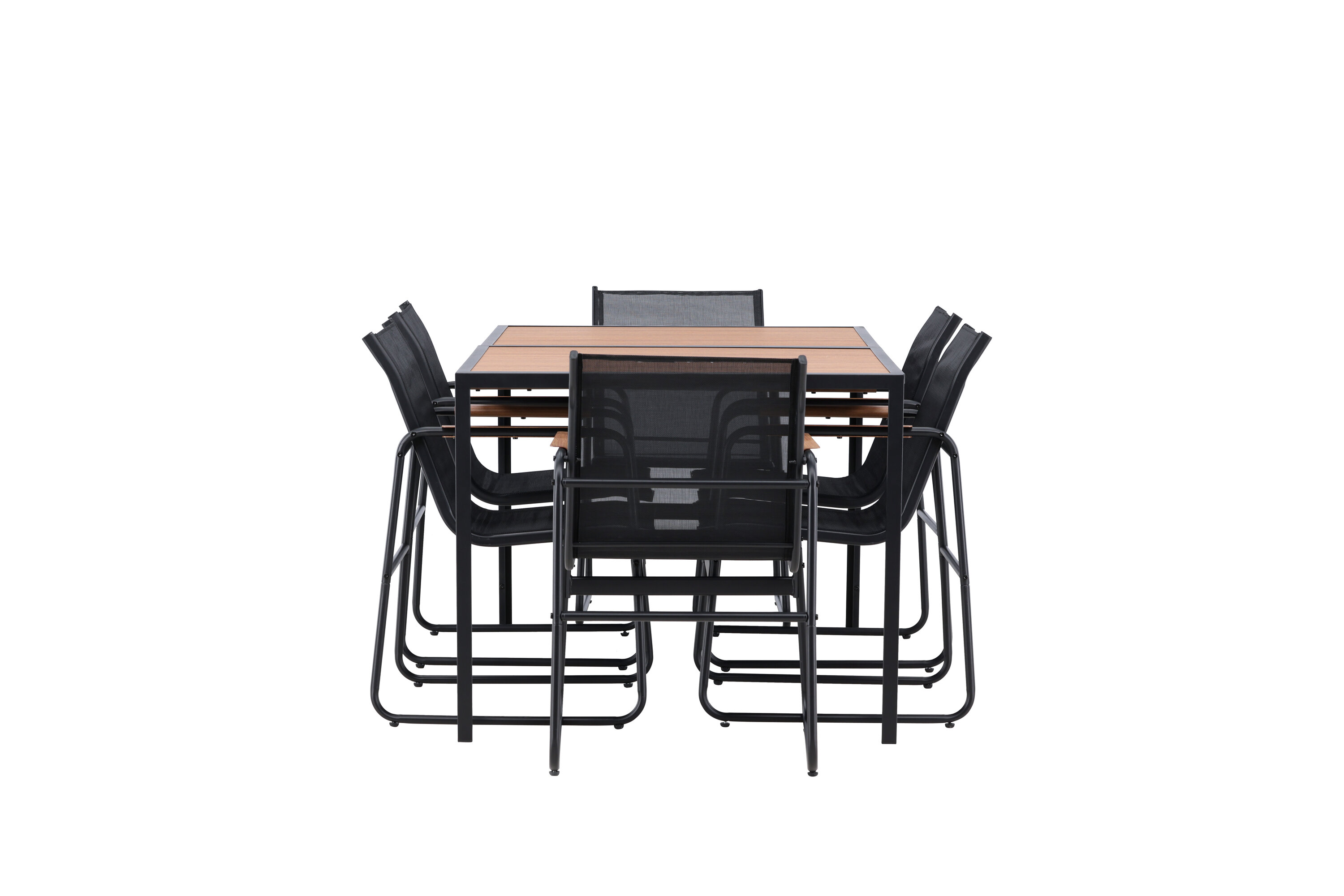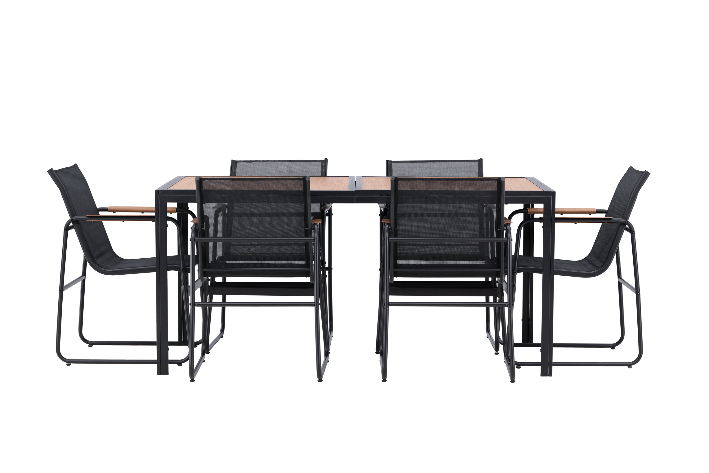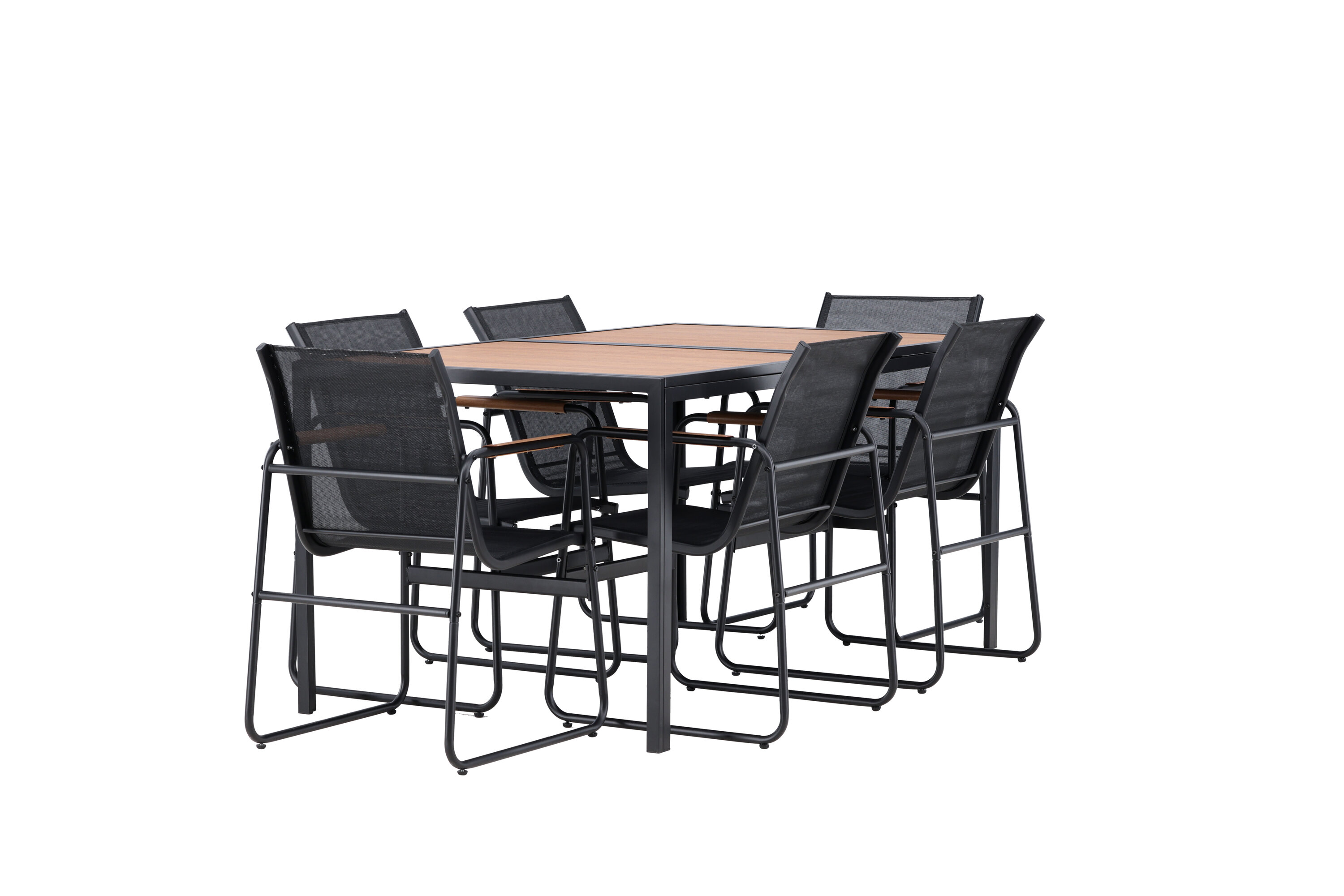 Invitez de merveilleux dîners avec style avec l'ensemble de salle à manger Lampedusa. Cet élégant ensemble de salle à manger en plein air allie durabilité et design moderne pour créer l'espace parfait pour les dîners de famille sous le ciel ouvert. La table est dotée d'un cadre en acier robuste et d'un plateau en plastique facile à entretenir qui résiste aux éléments, tandis que la combinaison de couleurs noire et marron à la mode donne une sensation intemporelle à votre patio. Les six chaises d'accompagnement ont un cadre en acier stable et un siège confortable en textilène, un matériau à la fois durable et confortable pour s'asseoir. Avec cet ensemble de salle à manger, vous obtenez une salle à manger complète et accueillante qui fait de chaque dîner une expérience mémorable – parfaite pour les longues soirées d'été !