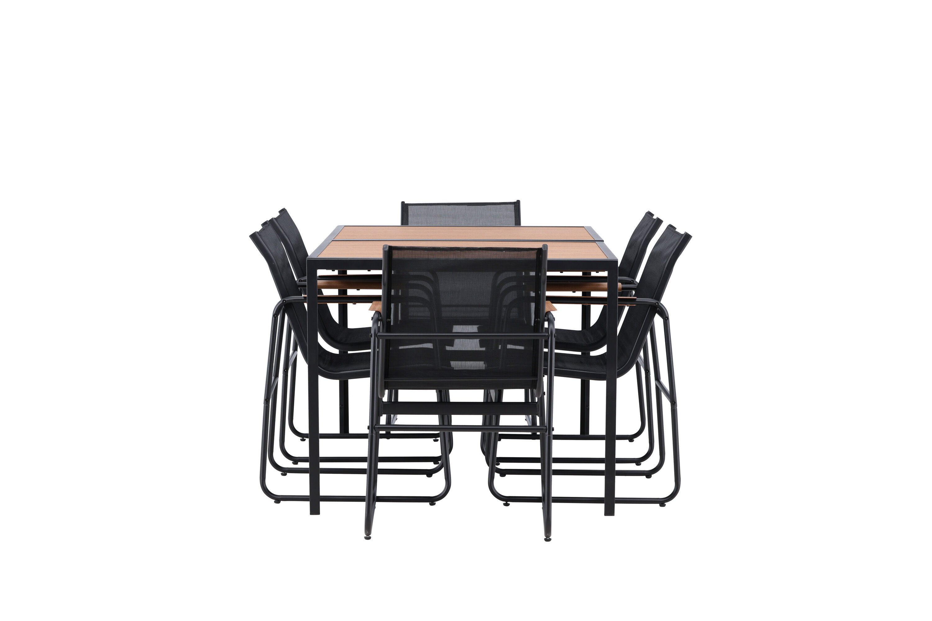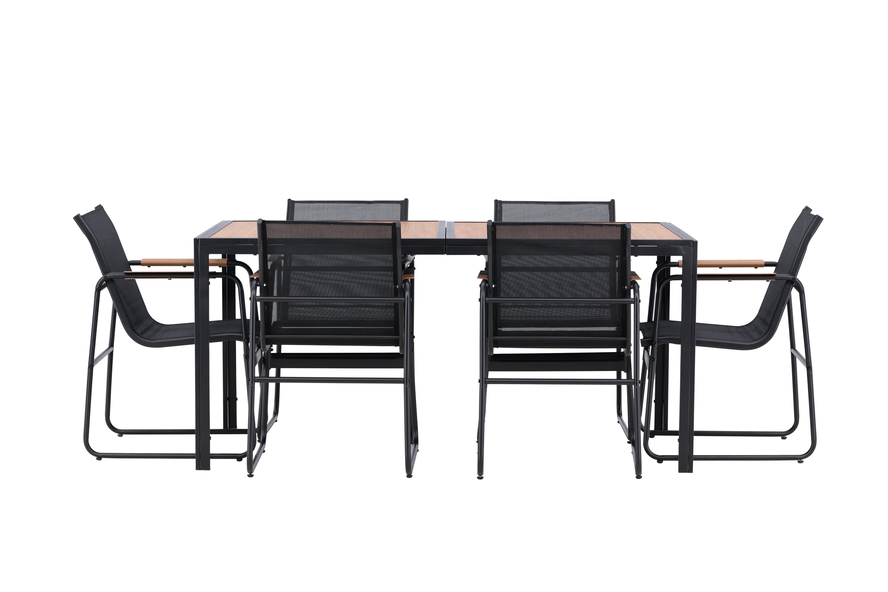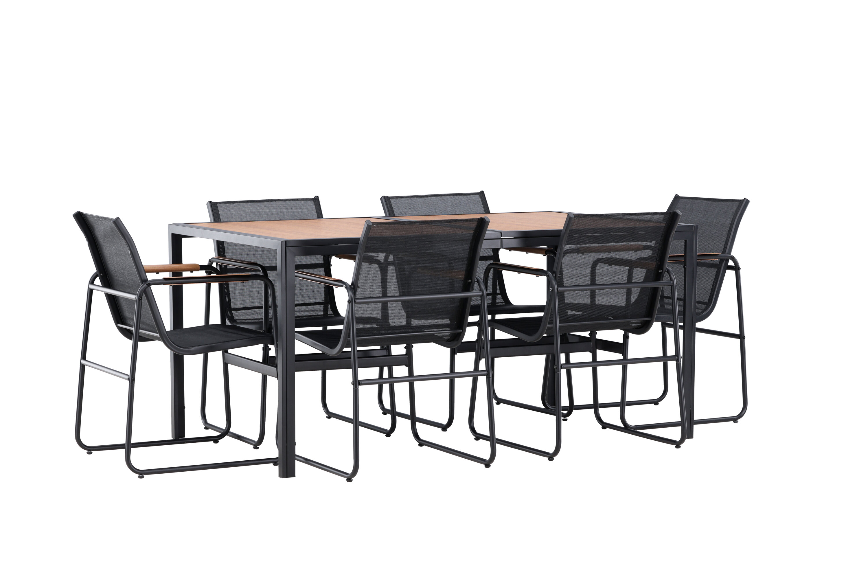 Invitez de merveilleux dîners avec style avec l'ensemble de salle à manger Lampedusa. Cet élégant ensemble de salle à manger en plein air allie durabilité et design moderne pour créer l'espace parfait pour les dîners de famille sous le ciel ouvert. La table est dotée d'un cadre en acier robuste et d'un plateau en plastique facile à entretenir qui résiste aux éléments, tandis que la combinaison de couleurs noire et marron à la mode donne une sensation intemporelle à votre patio. Les six chaises d'accompagnement ont un cadre en acier stable et un siège confortable en textilène, un matériau à la fois durable et confortable pour s'asseoir. Avec cet ensemble de salle à manger, vous obtenez une salle à manger complète et accueillante qui fait de chaque dîner une expérience mémorable – parfaite pour les longues soirées d'été !