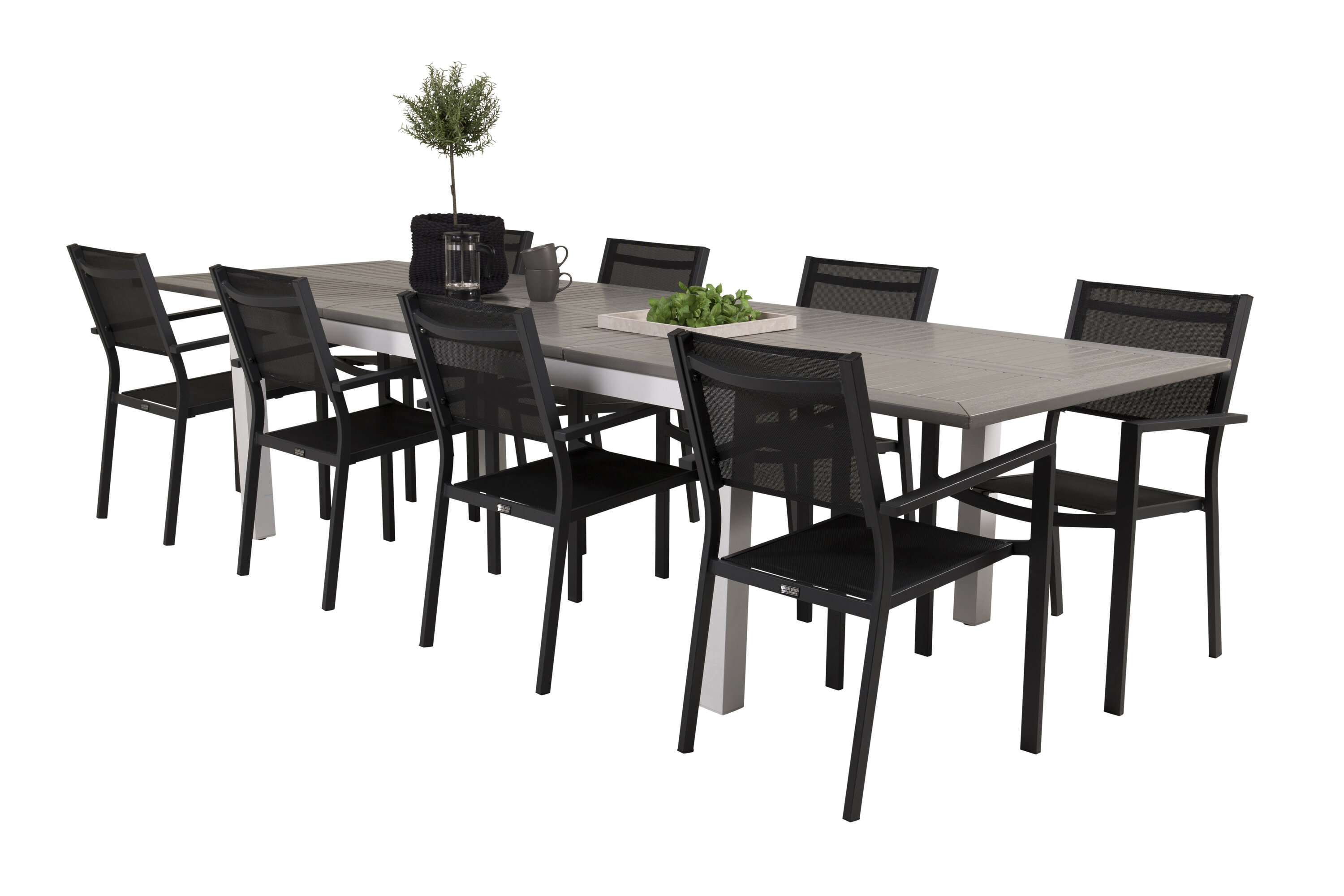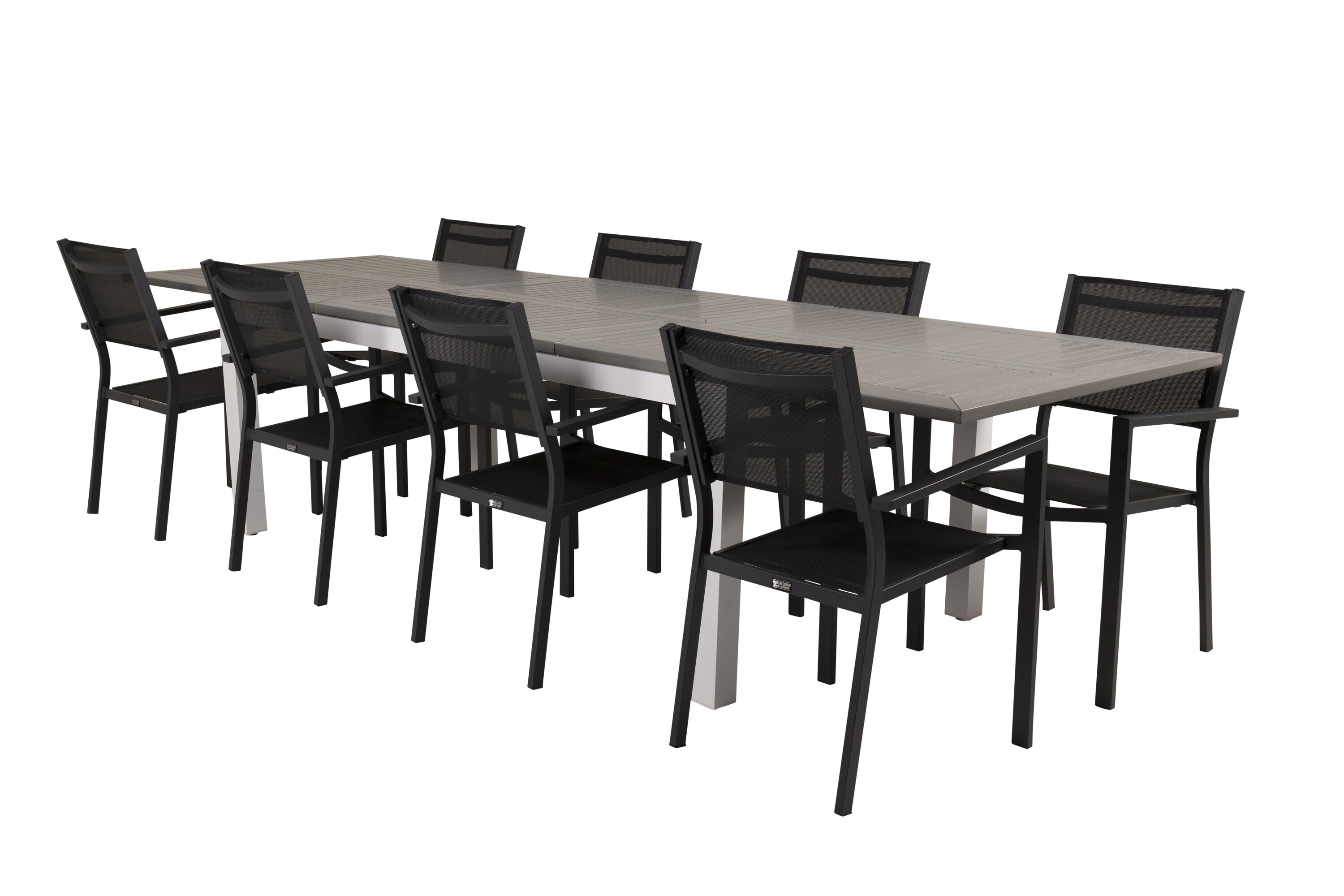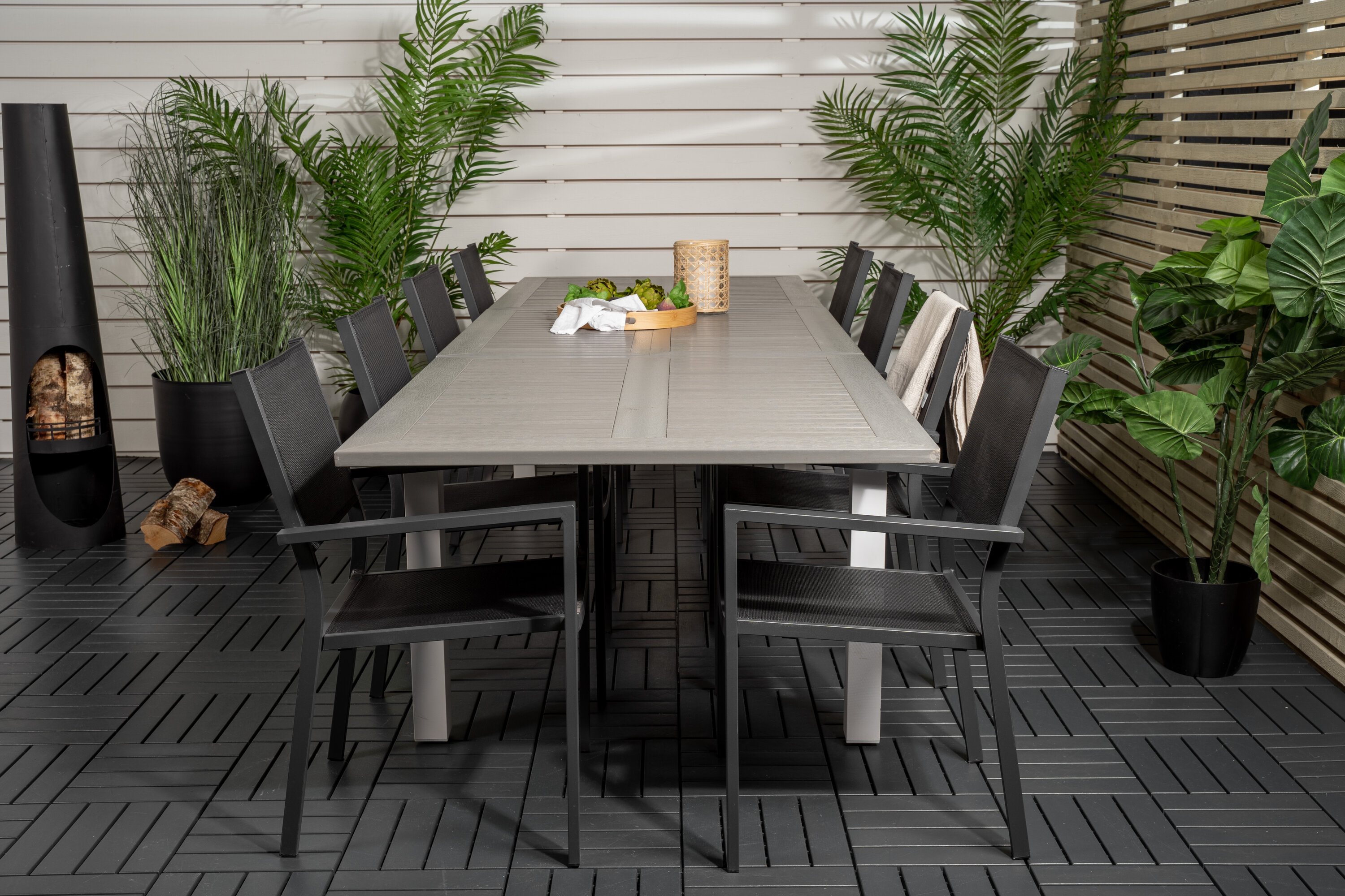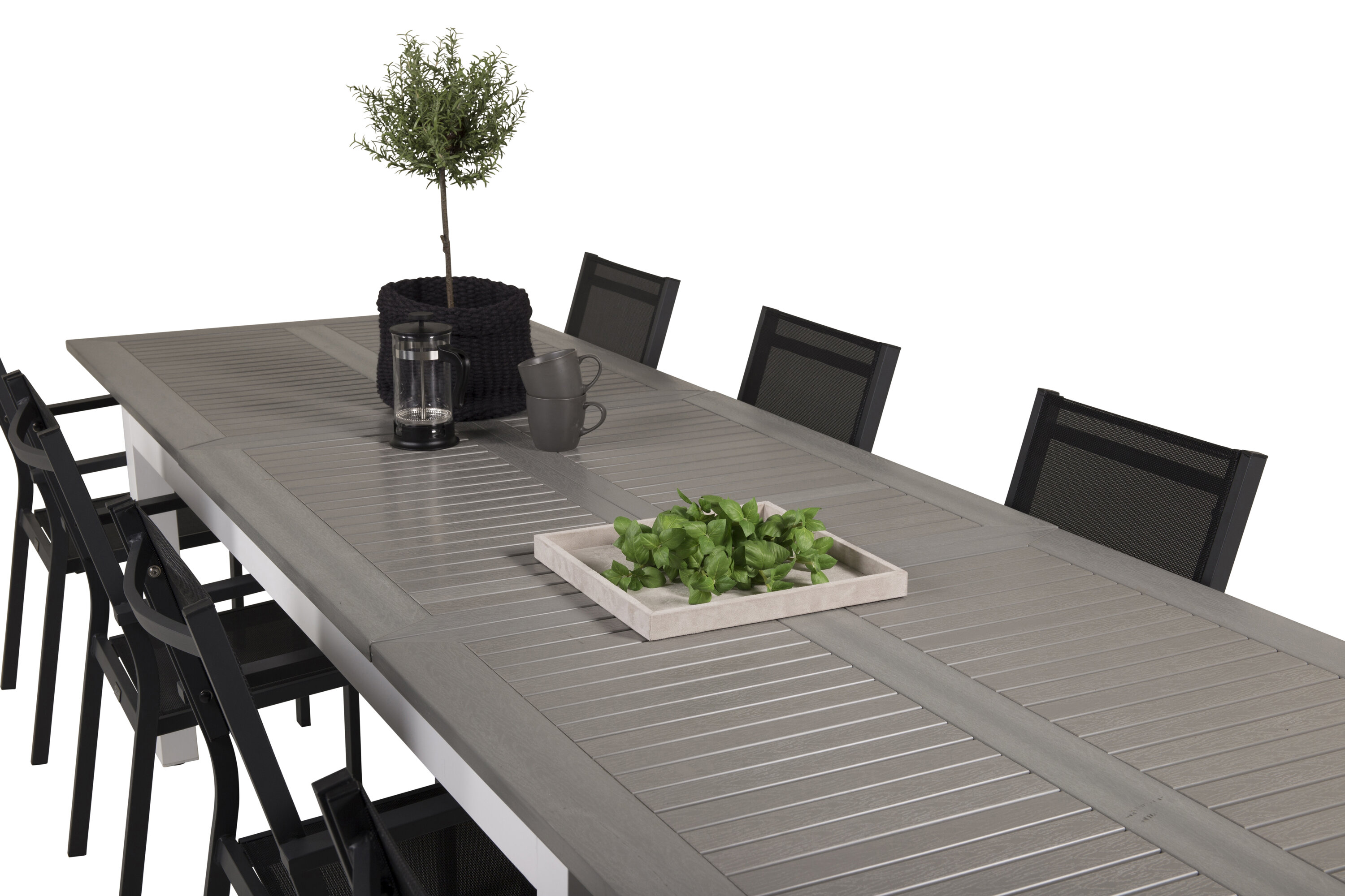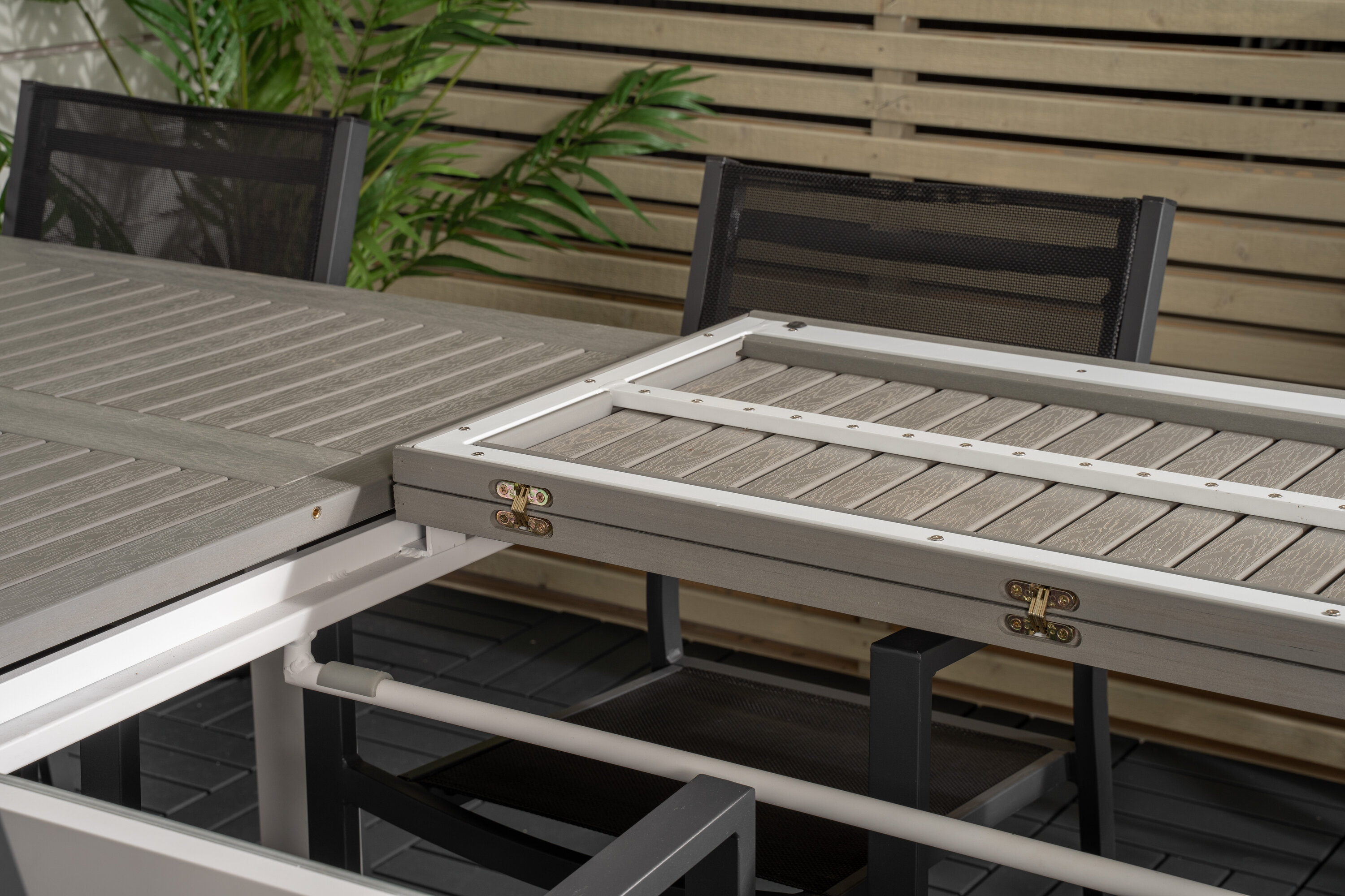 Groupe alimentaire qui s'adapte à la plupart des environnements ! Notre table à manger extensible Albany avec des chaises élégantes de la série Copacabana est faite pour ceux qui veulent créer une sensation confortable et moderne dans le jardin ou dans l'espace extérieur. Élargissez vos invitations à dîner et évitez de vous soucier de l'hébergement de tout le monde.