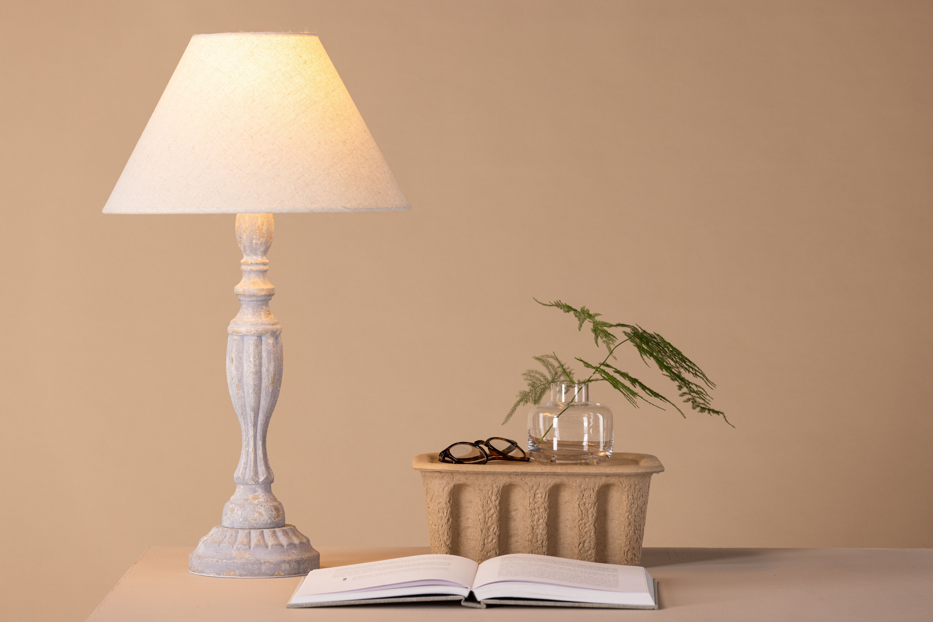 La lampe de table Caen a un châssis en bois gris avec une usure qui donne à la lampe une expression rustique. Le train de roulement a un beau design avec des formes arrondies qui créent une sensation douce. L'abat-jour est en lin et a une belle couleur beige terreux. Avec cette lampe, vous obtenez un détail intérieur élégant et une lueur agréable et la haute altitude rend la lampe parfaite à la fenêtre ou dans une commode du salon.