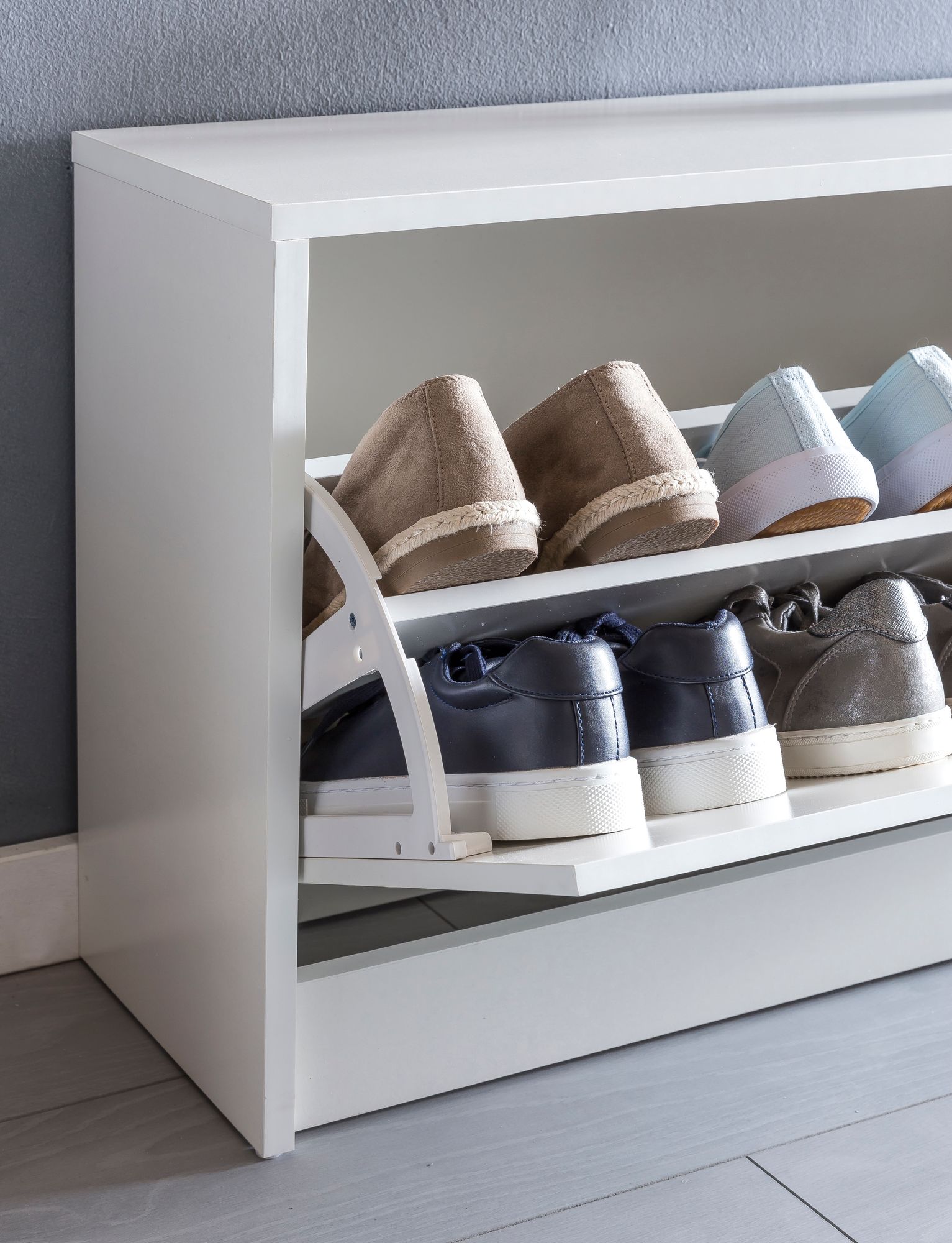 Cette banc à chaussures en bois blanc offre un design moderne et épuré, idéal pour l'entrée. Son compartiment à porte basculante divisé en deux niveaux optimise le rangement de vos chaussures tout en fournissant une large surface d'assise et un espace pratique pour clés ou lunettes.