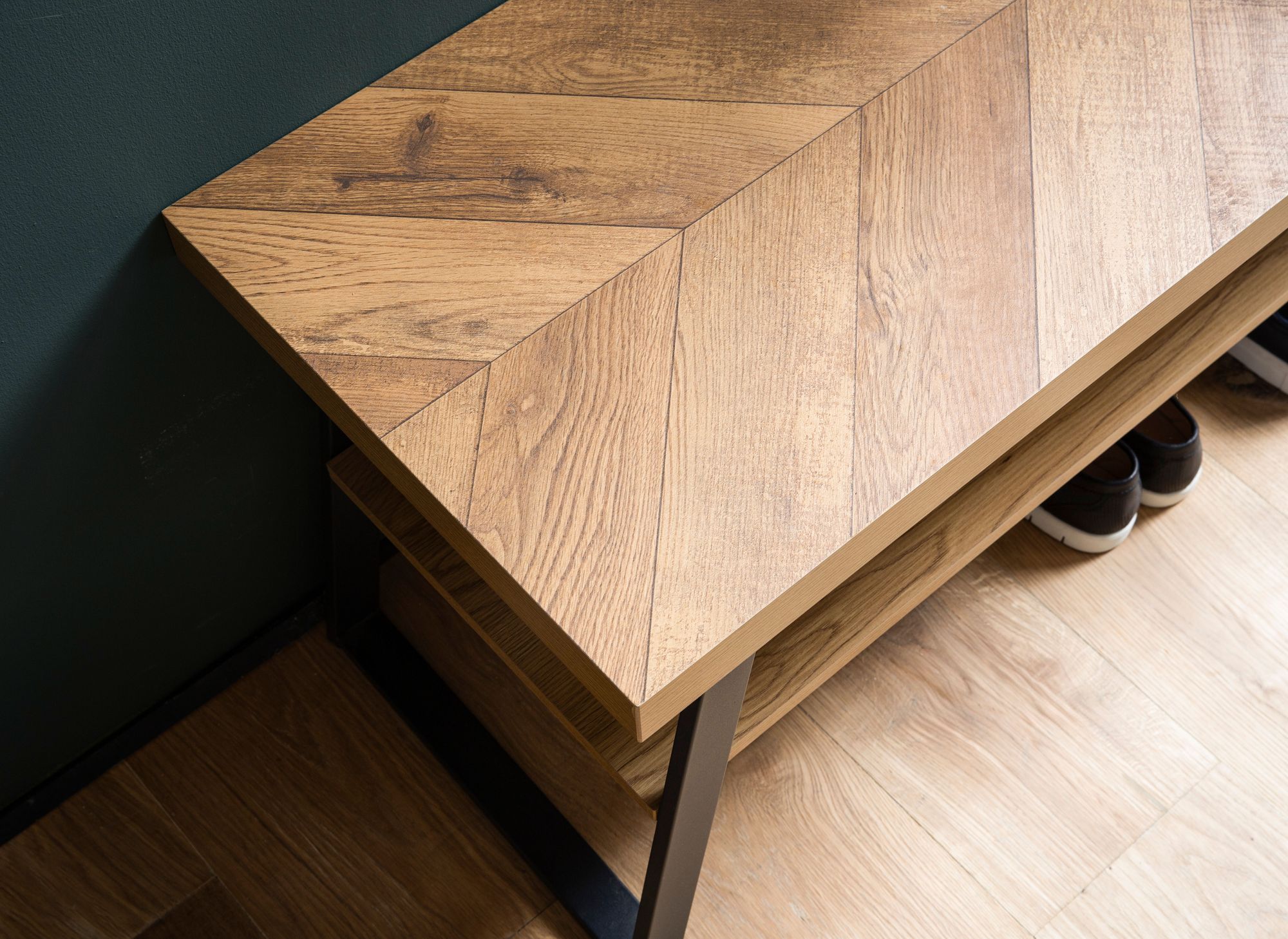 Banc de rangement décor chêne motifs chevrons | Métal noir | 100x41x40 cm