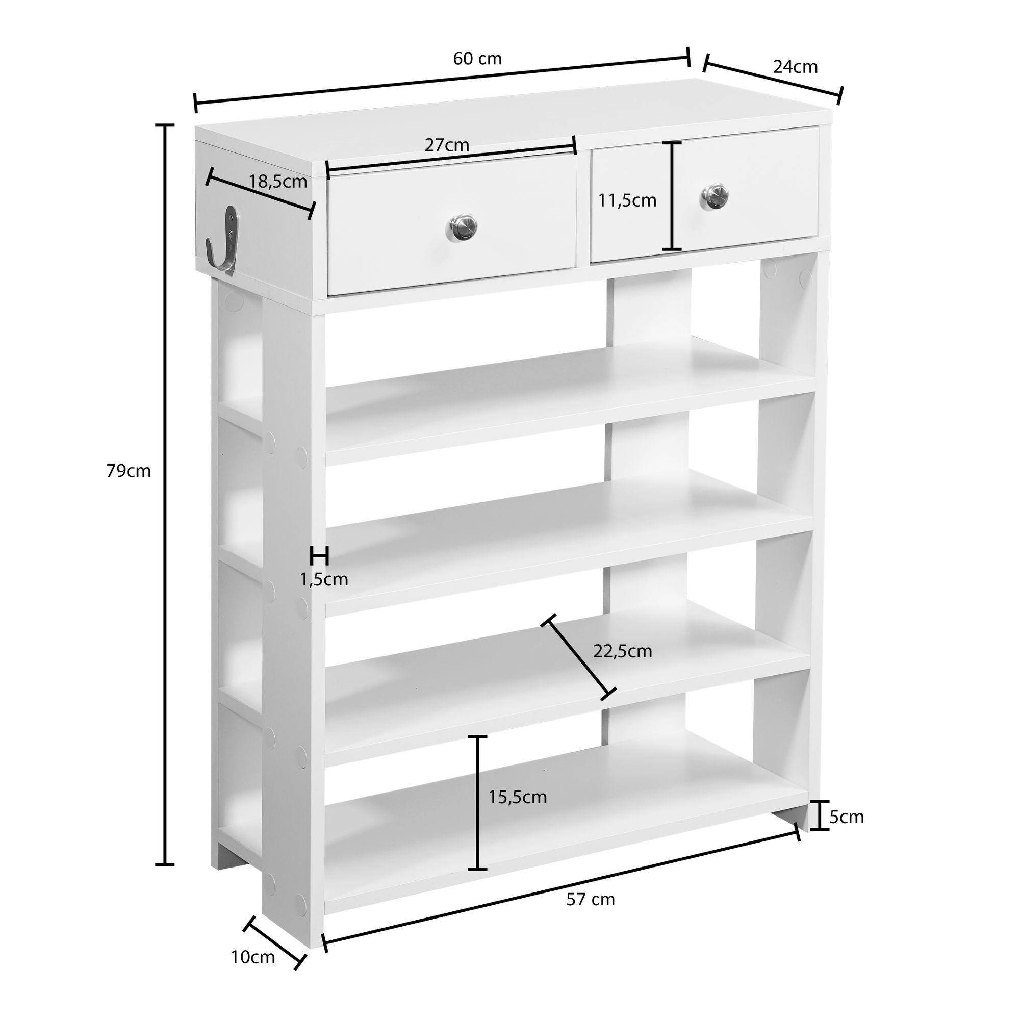 Informations sur le produit "Étagère à chaussures Design Blanc | 60x79x24 cm | 2 tiroirs, 4 compartiments, meuble d'entrée"