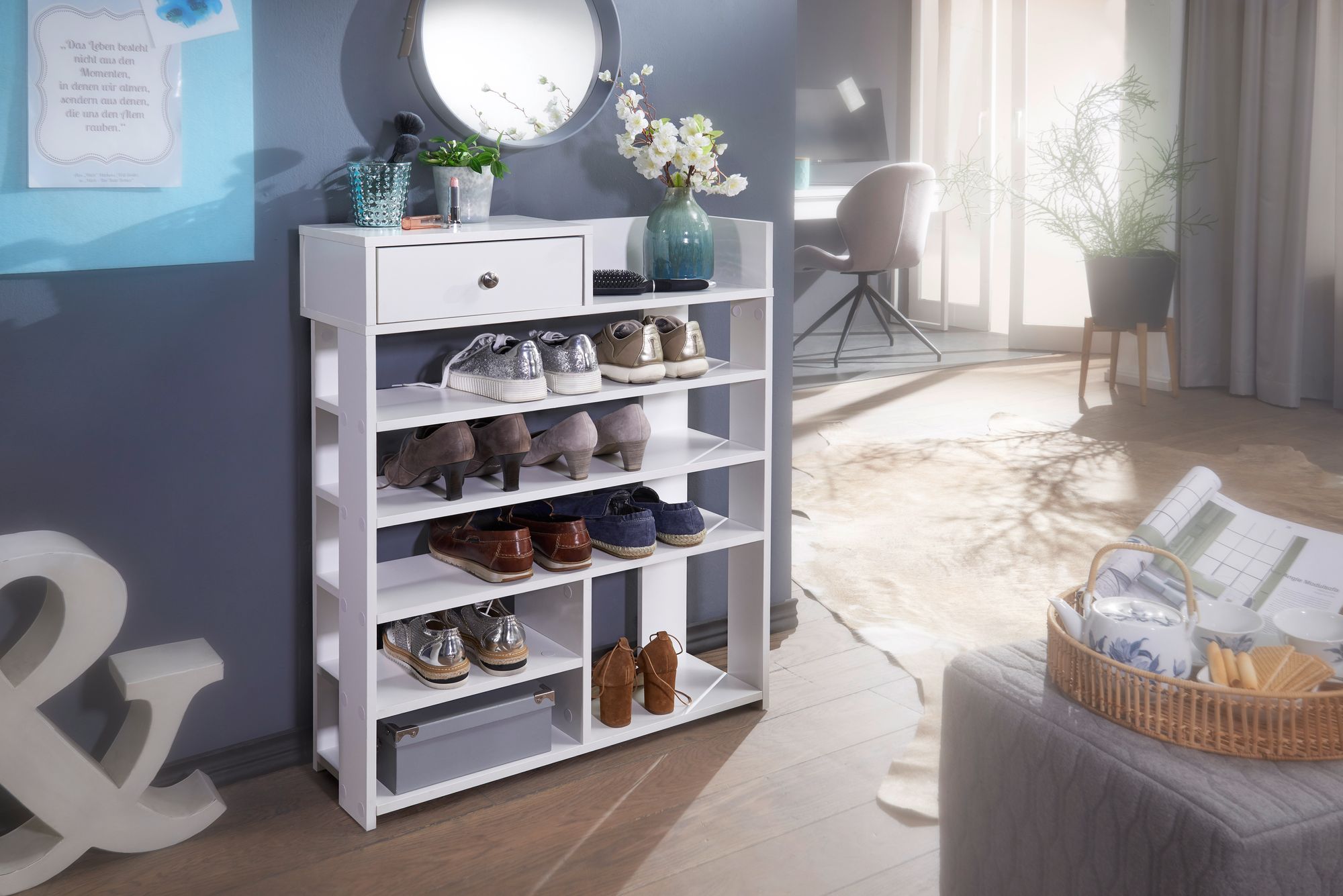 Meuble à chaussures blanc en panneaux de particules 75 x 92,5 x 24 cm | 7 compartiments avec tiroir | Design moderne