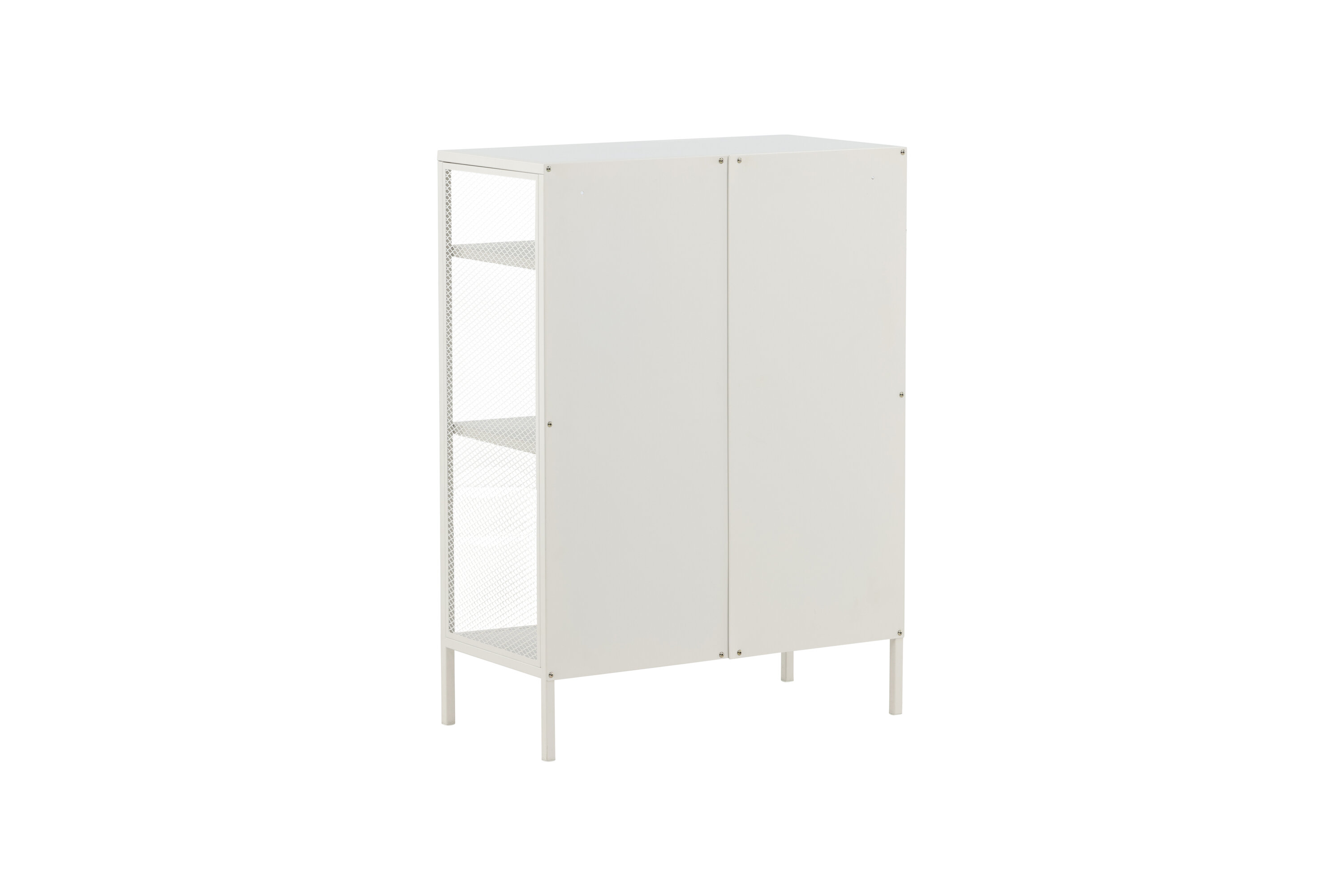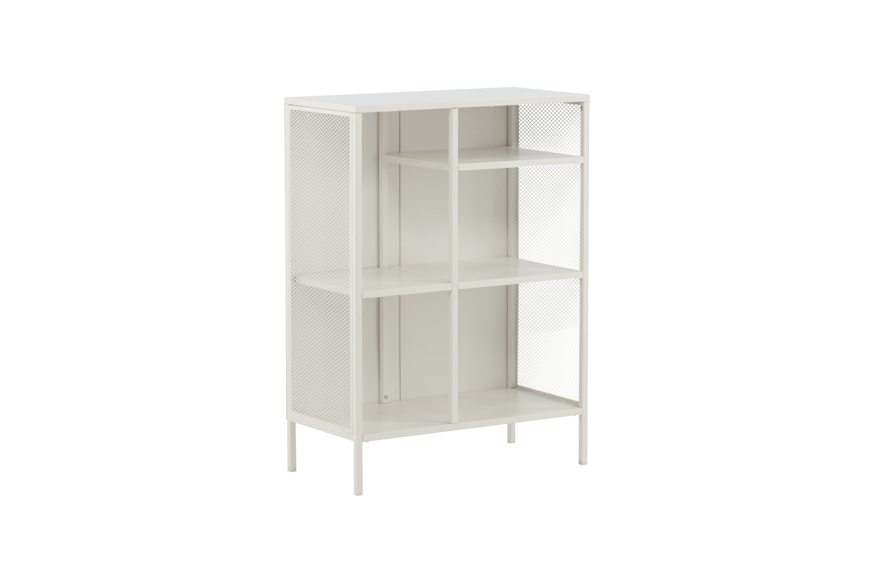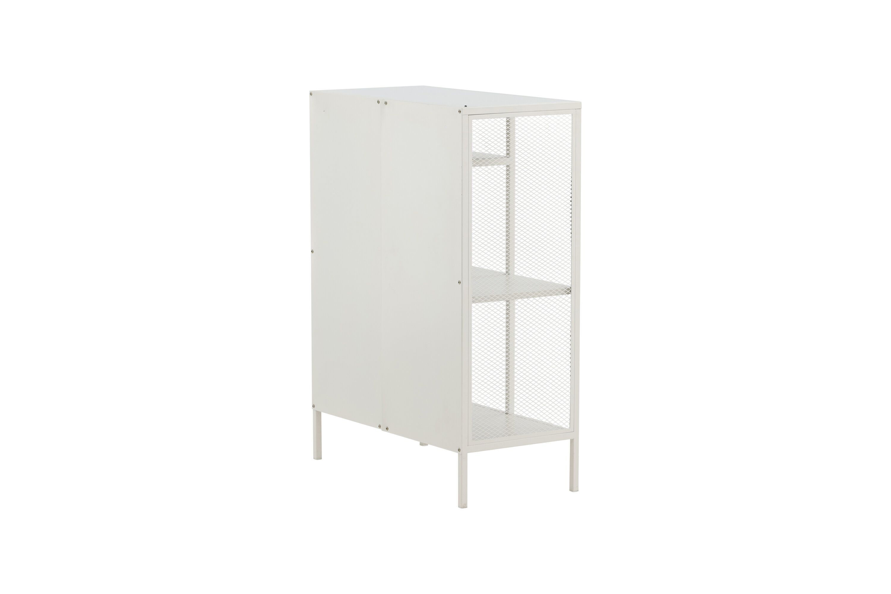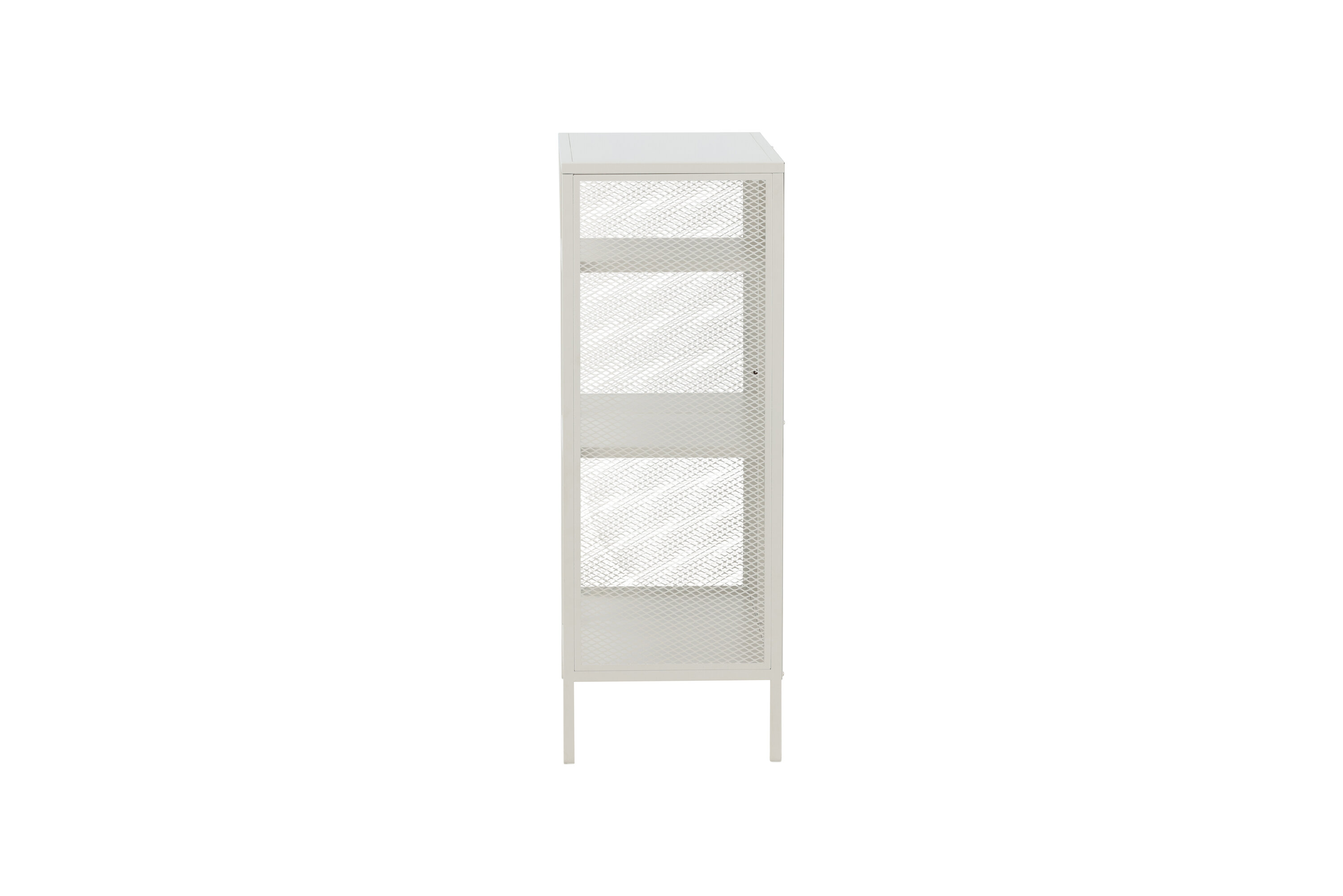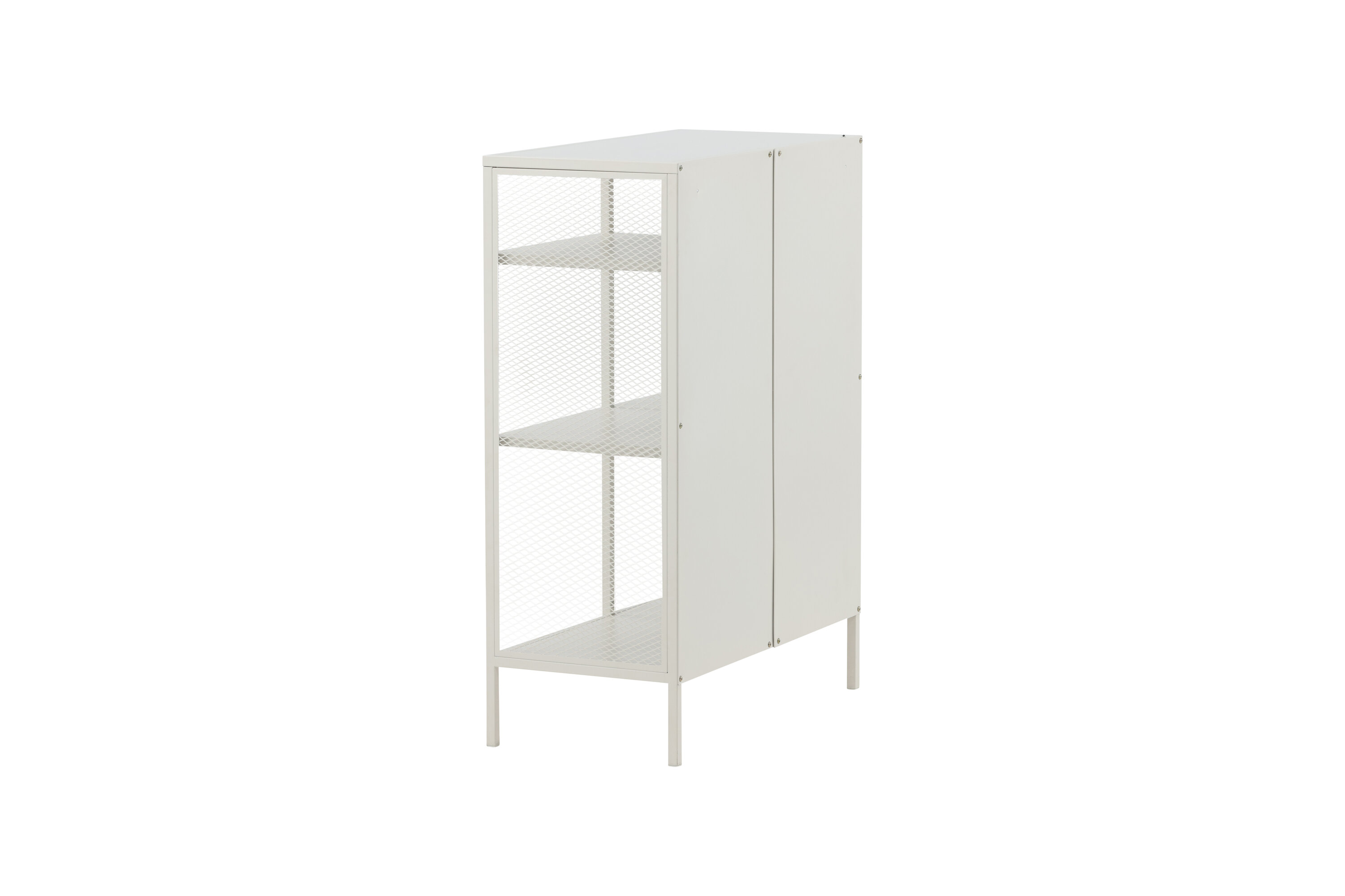 Misha, dans un design industriel robuste en acier blanc revêtu de poudre avec trois surfaces en relief à différentes hauteurs. Filets sur les côtés de l'armoire pour une touche supplémentaire, reposant sur 4 pieds blancs revêtus de poudre en acier. Dimensions : Longueur : 80 cm, largeur : 40 cm, hauteur : 110 cm. Un assemblage plus léger est requis.