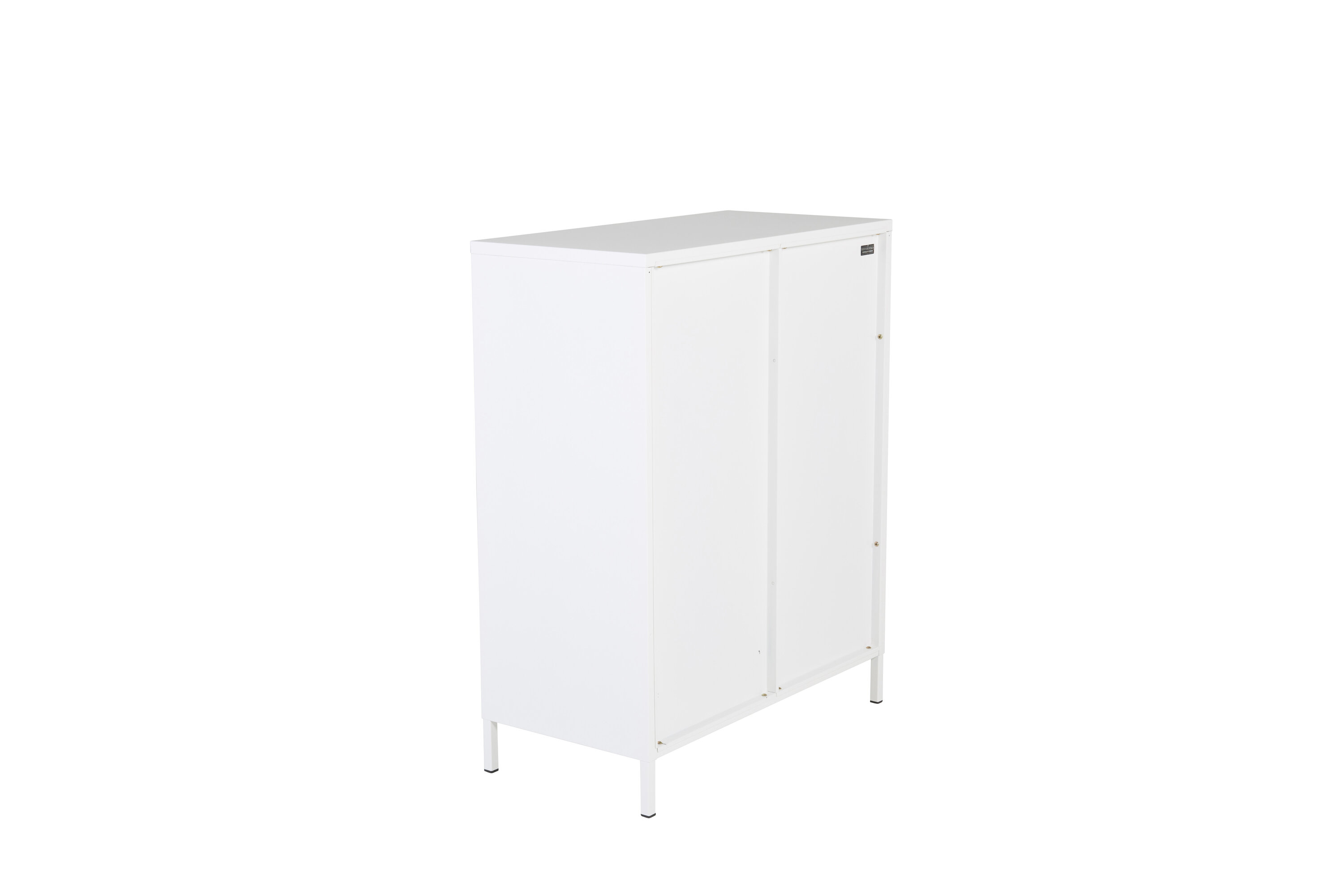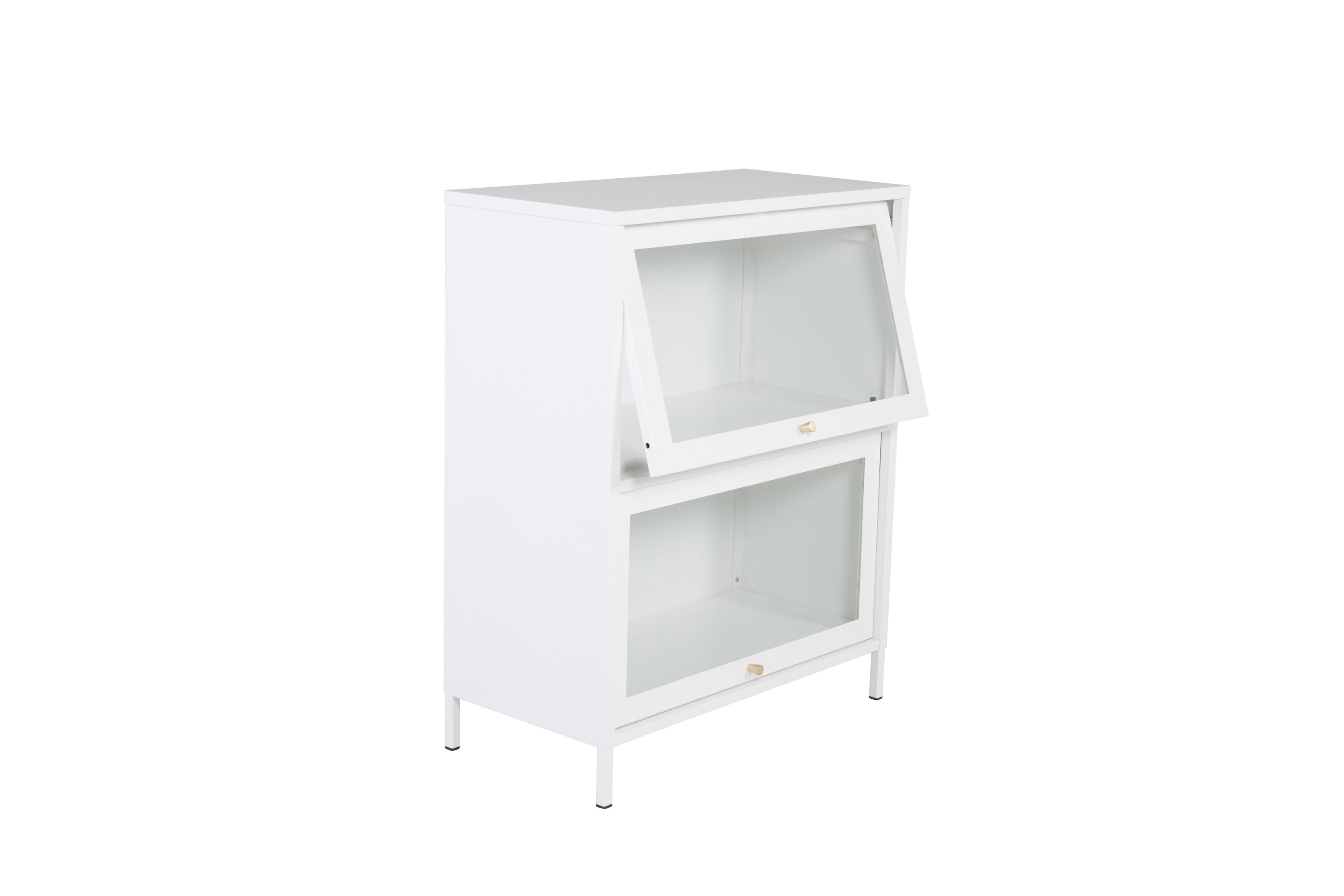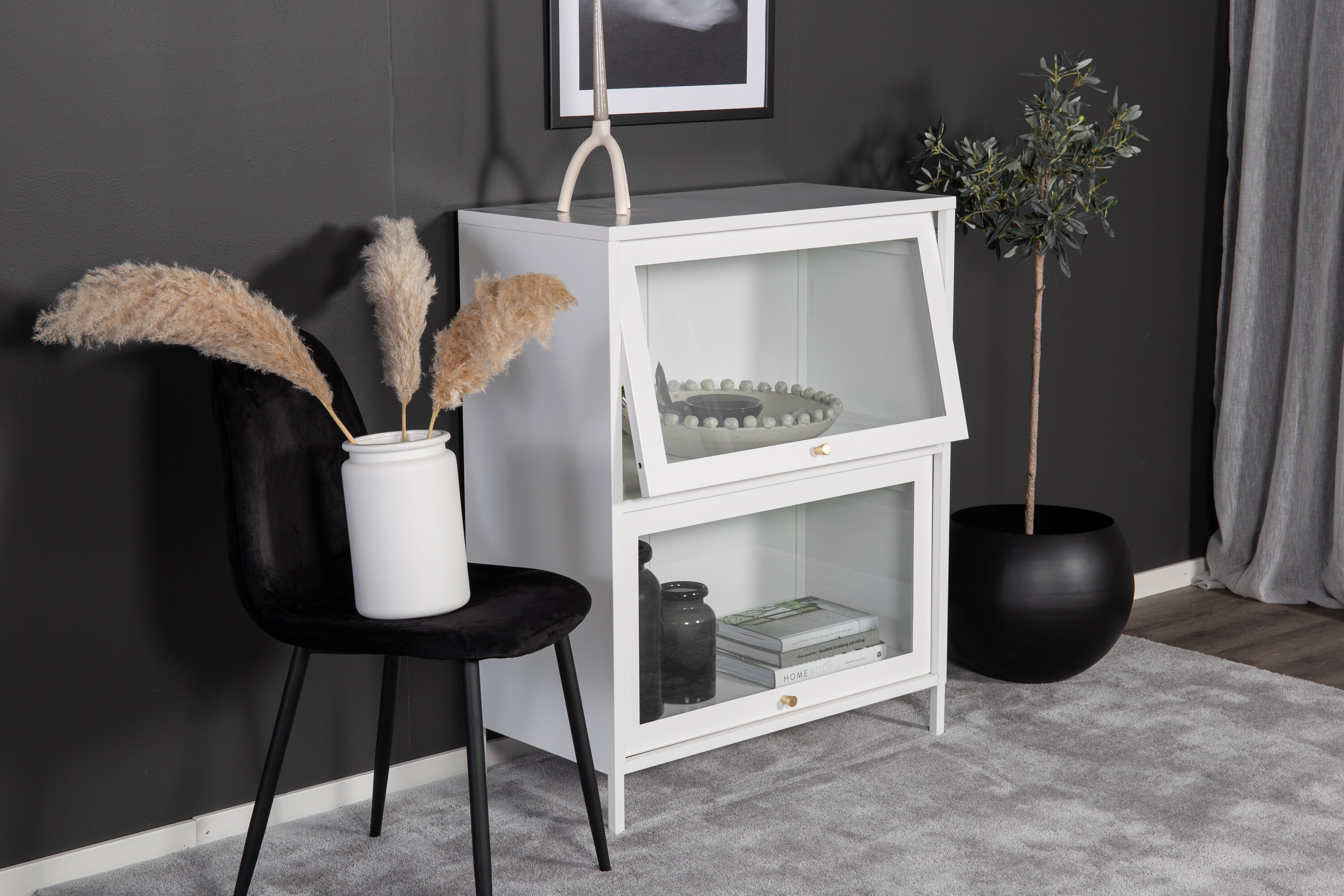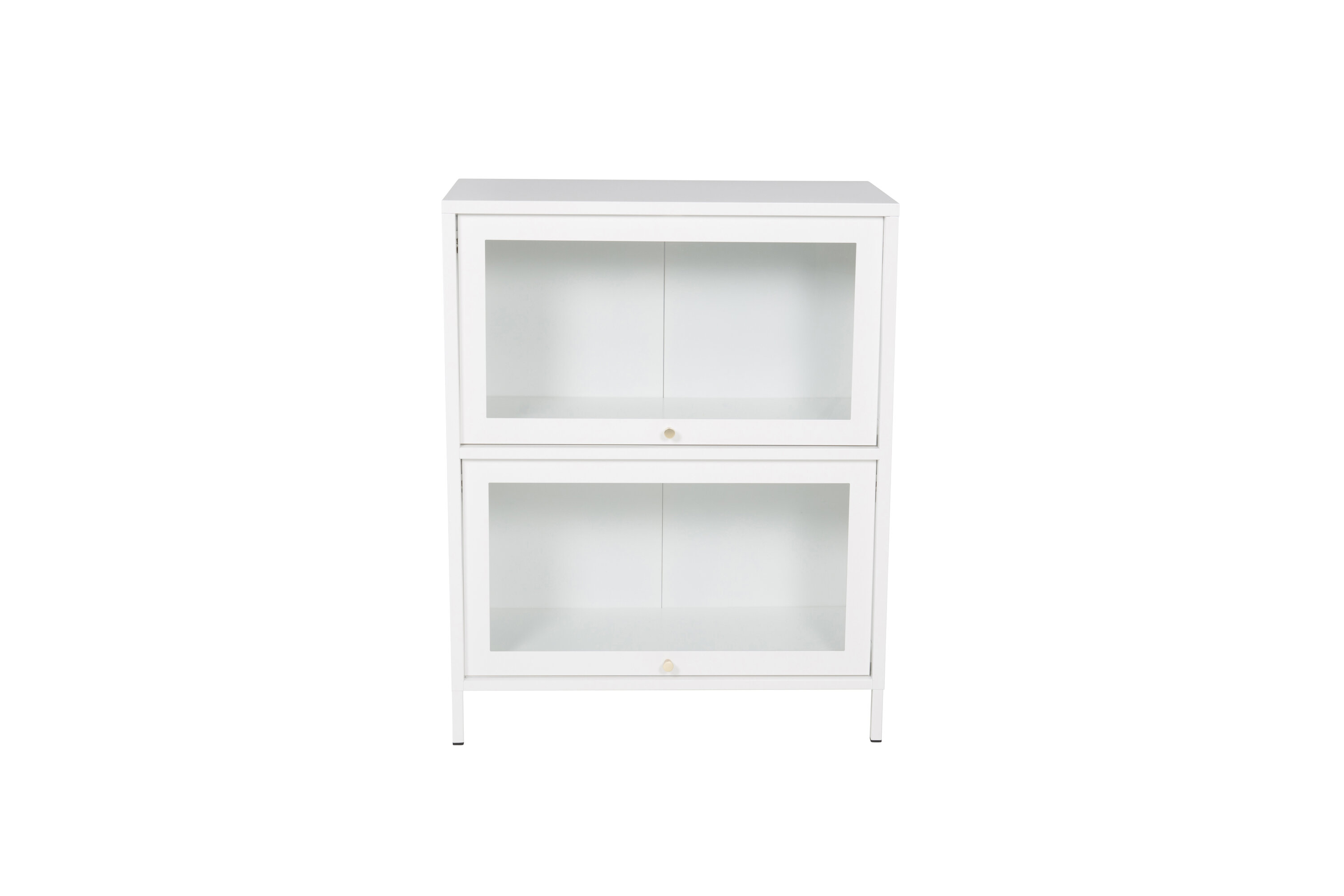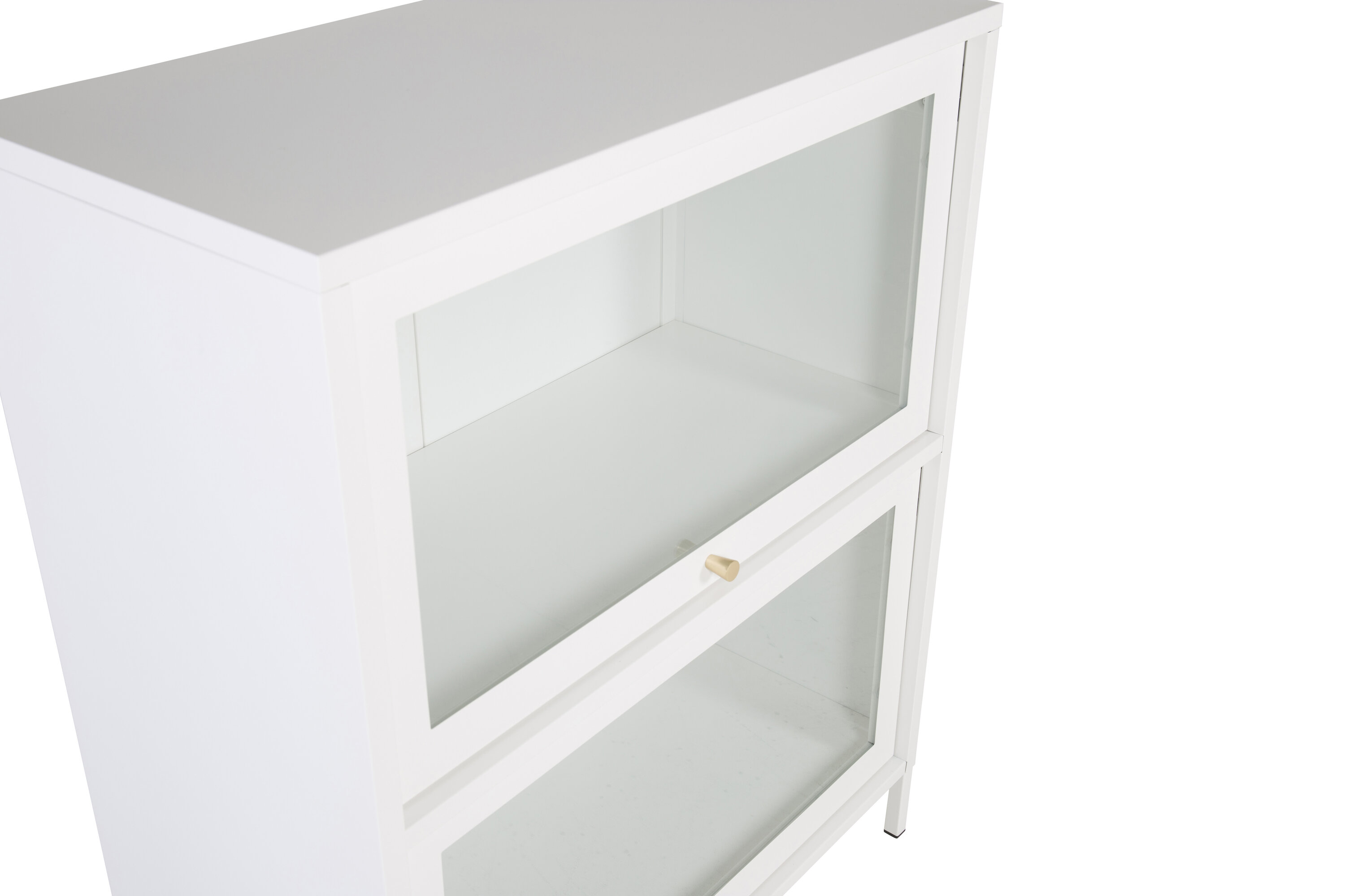 Baktal, dans un design industriel moderne en acier blanc revêtu de poudre avec deux portes en verre. Un cadre en acier blanc revêtu de poudre et des bourgeons de couleur laiton. Les portes vitrées s'ouvrent vers le haut. Le présentoir repose sur quatre pieds en acier blanc thermolaqué. Dimensions : Longueur : 80 cm, largeur : 40 cm, hauteur : 100 cm. Un assemblage plus léger est requis.