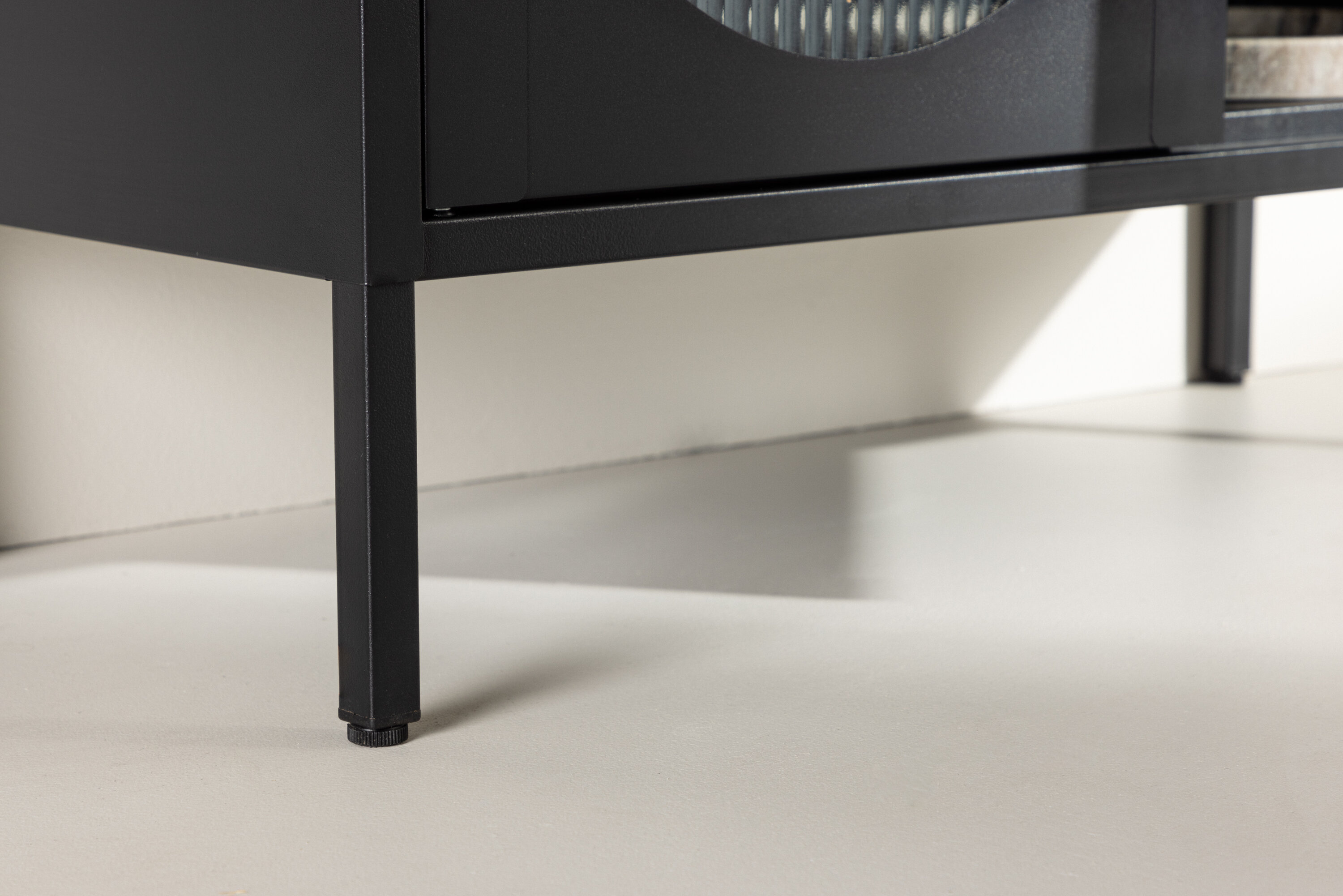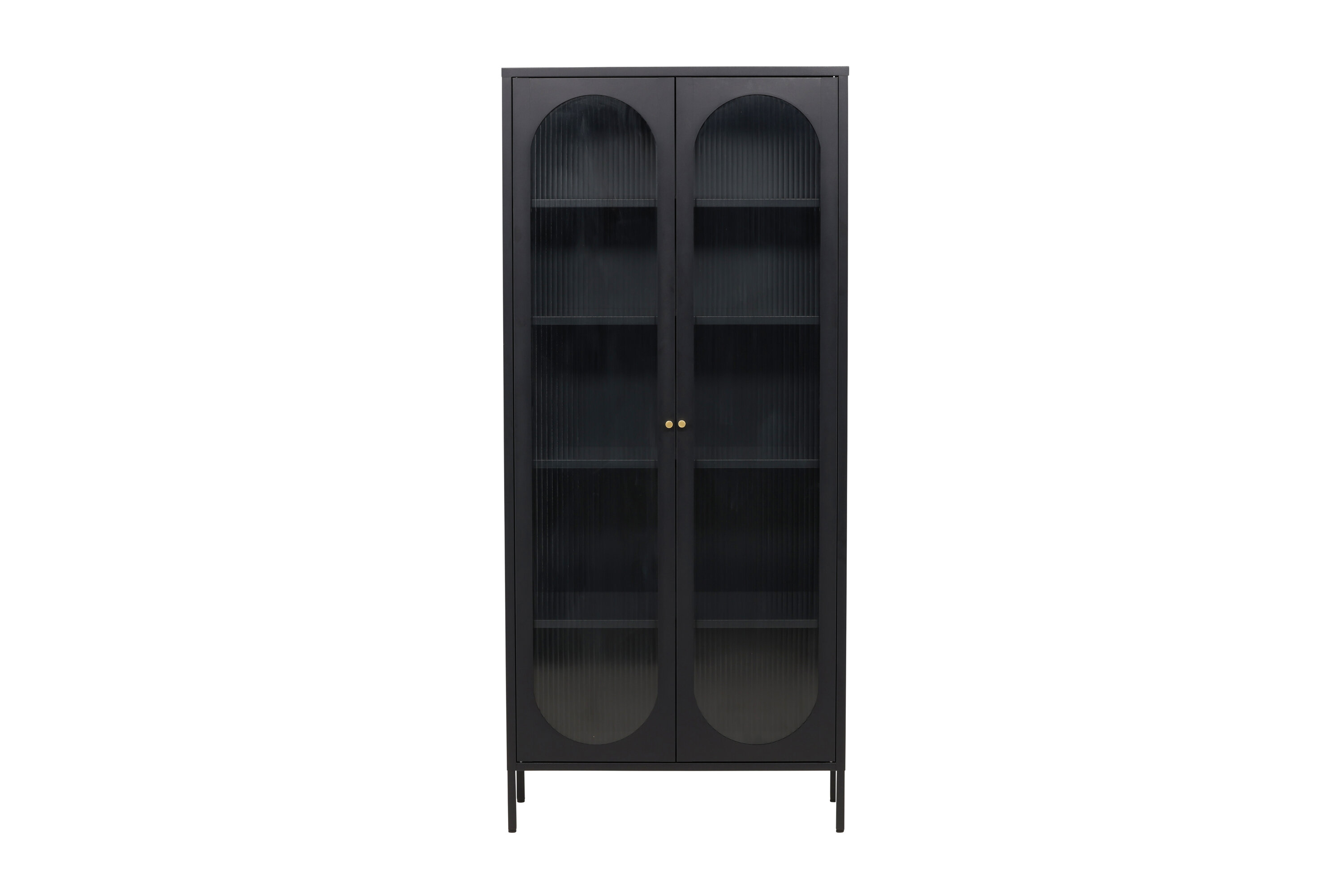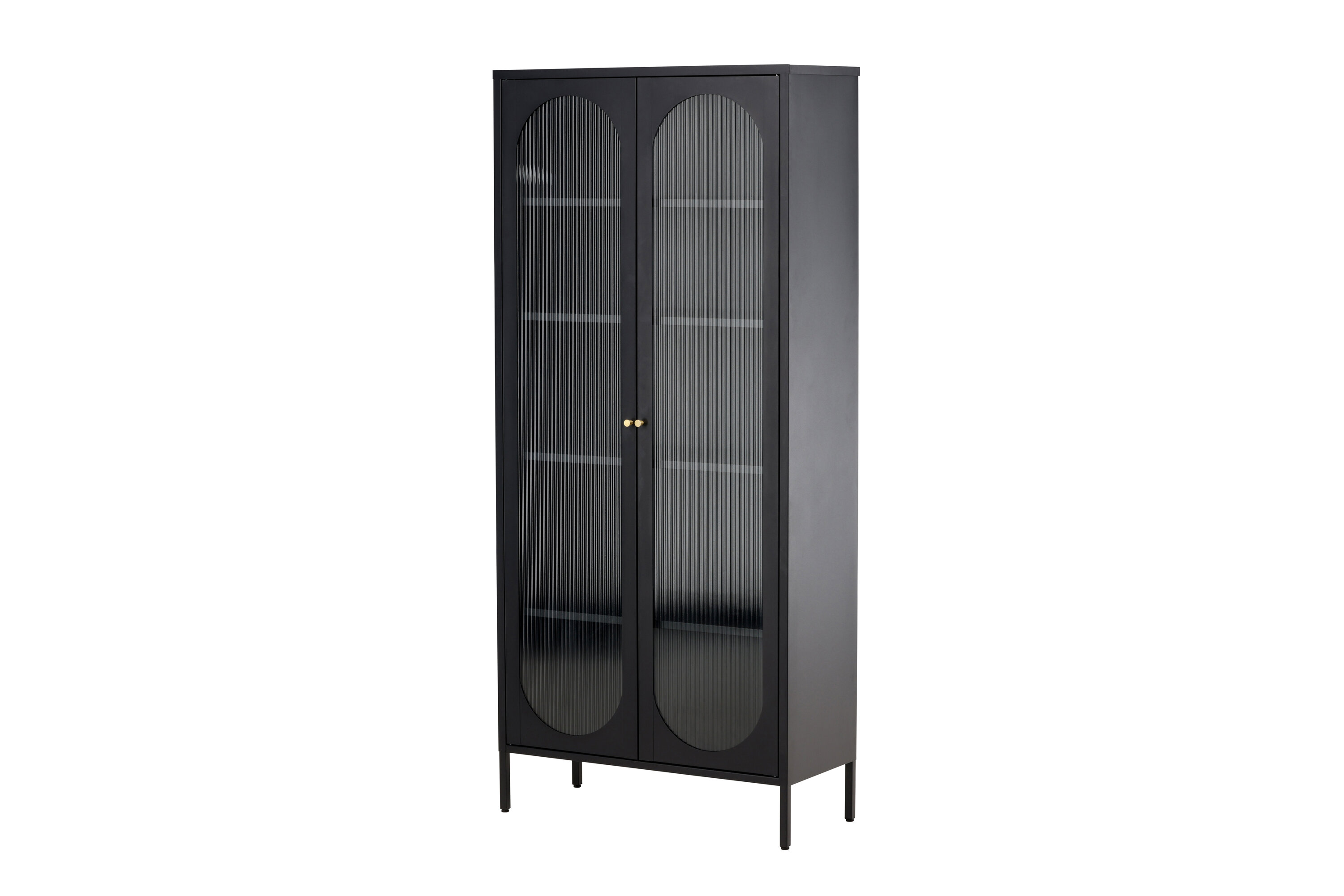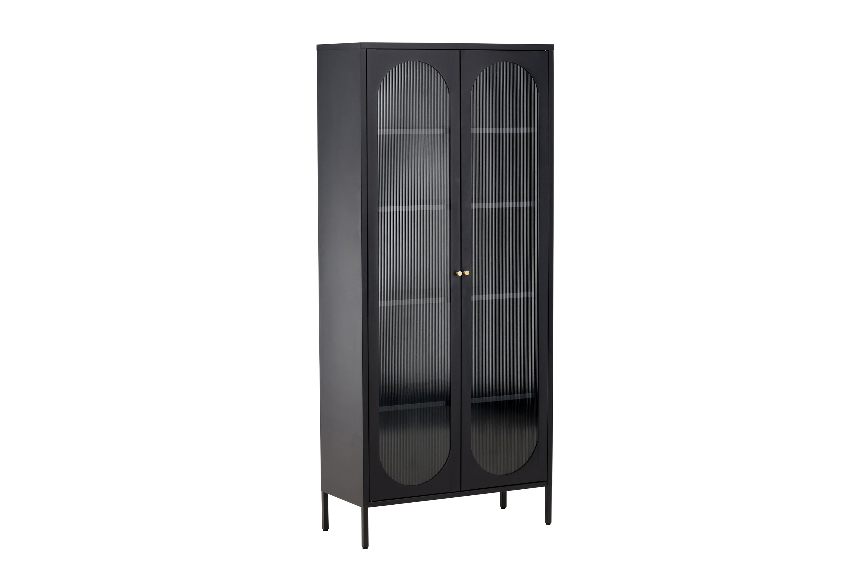 Lima est une élégante armoire noire en acier, ce qui lui confère une construction robuste et durable. Son design moderne et minimaliste sera un ajout de bon goût à votre maison. L'armoire dispose de quatre étagères généreuses, offrant beaucoup d'espace pour l'organisation. Les deux portes sont en verre ondulé, ajoutant une dimension visuelle intéressante et une touche de texture au mobilier.