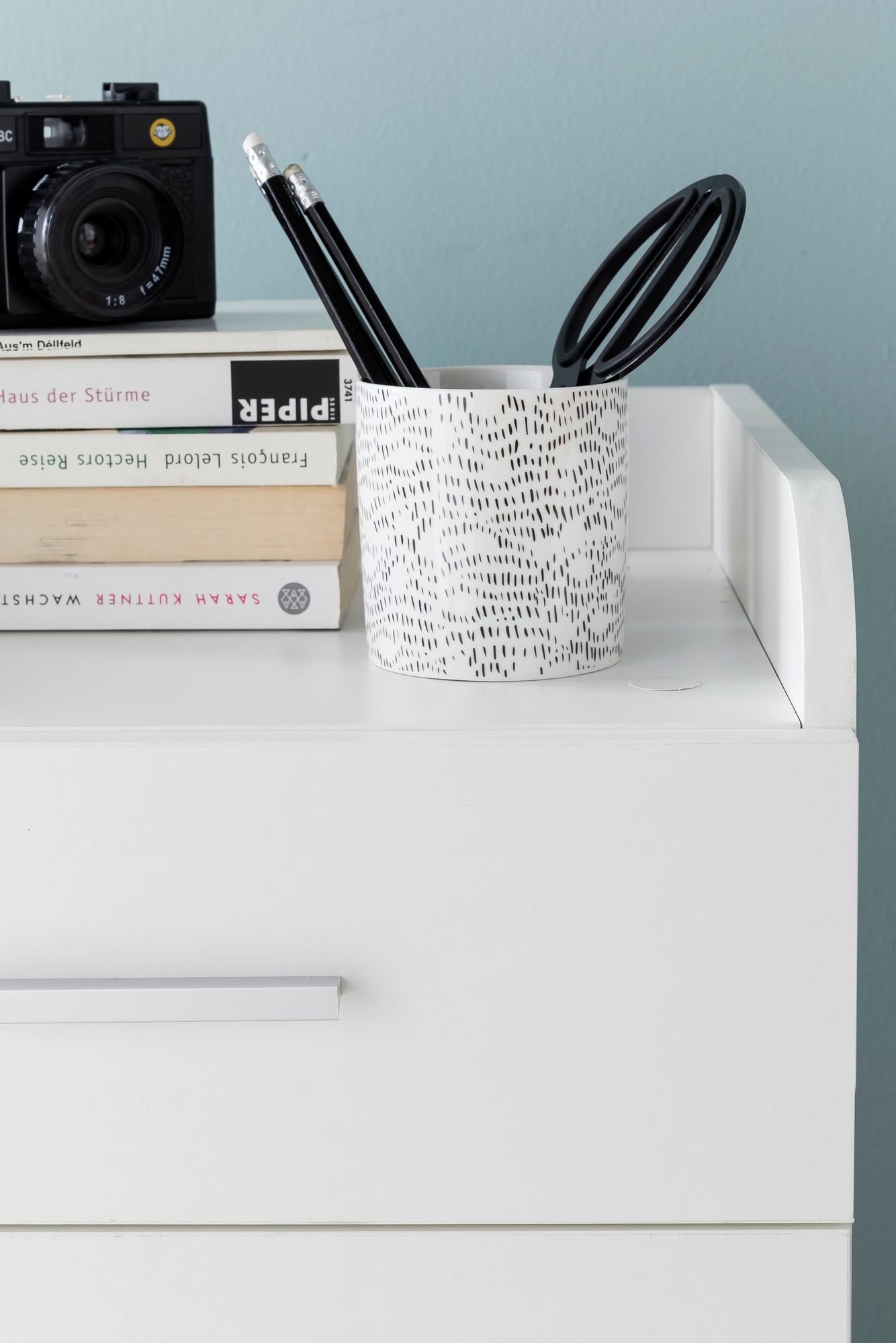 - Couleur : corps blanc mat, roulettes noires