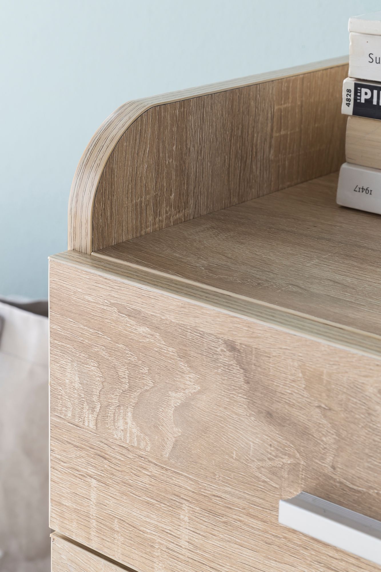 Ce rollcontainer couleur Sonoma présente un design moderne et intemporel avec 4 tiroirs dotés de poignées et une étagère fonctionnelle. Ses roulettes noires assurent une grande mobilité.