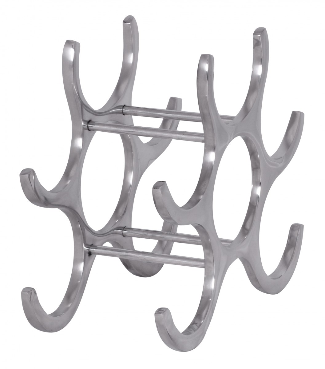Optimisez votre rangement avec ce support à vin design en aluminium argenté, capable d'accueillir jusqu'à 6 bouteilles. Alliant élégance et fonctionnalité, il s'intègre parfaitement dans une cuisine moderne ou une salle à manger.