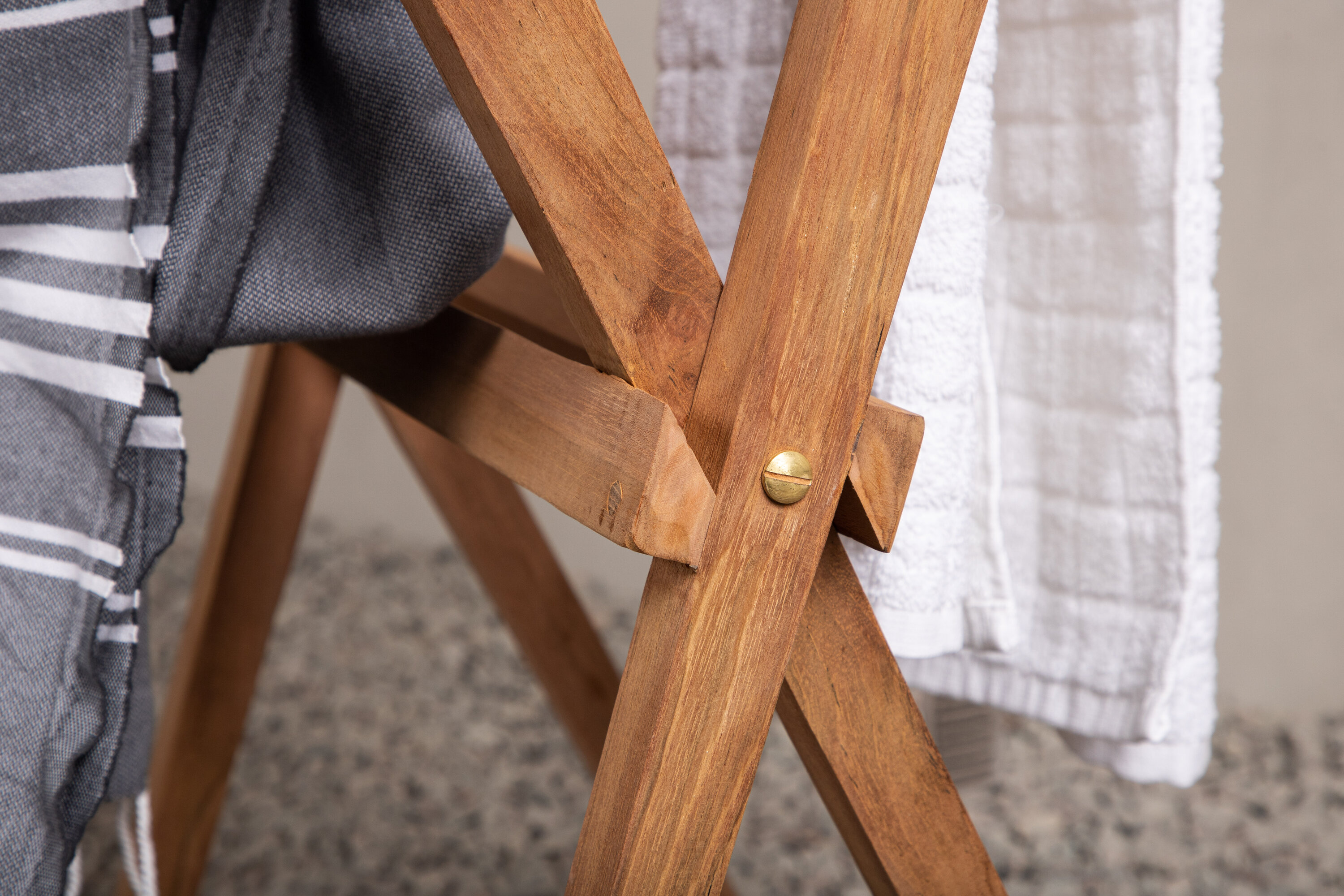 Un cintre moderne et joli en teck qui s'intègre parfaitement comme un joli détail intérieur ou un rangement combiné en accrochant des serviettes ou d'autres textiles. Le cintre est facile à plier et à ranger et s'adapte à tous les types de maisons.