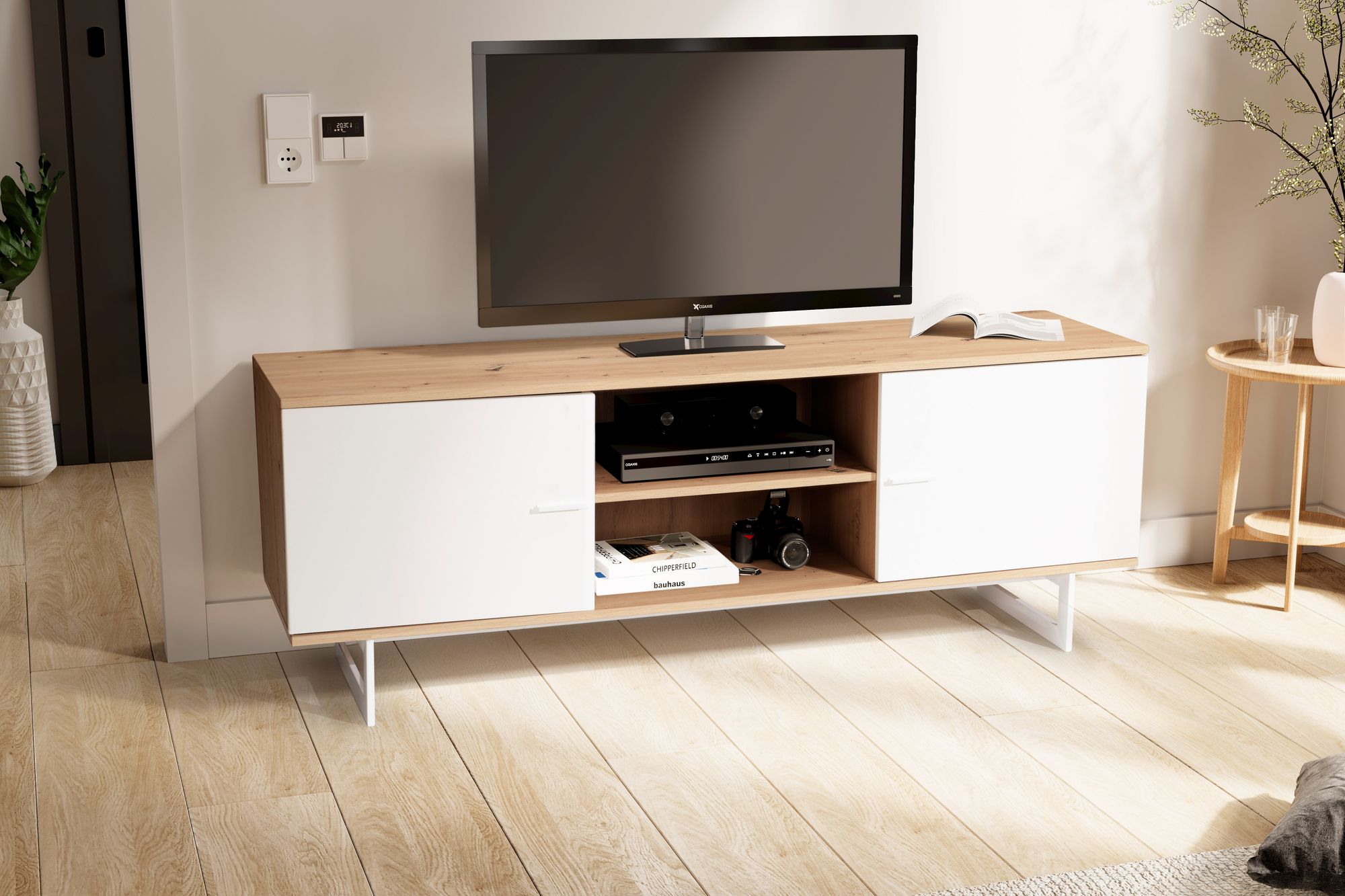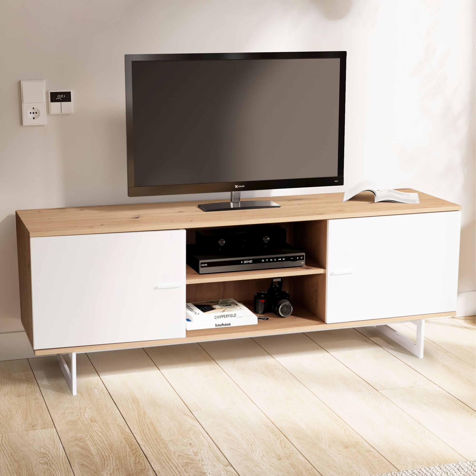 Lowboard décor chêne blanc | 150x55x40 cm | Meuble TV moderne avec deux portes