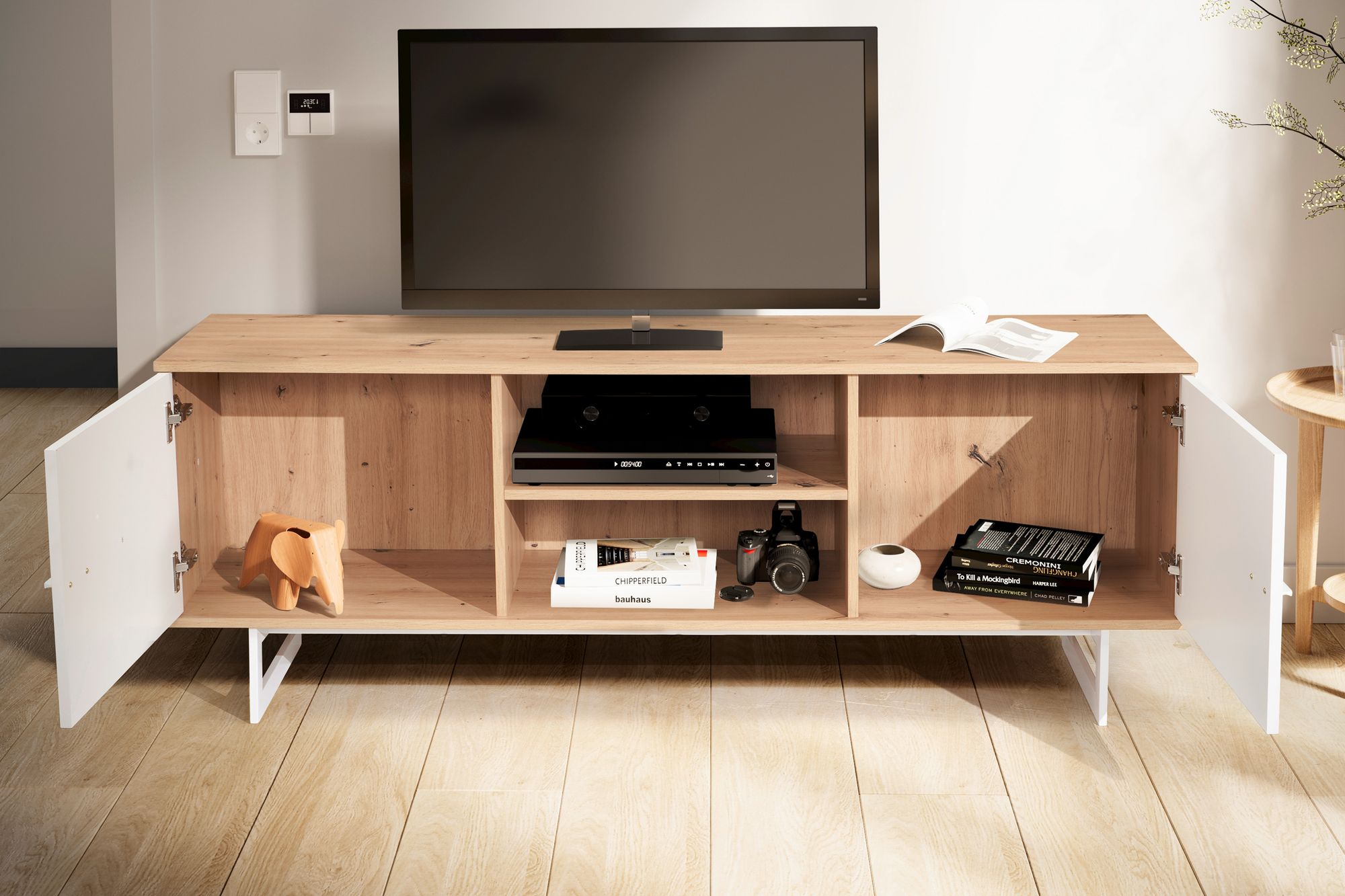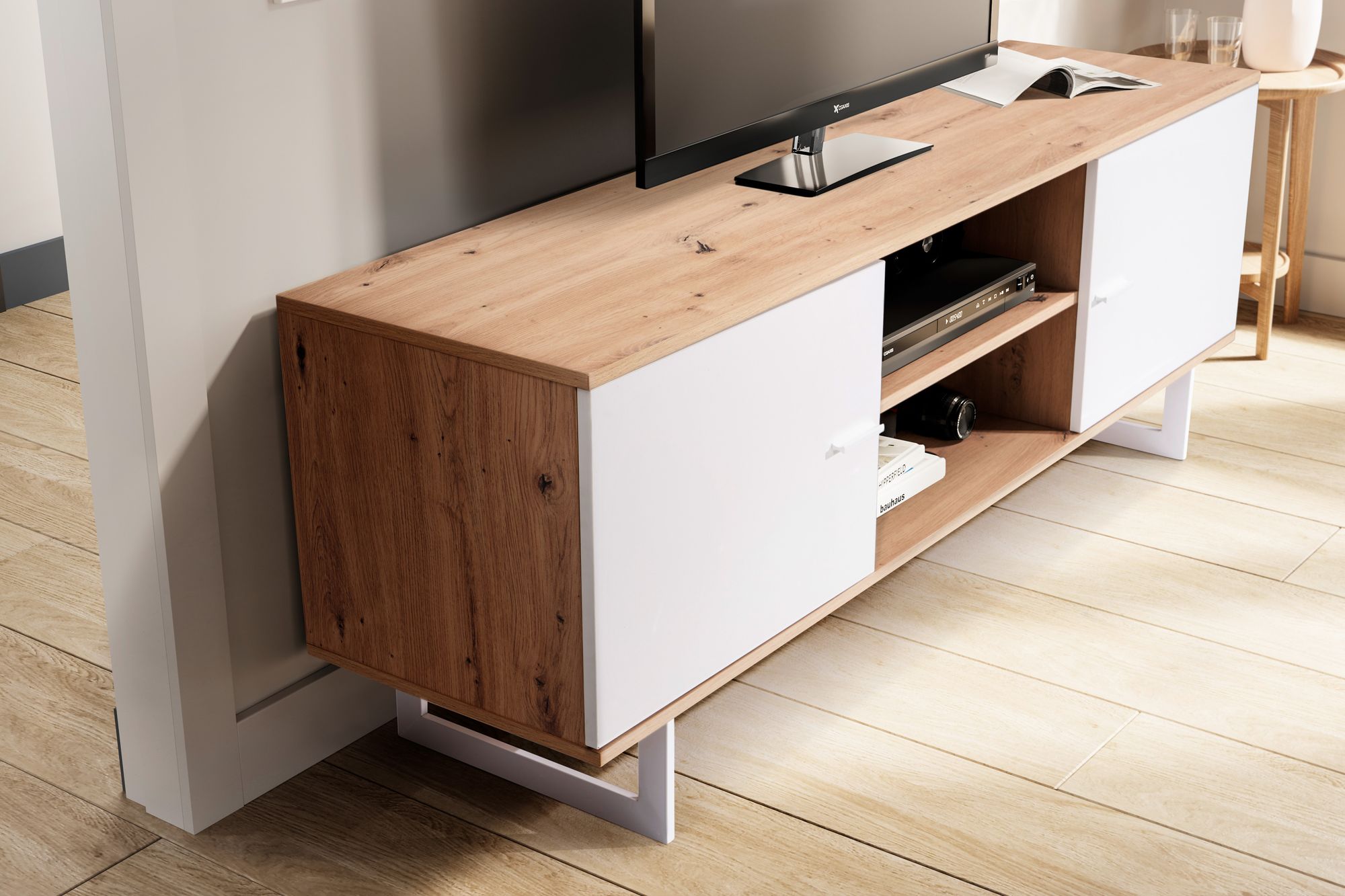 Meuble TV moderne alliant un décor chêne clair et des portes, poignées et pieds blancs pour un style lumineux et épuré. Sa surface généreuse supporte des téléviseurs jusqu'à 70 pouces, avec un rangement optimisé par deux portes fermées et deux étagères ouvertes pour consoles, DVD et appareils multimédia.