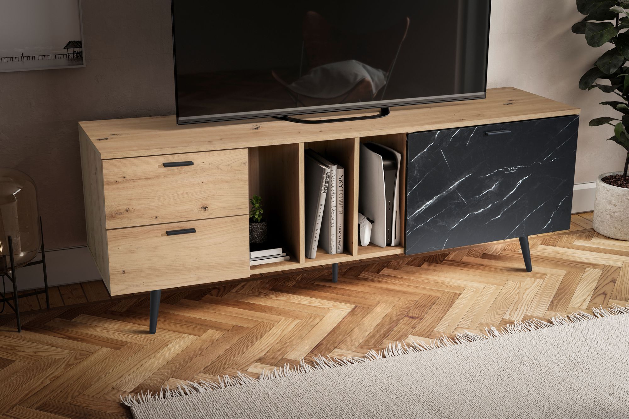 Lowboard moderne avec décor chêne et porte effet marbre noir, apportant une touche luxueuse et contemporaine à votre salon. Conçu pour accueillir un téléviseur jusqu'à 70 pouces, son design fonctionnel intègre portes et tiroirs pour ranger consoles, DVDs, livres et objets décoratifs.