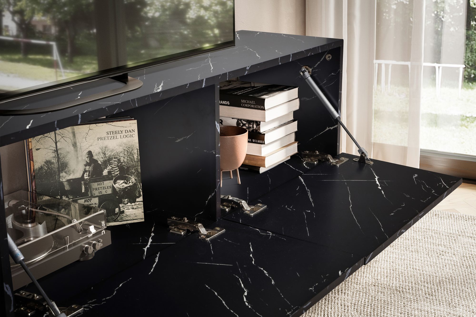 Ce lowboard suspendu en aspect marbre noir apporte un style contemporain et sophistiqué. Sa structure en MDF avec revêtement mélaminé offre robustesse et facilité d'entretien tout en supportant un téléviseur jusqu'à 70 pouces.