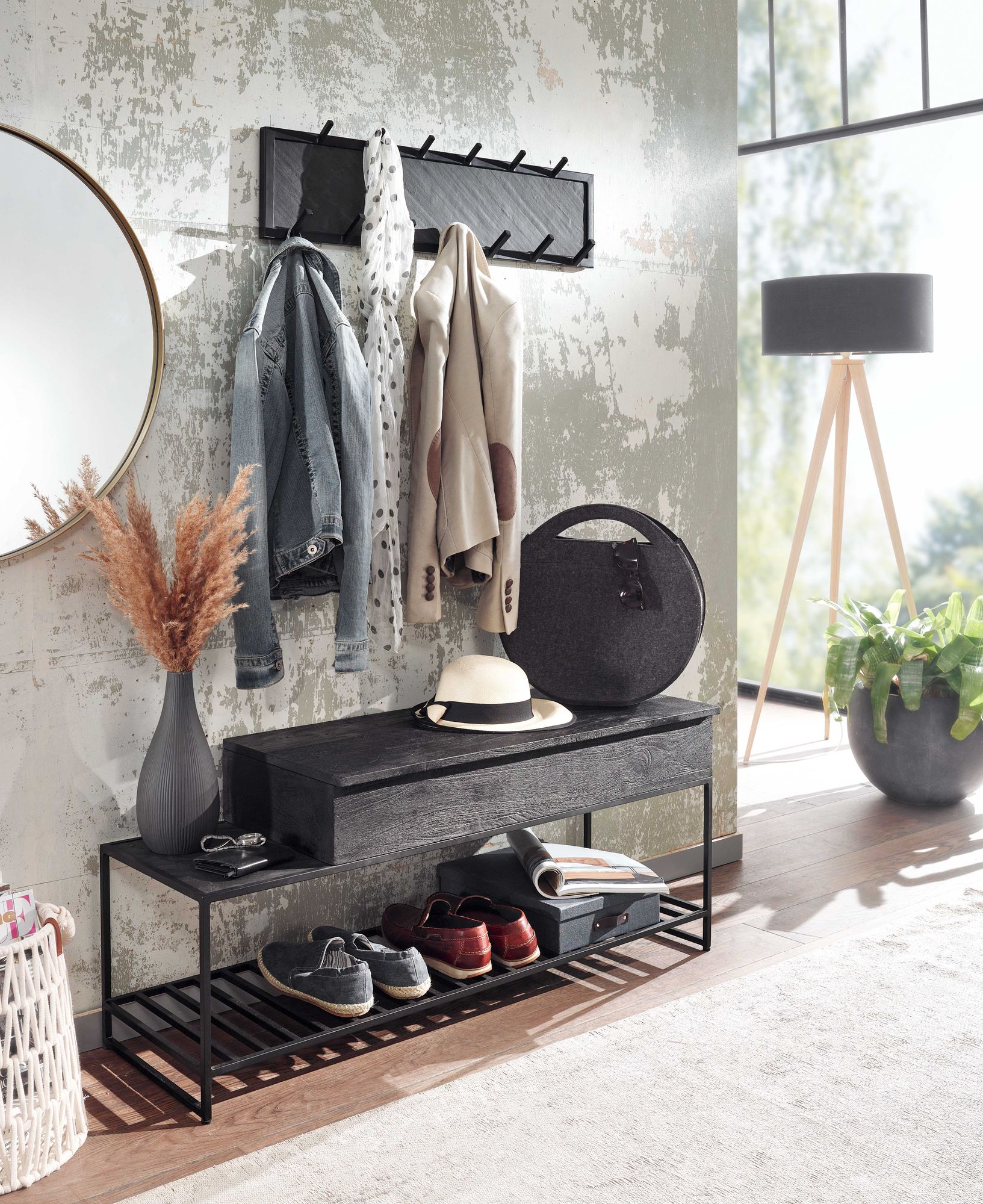 Banc d'entrée avec patère murale Bois massif de manguier Noir | 110x48,5x37 cm | Style industriel