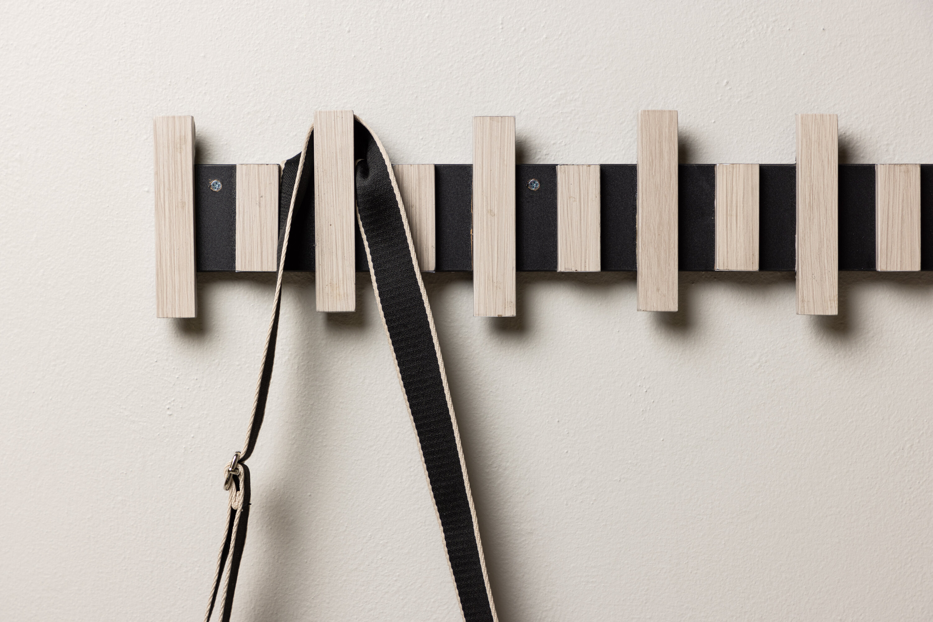 Ce cintre intelligent est fixé au mur sur un rail métallique noir qui supporte plusieurs cintres en MDF plâtré blanc. Tout aussi intelligent et élégant, tout simplement avec un design discret qui supporte tout ce que vous souhaitez accrocher dans le couloir.