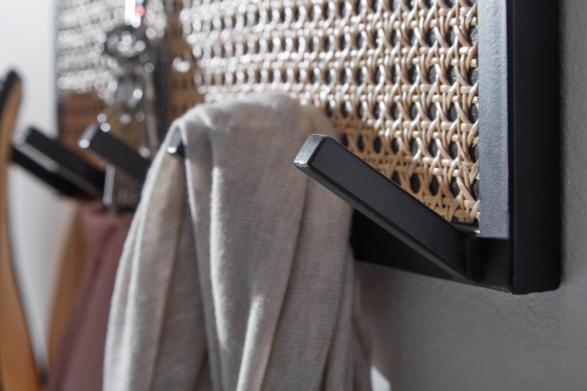 Apportez une touche naturelle et fonctionnelle à votre entrée avec cette porte-manteau murale en bois massif de manguier, rotin et métal noir.