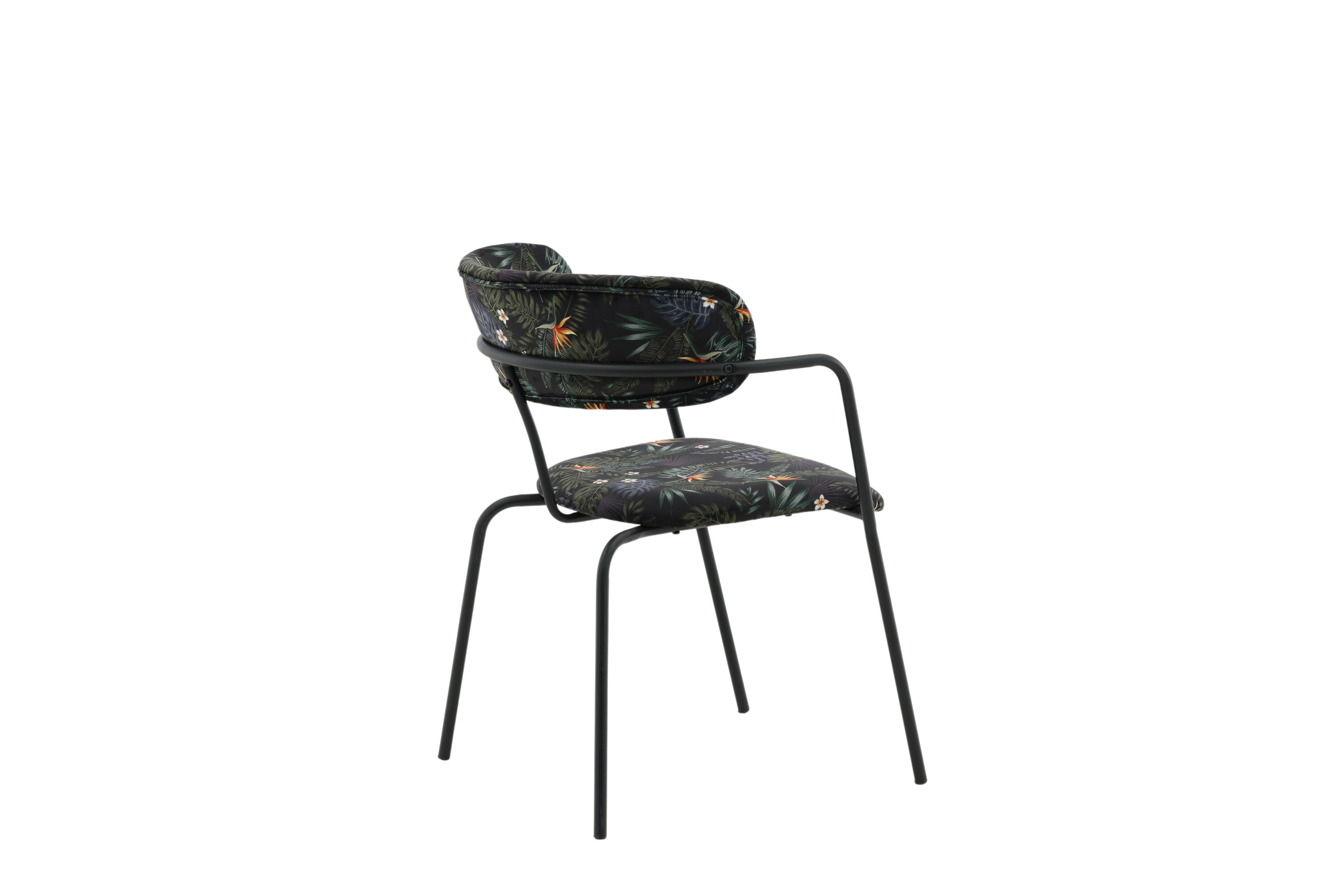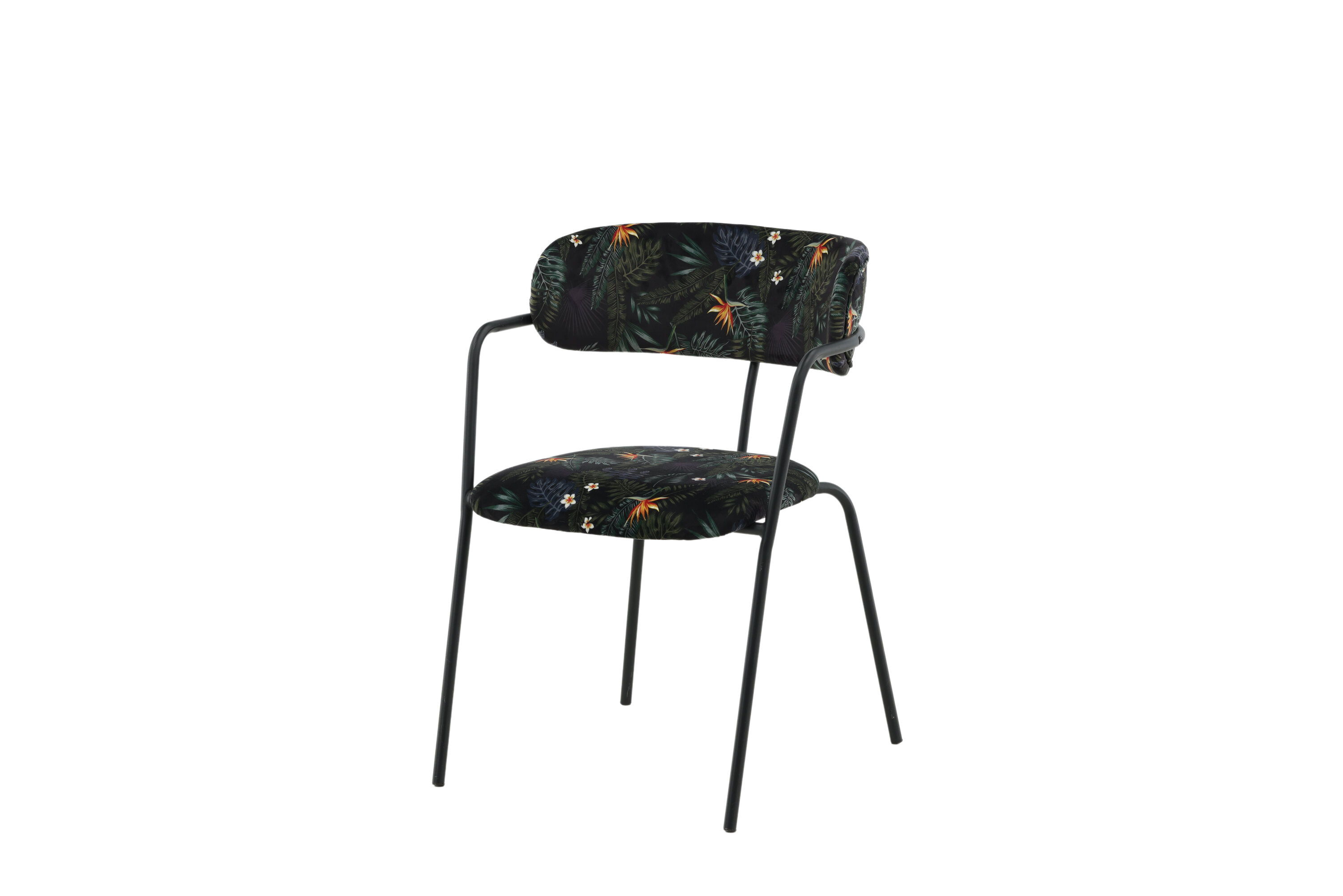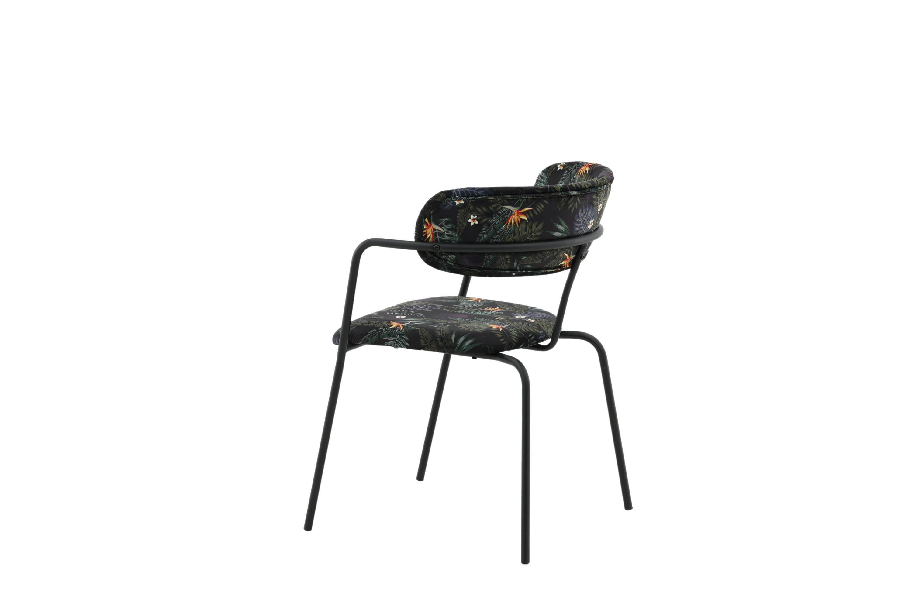 Créez un point focal remarquable avec des chaises de salle à manger multicolores de la série Arrow ! Cette chaise de salle à manger est dotée de pieds et d'accoudoirs intégrés en métal noir thermolaqué et d'un design élégant avec un dos incurvé. Dossier et assise en tissu polyester rembourré noir à motif floral qui crée une impression personnelle à l'intérieur. Un certain montage est nécessaire.